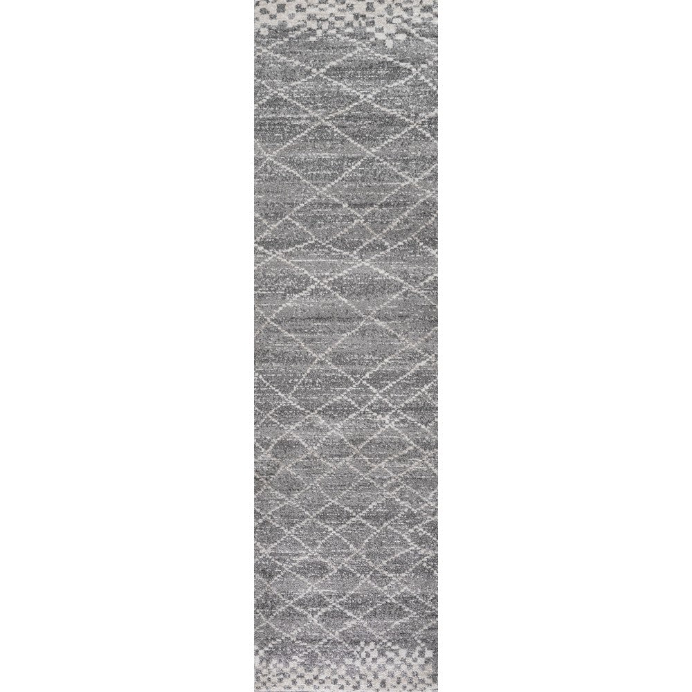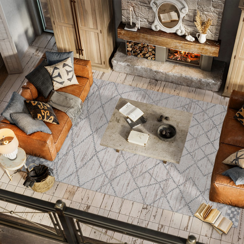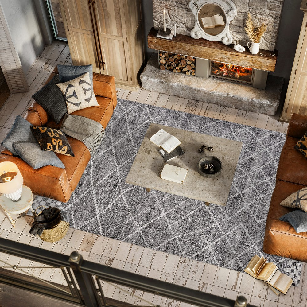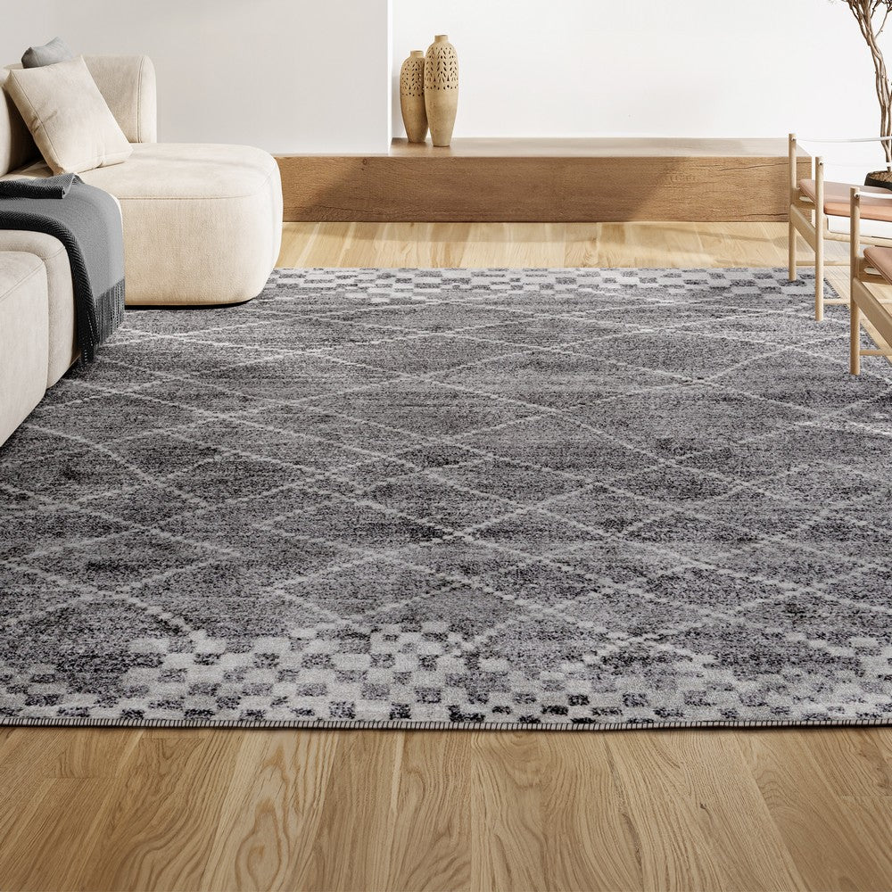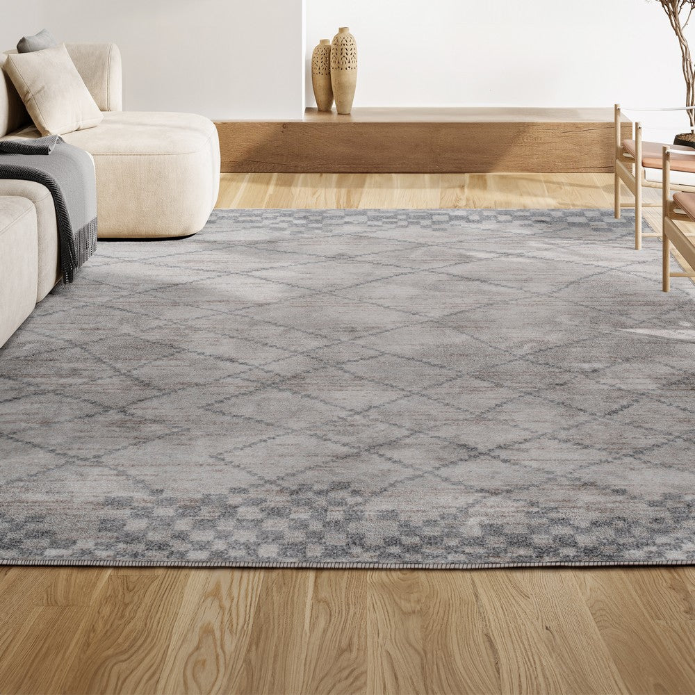 Inspired by vintage Moroccan rugs, our modern geometric rug is ideal for a minimalist interior. The random diamond pattern is woven in ivory on a gray background, and bordered with offset squares. Mingled threads create an understated, vintage look. Add some Bohemian style to your living room, bedroom or entry with this easy-care rug.