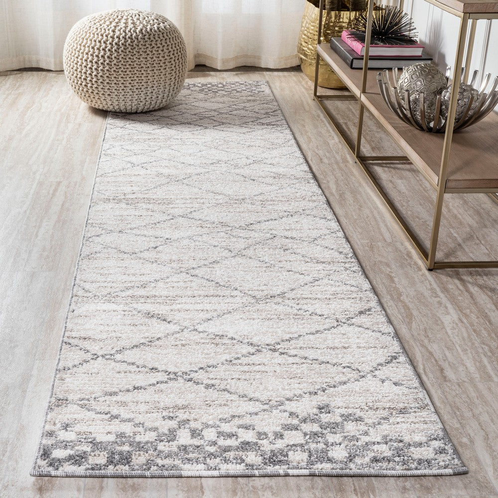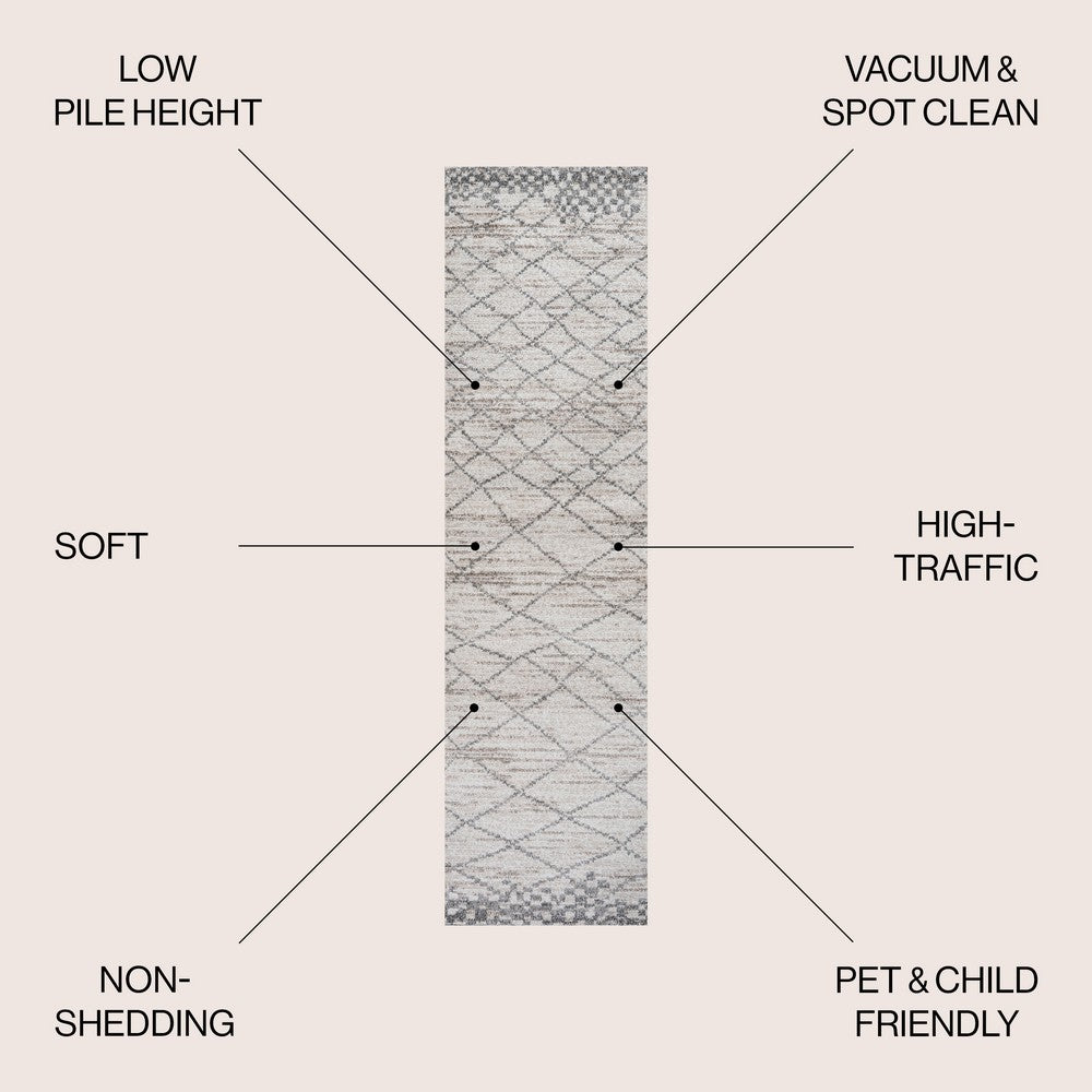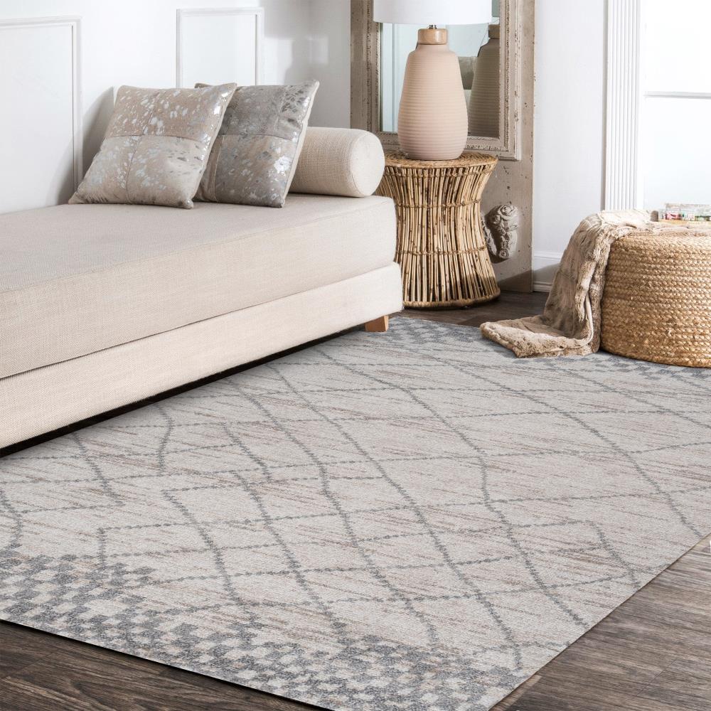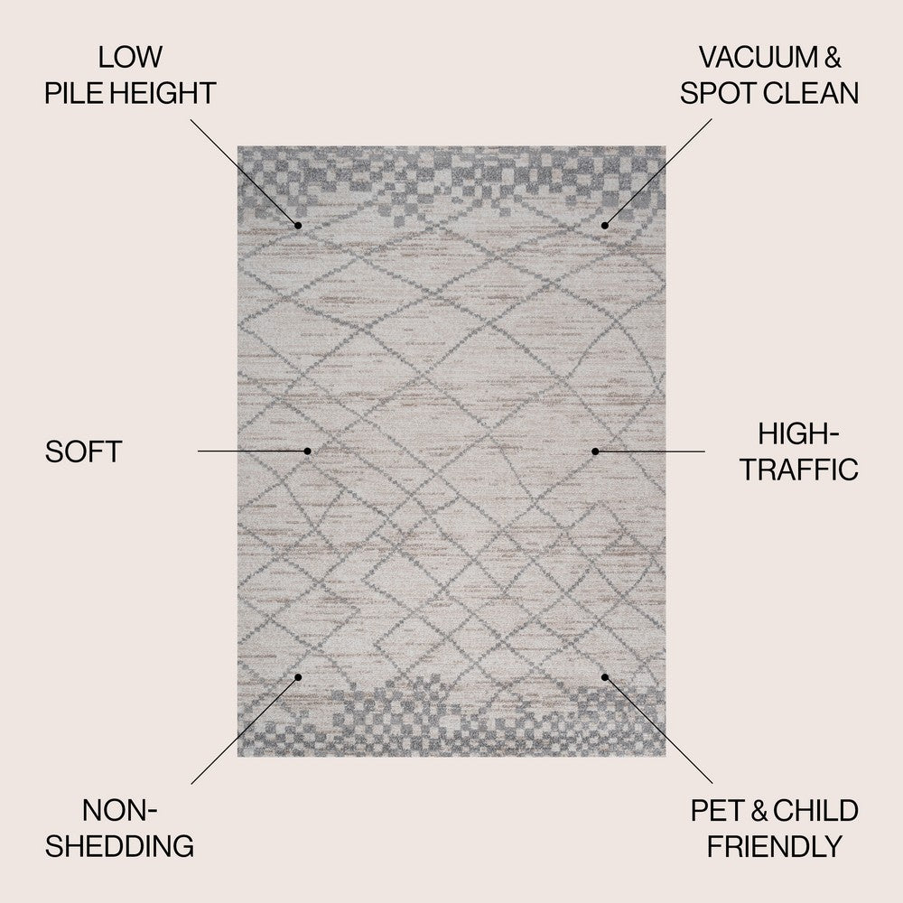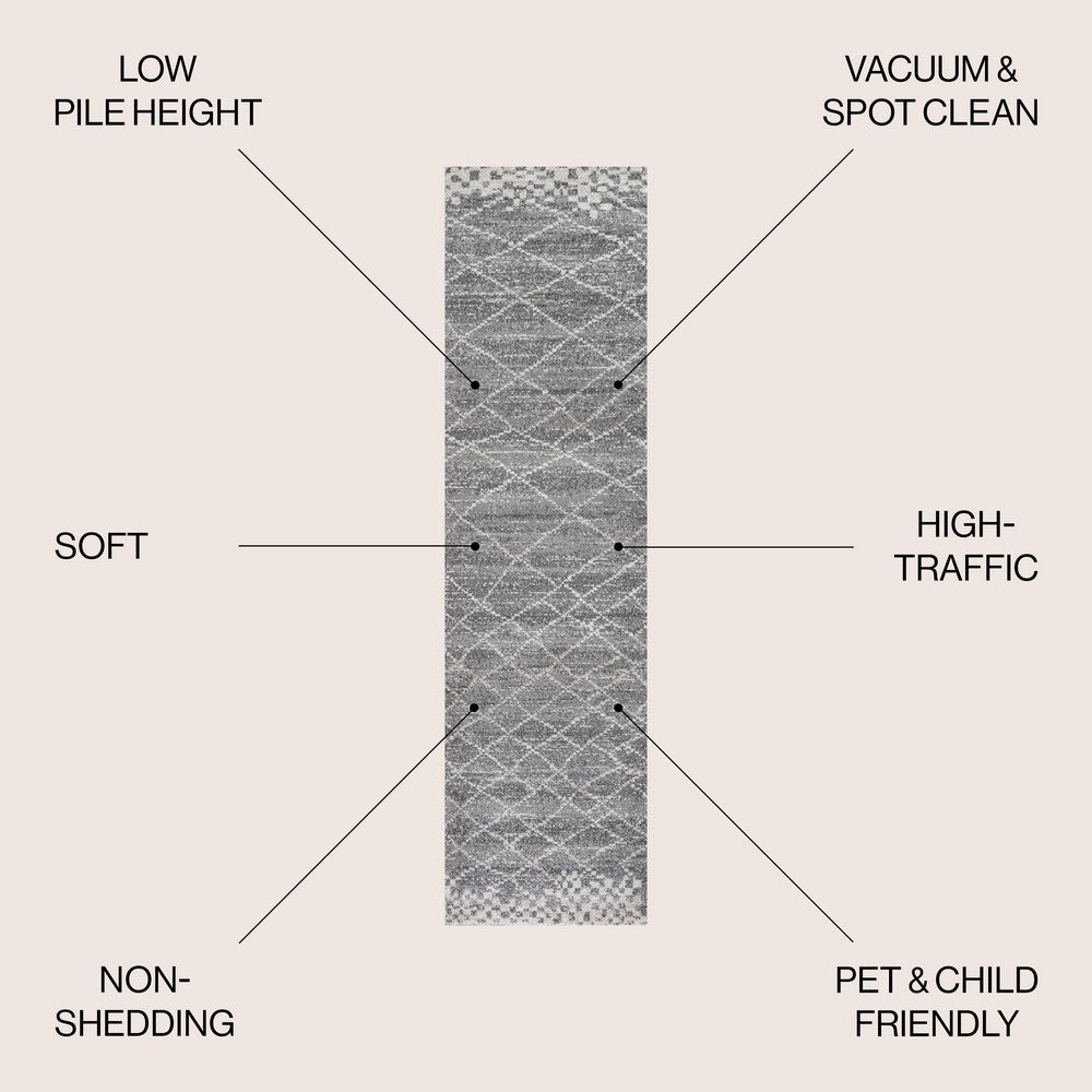 Inspired by vintage Moroccan rugs, our modern geometric rug is ideal for a minimalist interior. The random diamond pattern is woven in ivory on a gray background, and bordered with offset squares. Mingled threads create an understated, vintage look. Add some Bohemian style to your living room, bedroom or entry with this easy-care rug.