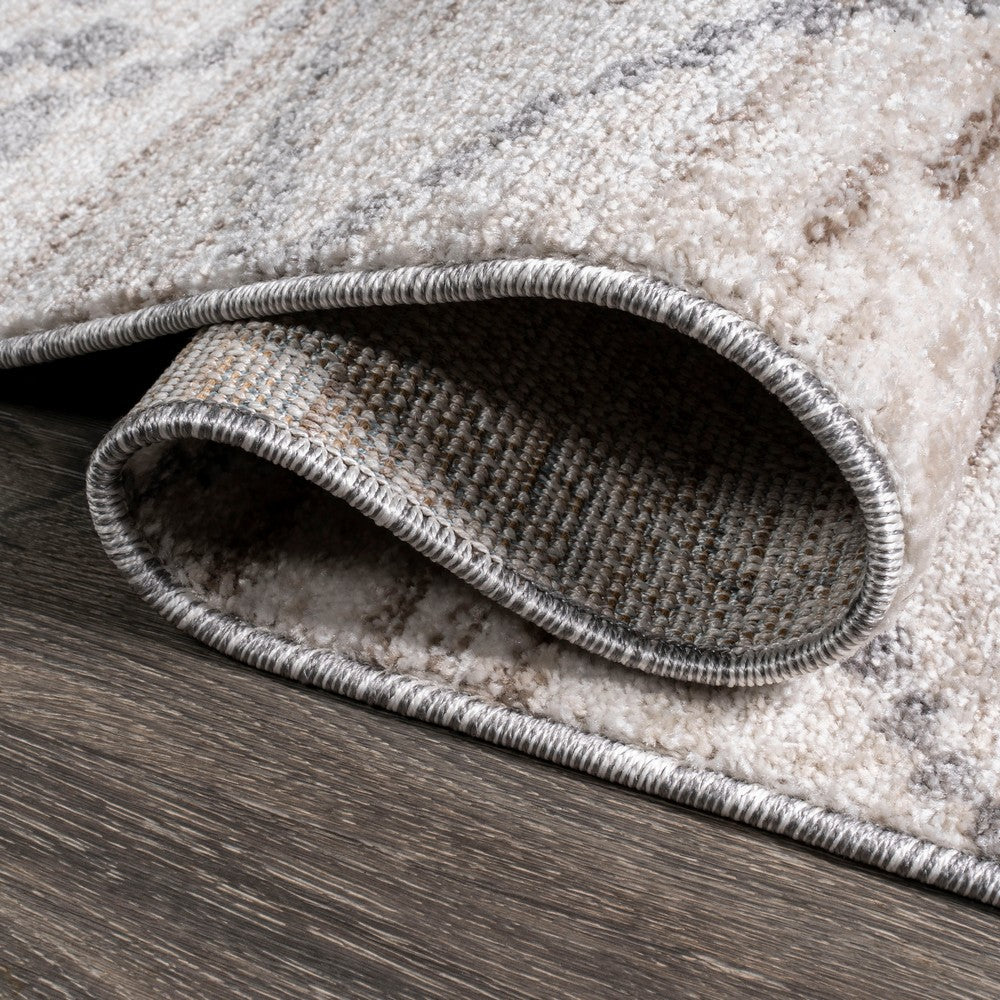 - A mingled weave of medium and light gray fibers in the background give this rug extra dimension; the pattern is woven in ivory
