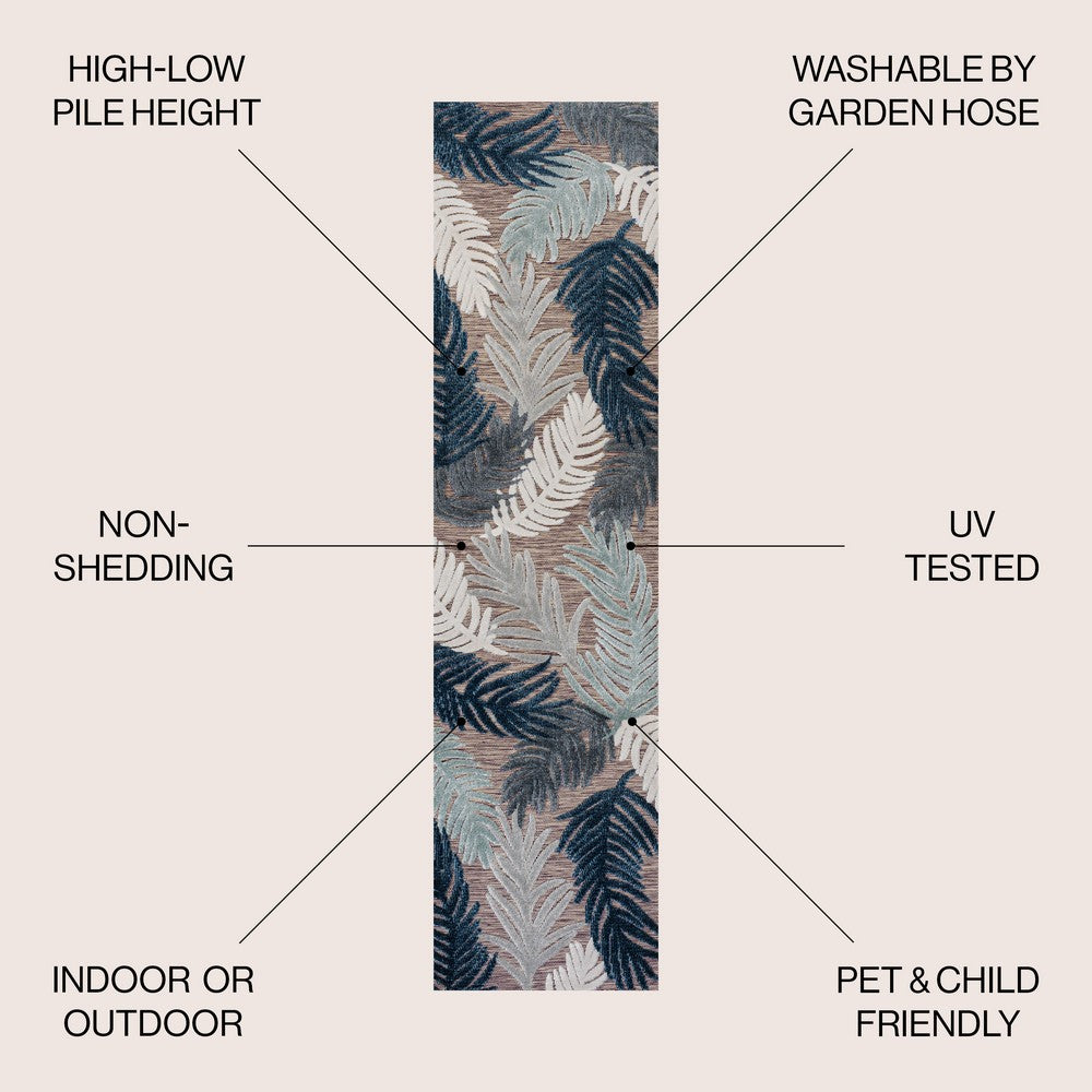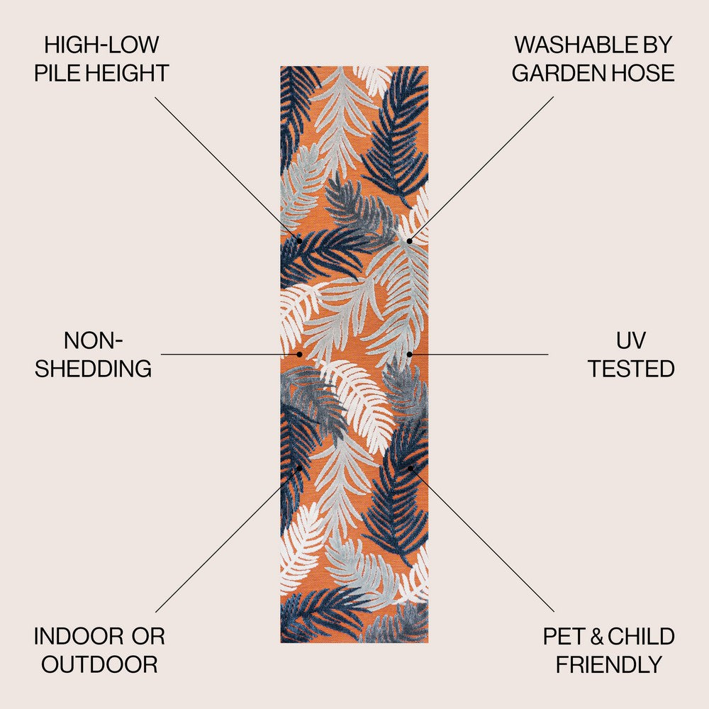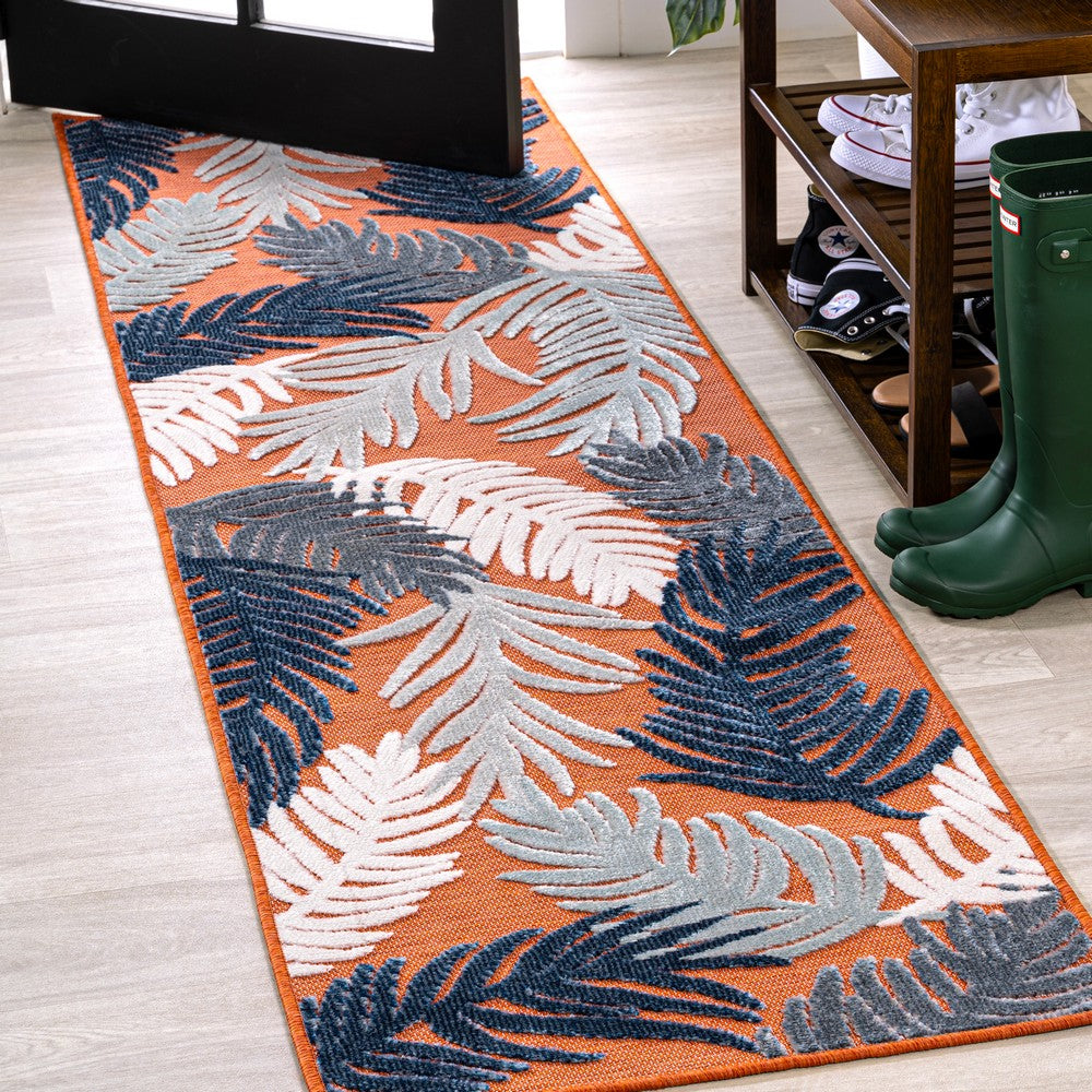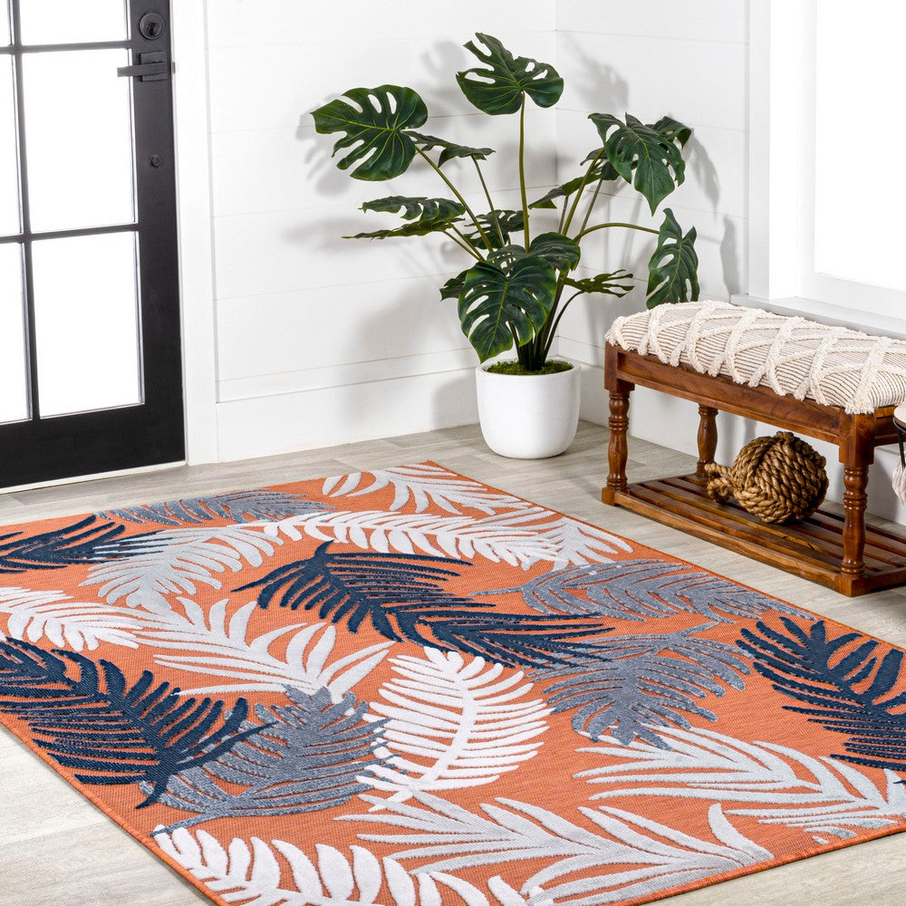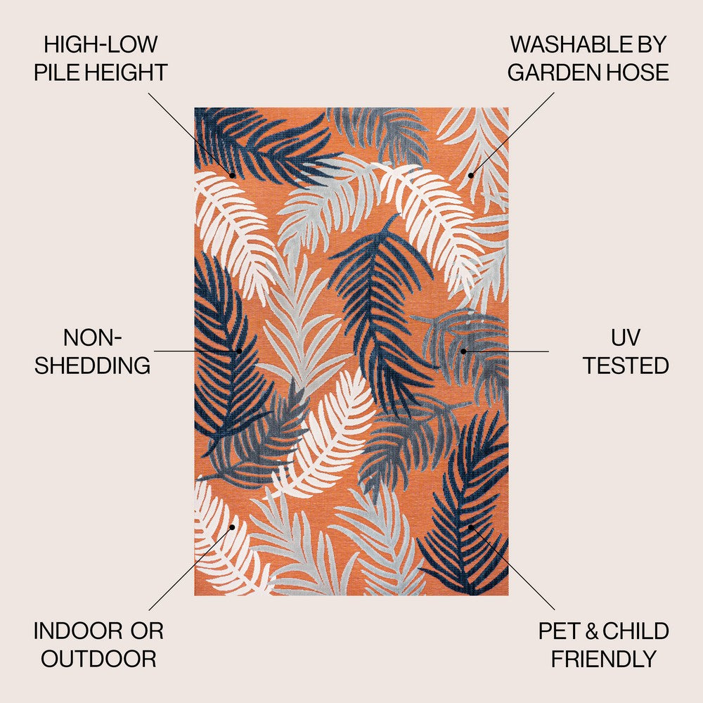 Tropical chic meets jungalow style in our palm leaf rug design. Bold palm fronds in layered shades create an abstract pattern that will liven up your living room, kitchen, bedroom or porch. The pet-friendly and kid-proof low-pile design makes it easy to clean.