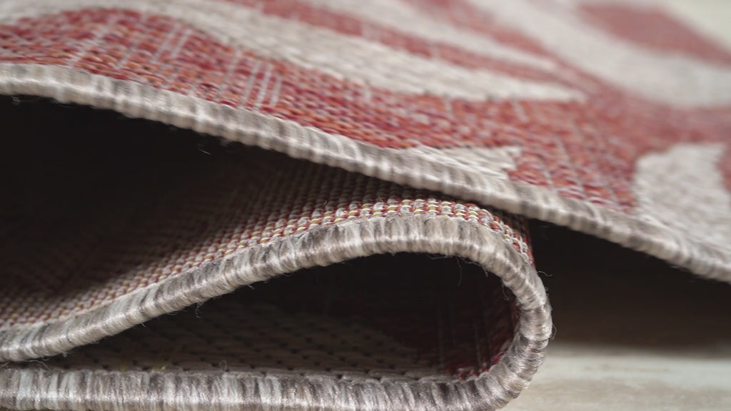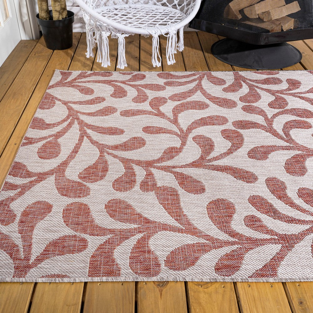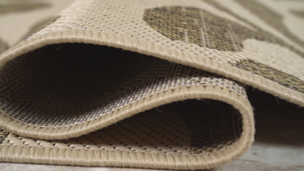A traditional scrolling vine pattern gives this indoor-outdoor rug a classic look that's ideal for porch or patio. Neutral brown and beige tones are ideal for a living room, kitchen, family room, dining room, or bedroom. Soft, durable synthetic fibers are an easy maintenance solution for homes with kids and pets.