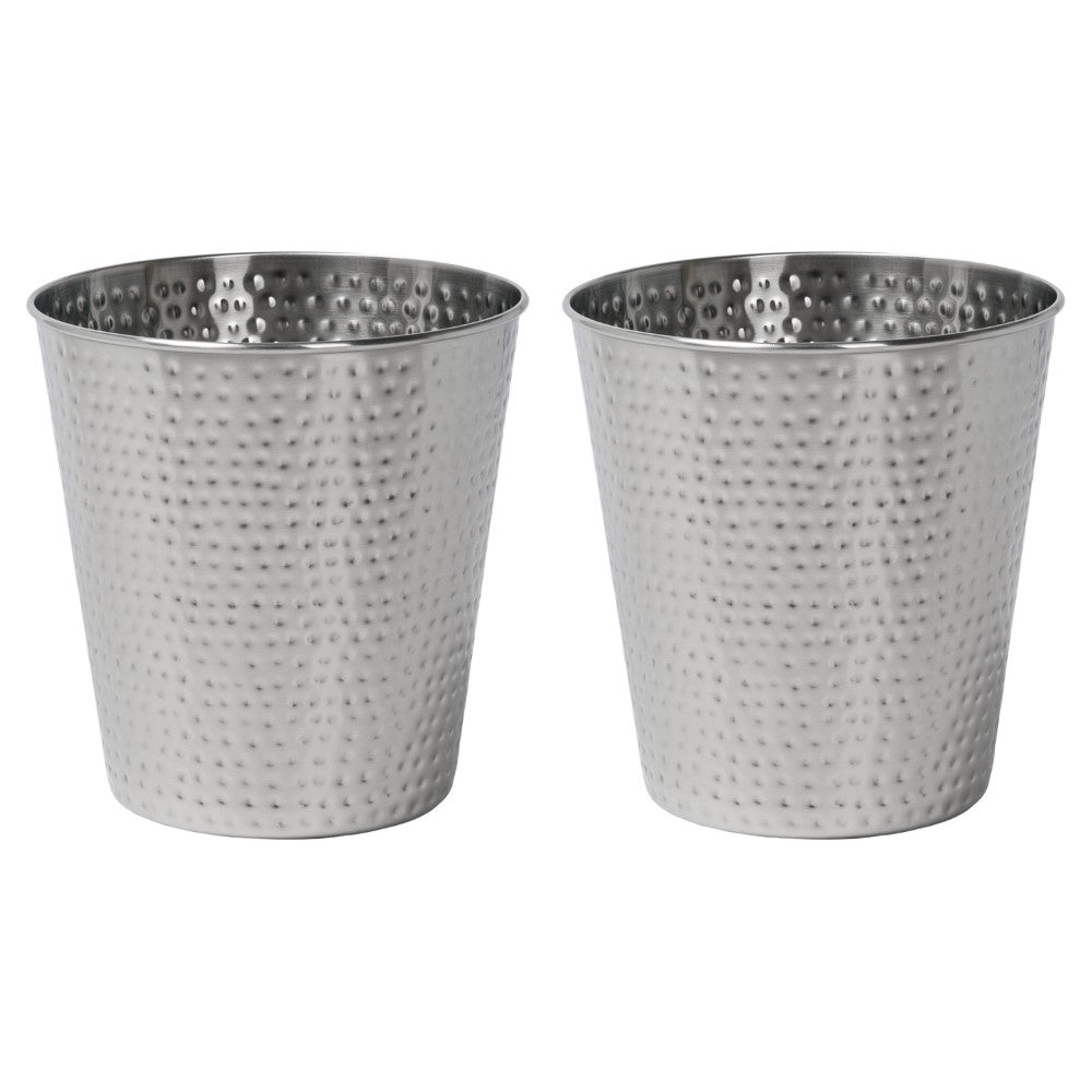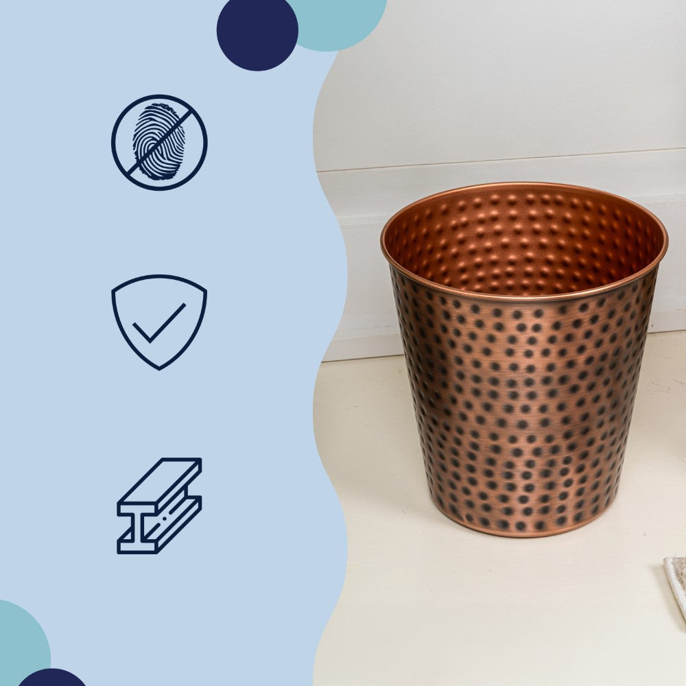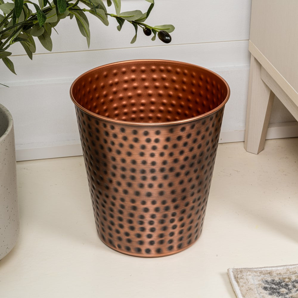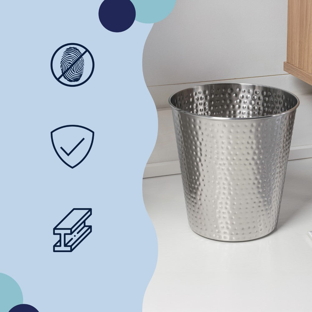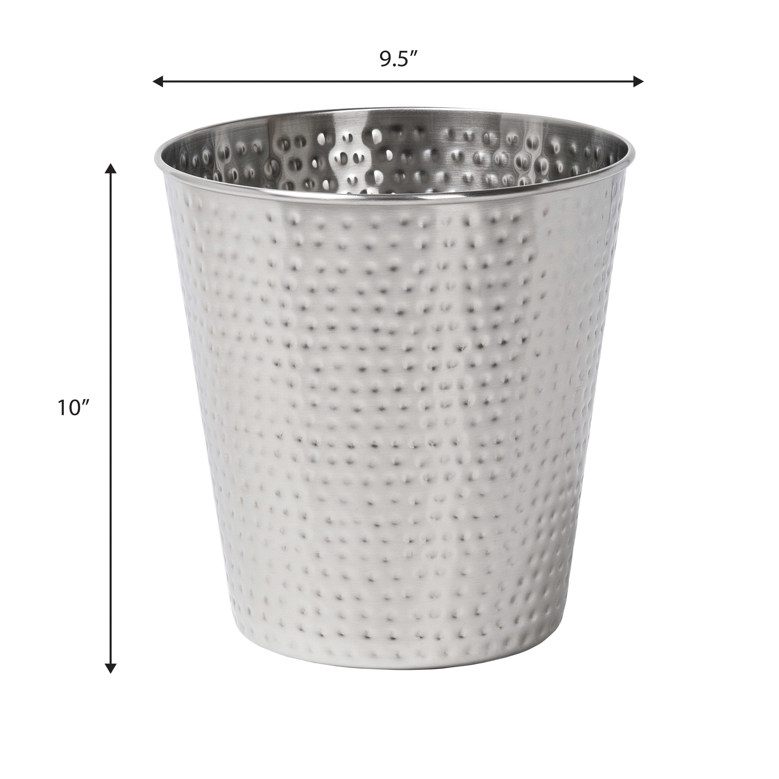 The small size of this minimalist trash can is ideal for the bathroom, bedroom or office. Made from durable steel, it has an all-over hammered texture. Add a modern touch to any space with this stylish trash receptacle.