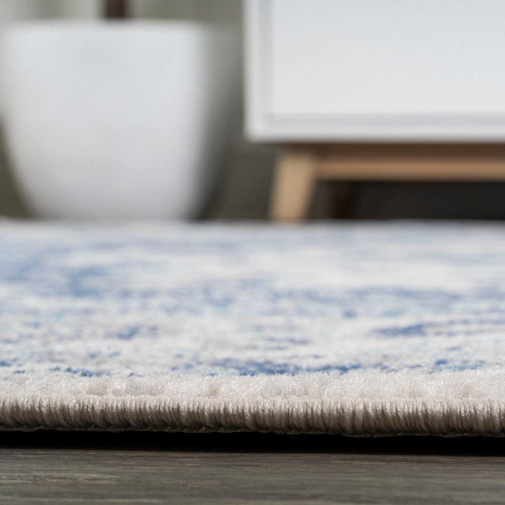 A classic medallion design gets a cottage makeover in French Country blues. The ornate pattern features a central medallion and border, with vines and flowers in an updated palette of dark blue, light blue and gray. Mingled threads create a slightly distressed look. Add a traditional touch to your living room, family room, bedroom, dining room, or home office with this durable, family-friendly rug.