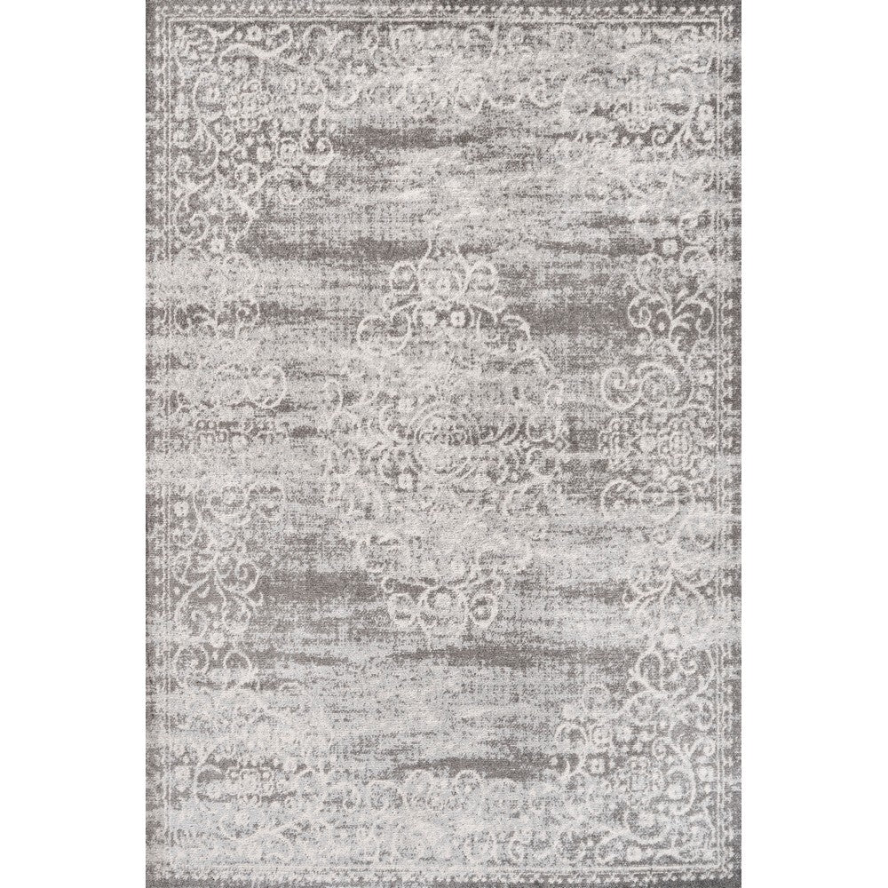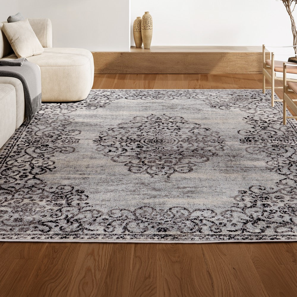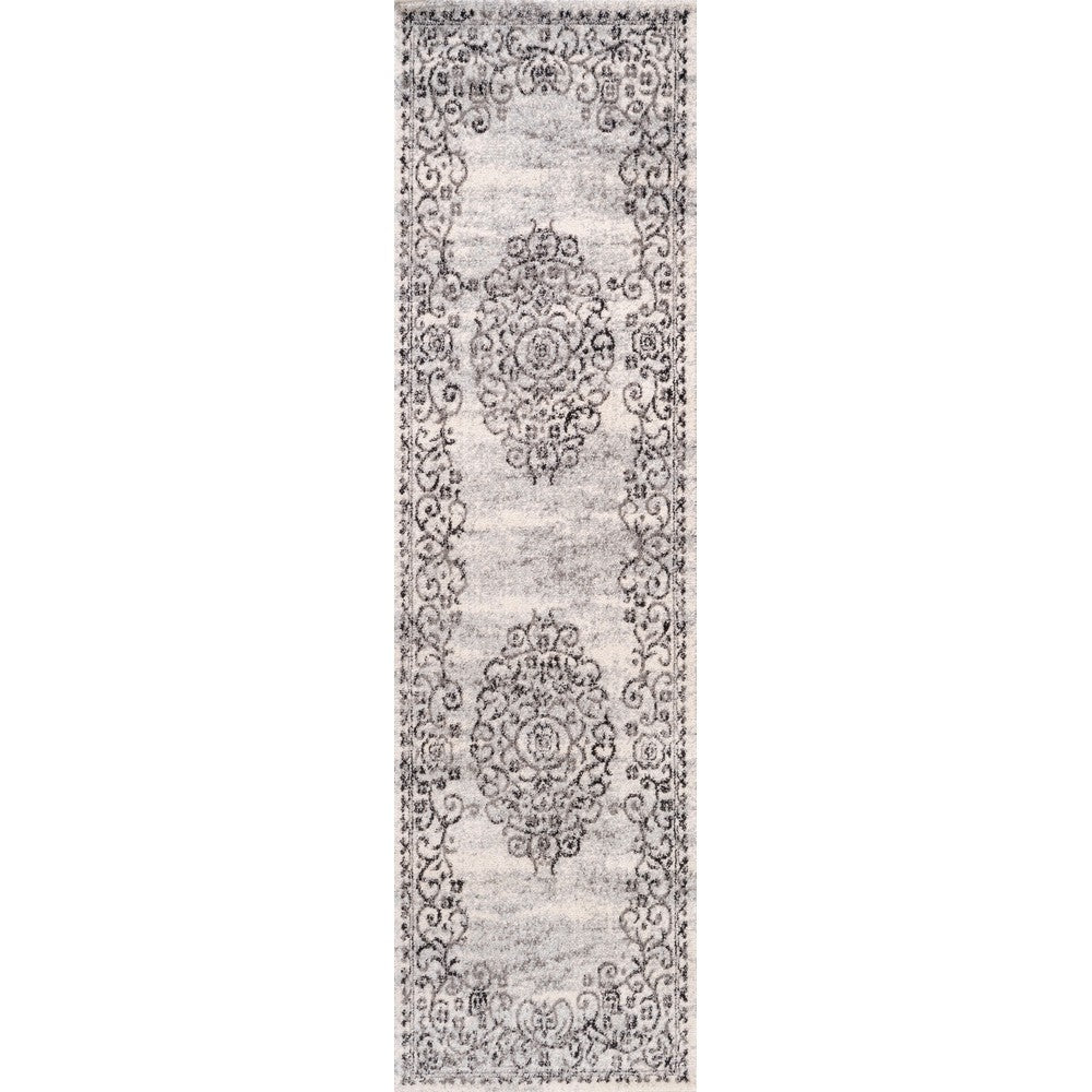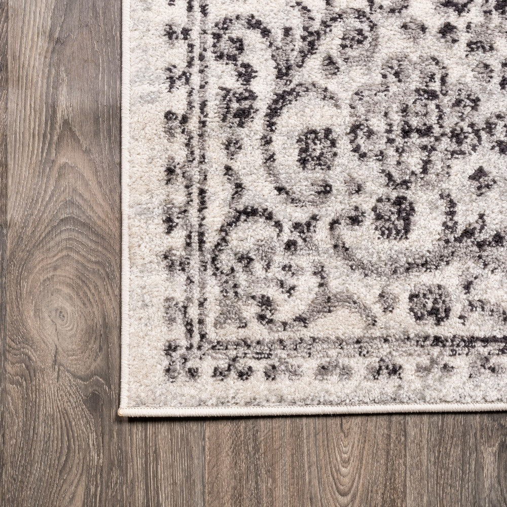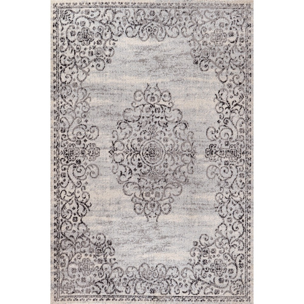 - This rug has a dark gray pattern on a mingled background of light gray and ivory for a vintage look