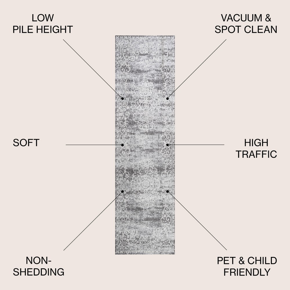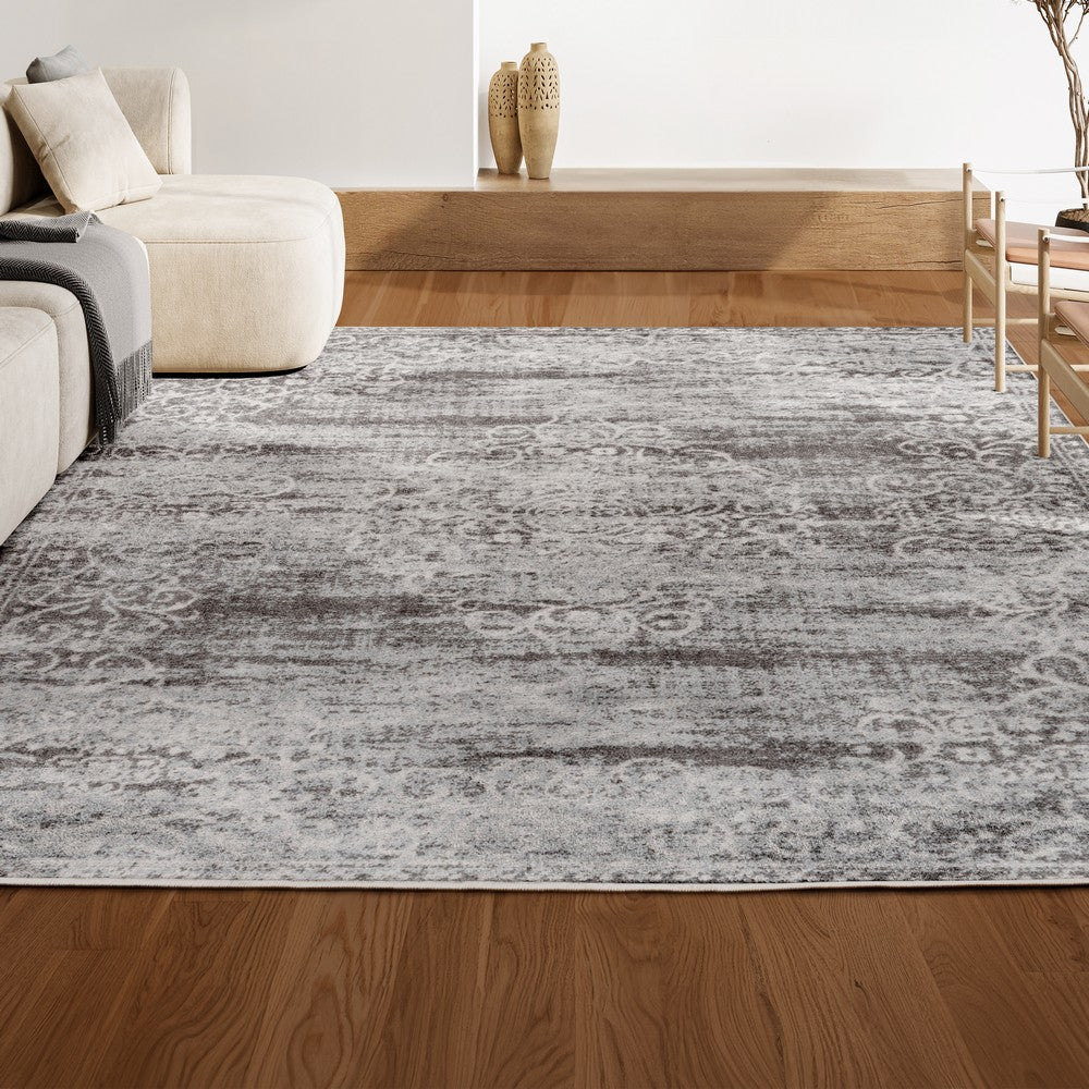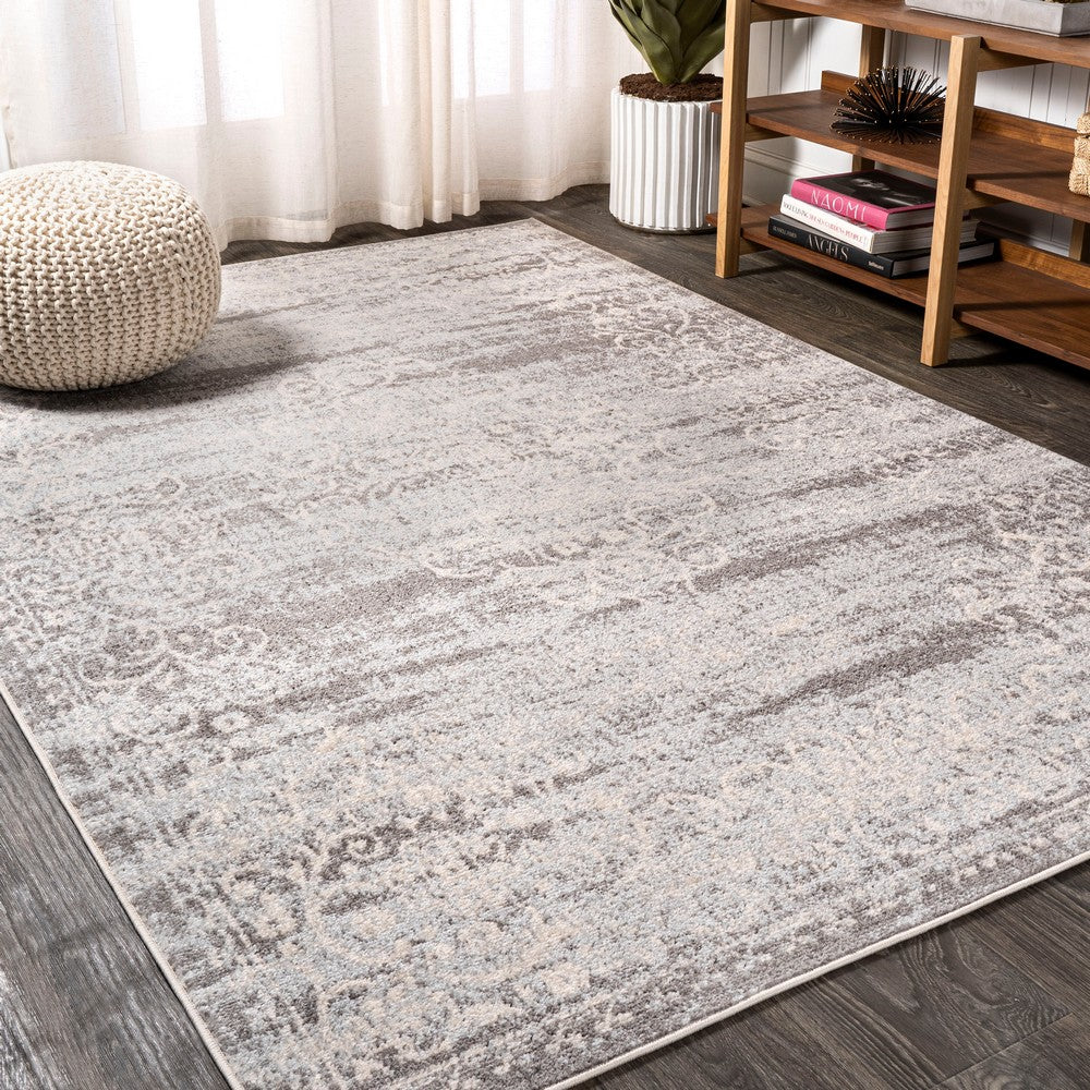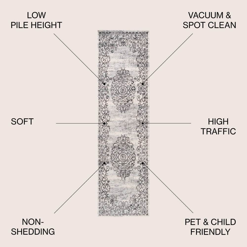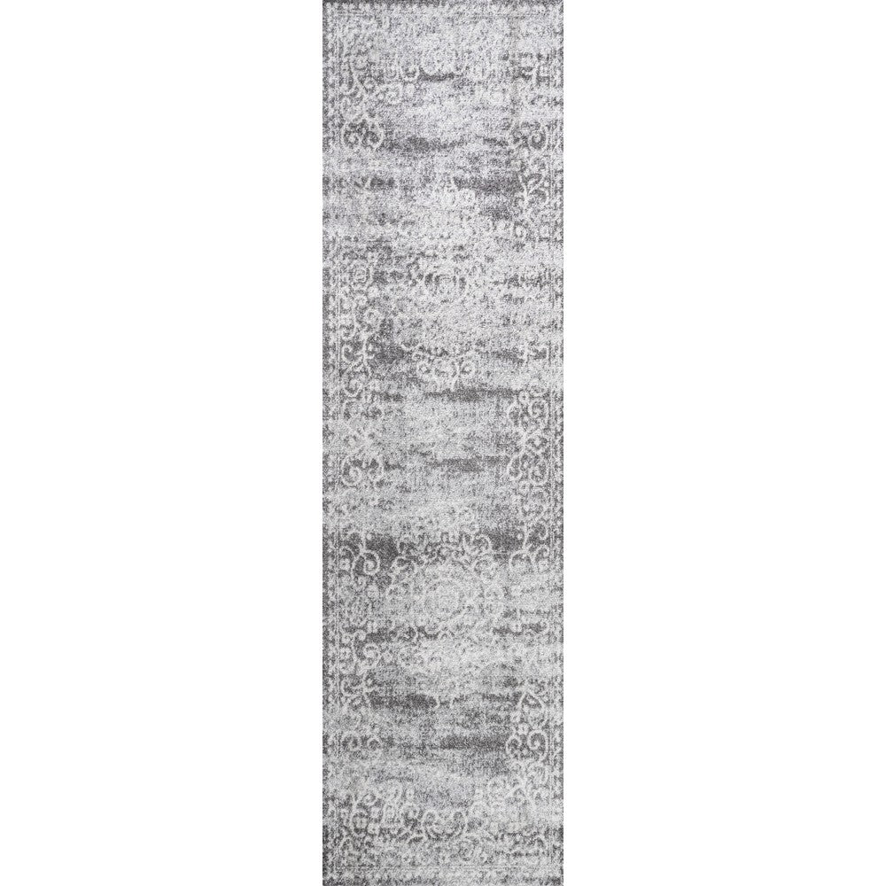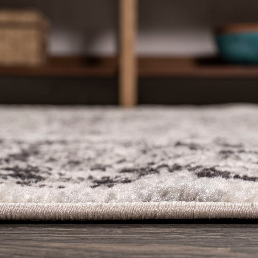 - This rug has a dark gray pattern on a mingled background of light gray and ivory for a vintage look