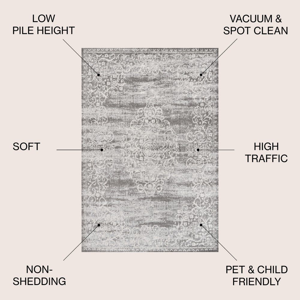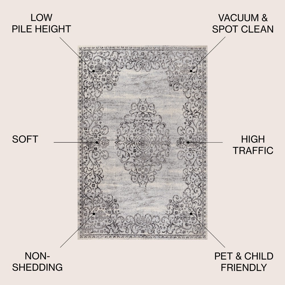 This ornate medallion rug's scrolling filigree pattern adds dreamy Bohemian cottage style to a living room, dining room, entry or bedroom. Mediterranean wrought iron is the inspiration for this design. The dark gray pattern on a lighter mingled background gives this rug a hand-woven, vintage vibe.