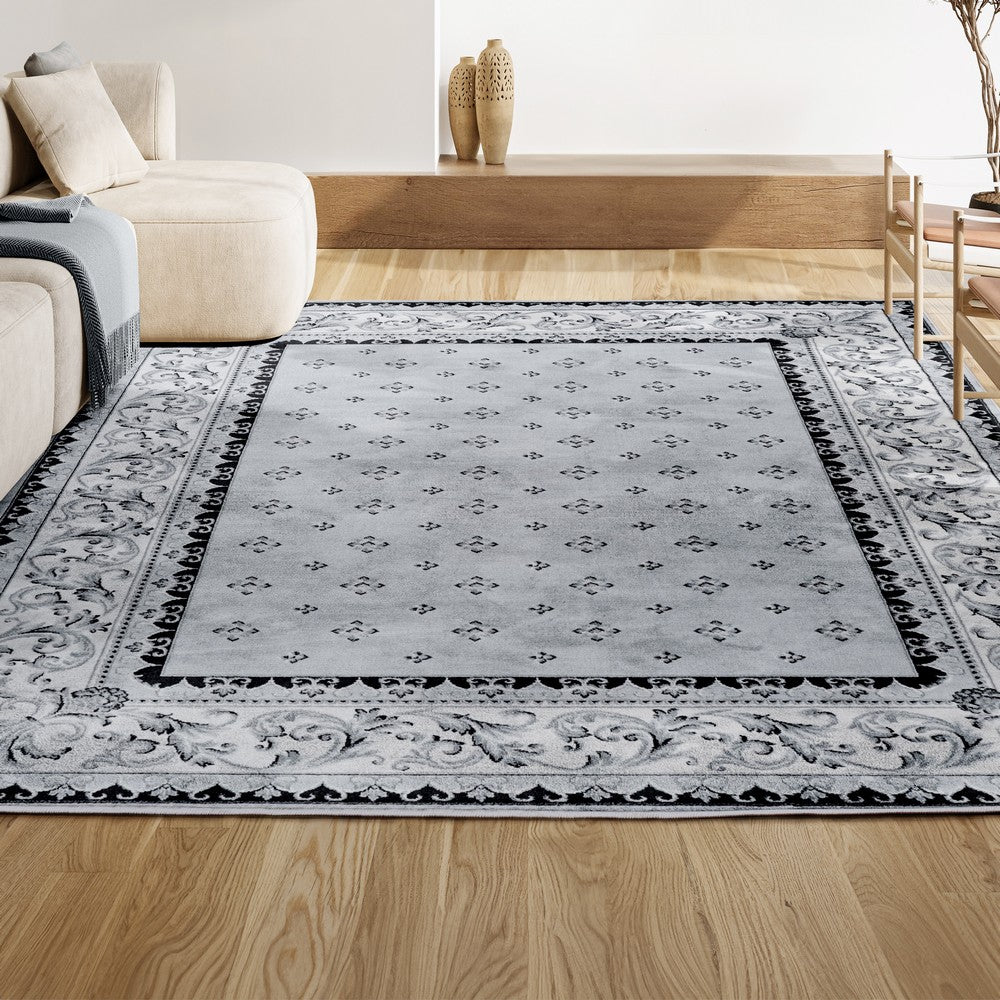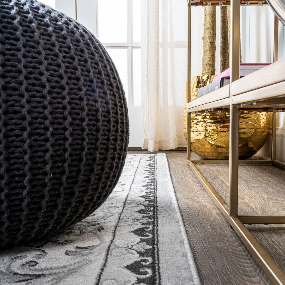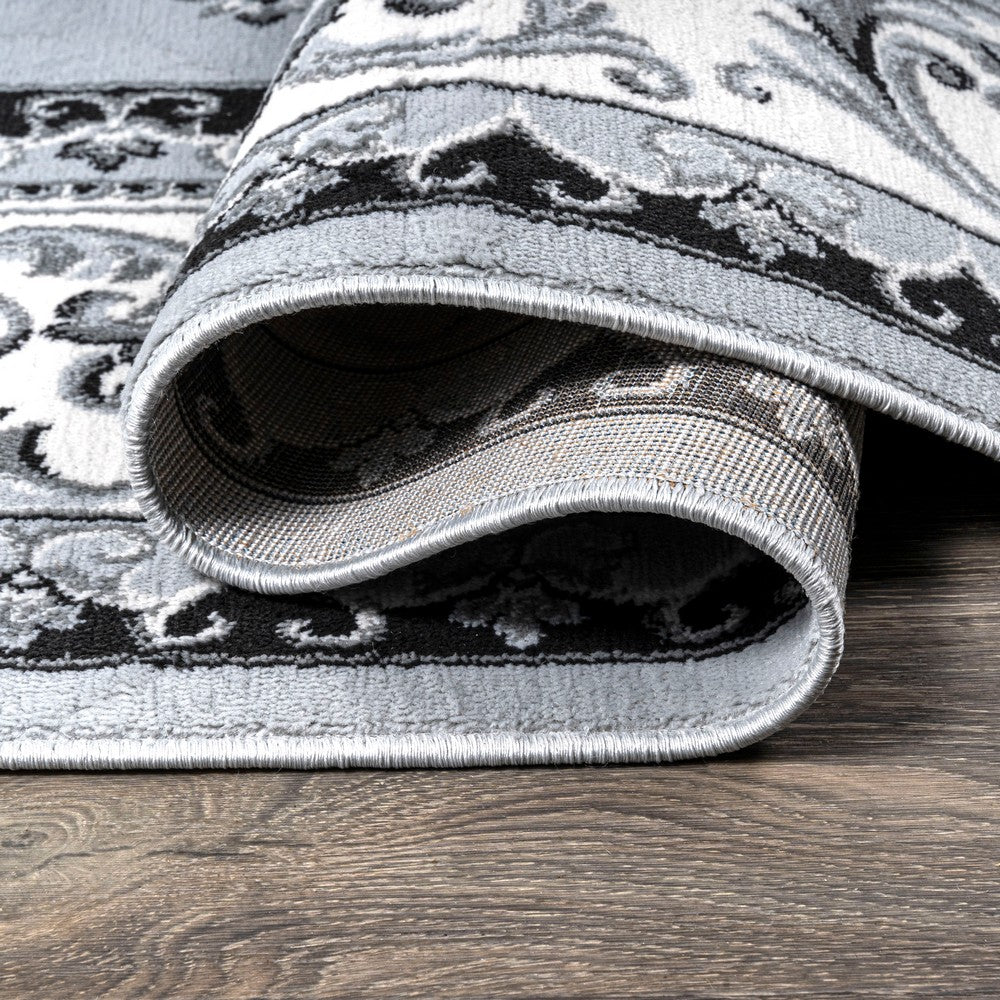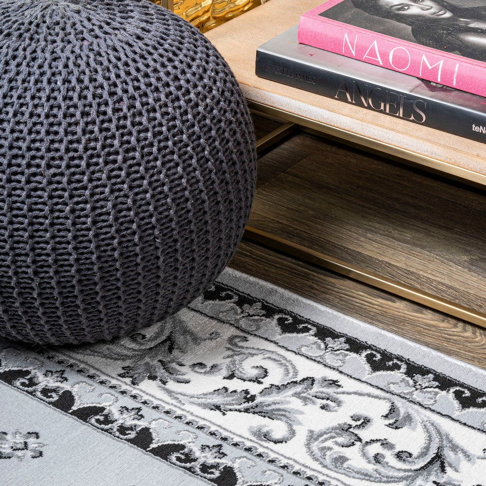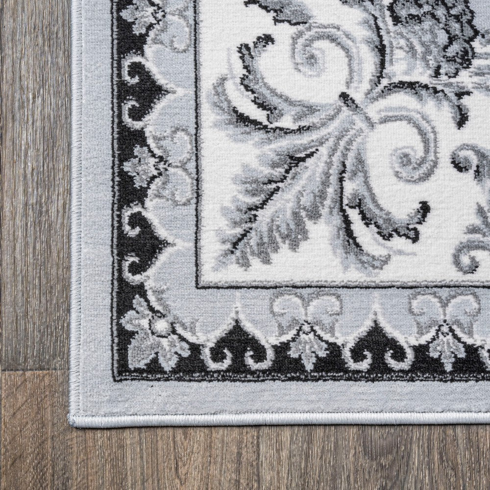 This elegant rug's medallions and acanthus leaf border are inspired by traditional French rug patterns. Our version in deep charcoal and ivory is the perfect way to update a living room, bedroom, entry, office or dining room. This versatile and elegant rug works beautifully in both traditional and modern spaces.