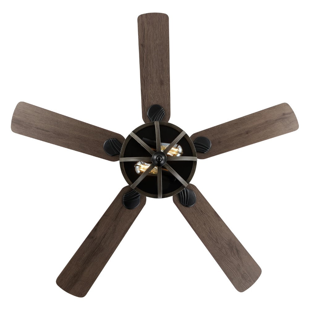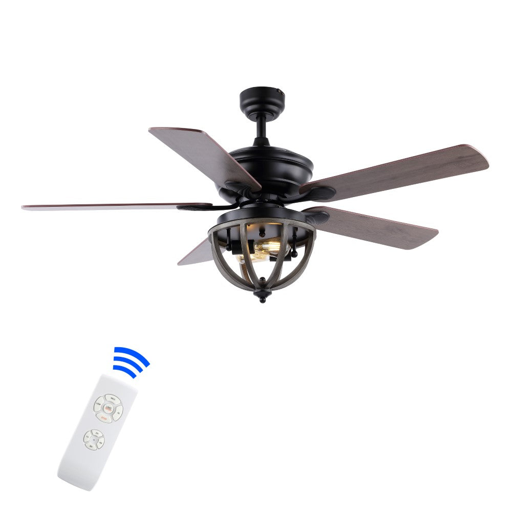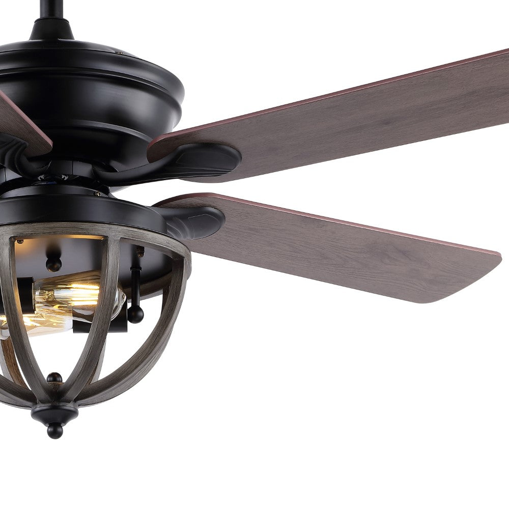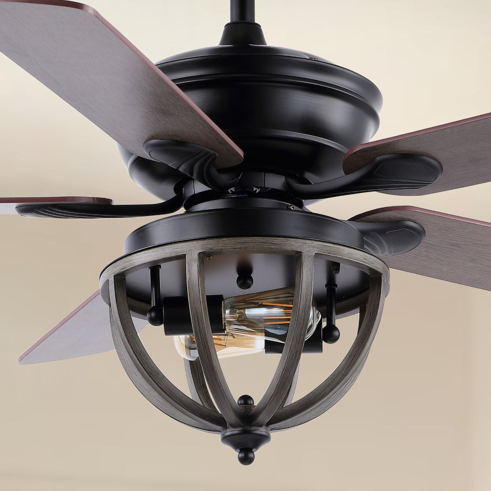 Our 52" black ceiling fan is a stylish find, with a simple, modern dome light and Edison-style bulbs. The black finish is complemented by five reversible blades in a rustic greige or brown finish. The handy remote control lets you easily control lighting and air flow.