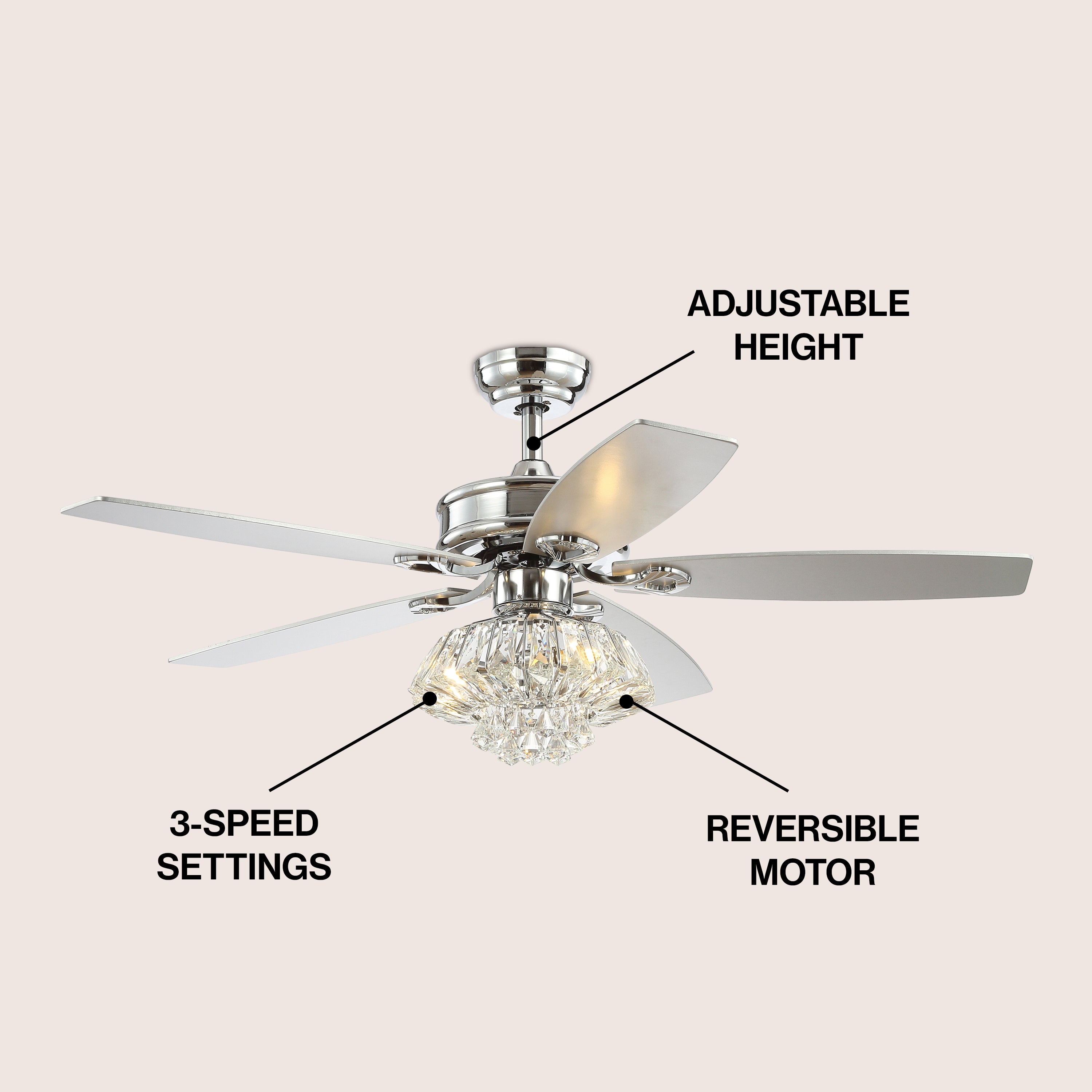 Our 48" chrome fan has swanky style, featuring a crystal drum light embellished with hanging crystal drops. Five reversible blades provide plenty of air flow by remote control. Three LED bulbs provide bright, sparkling light.