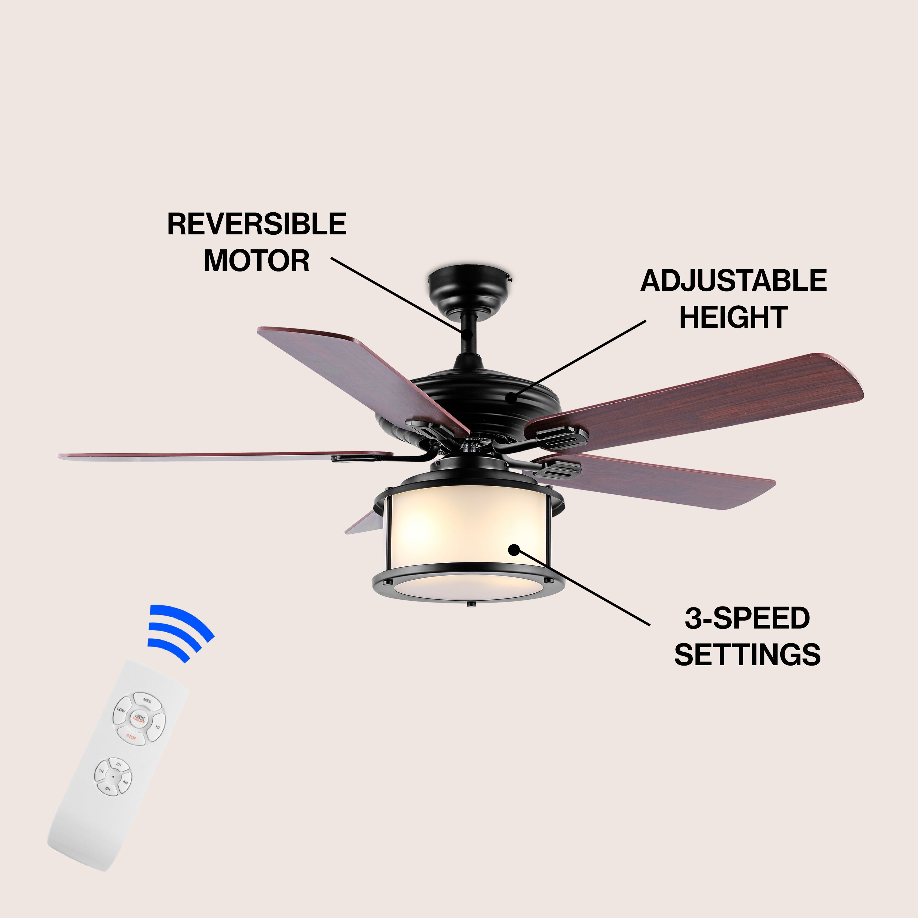This 52" lantern-style ceiling fan will add modern farmhouse charm to any room. The black finish is complemented by five reversible blades in a rustic greige or brown finish. LED bulbs give off warm, bright light inside a frosted glass lantern. Suitable for sloped ceilings; adjustable height mount using the included down rods. Includes remote control.