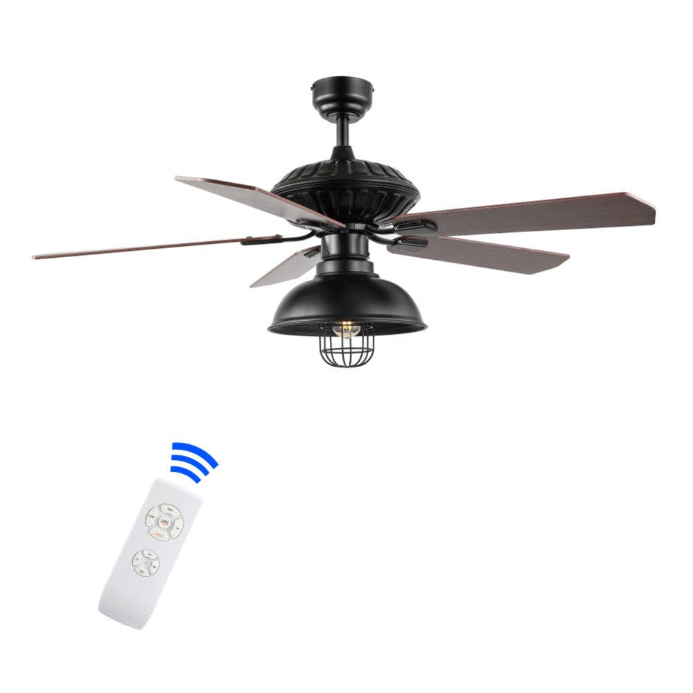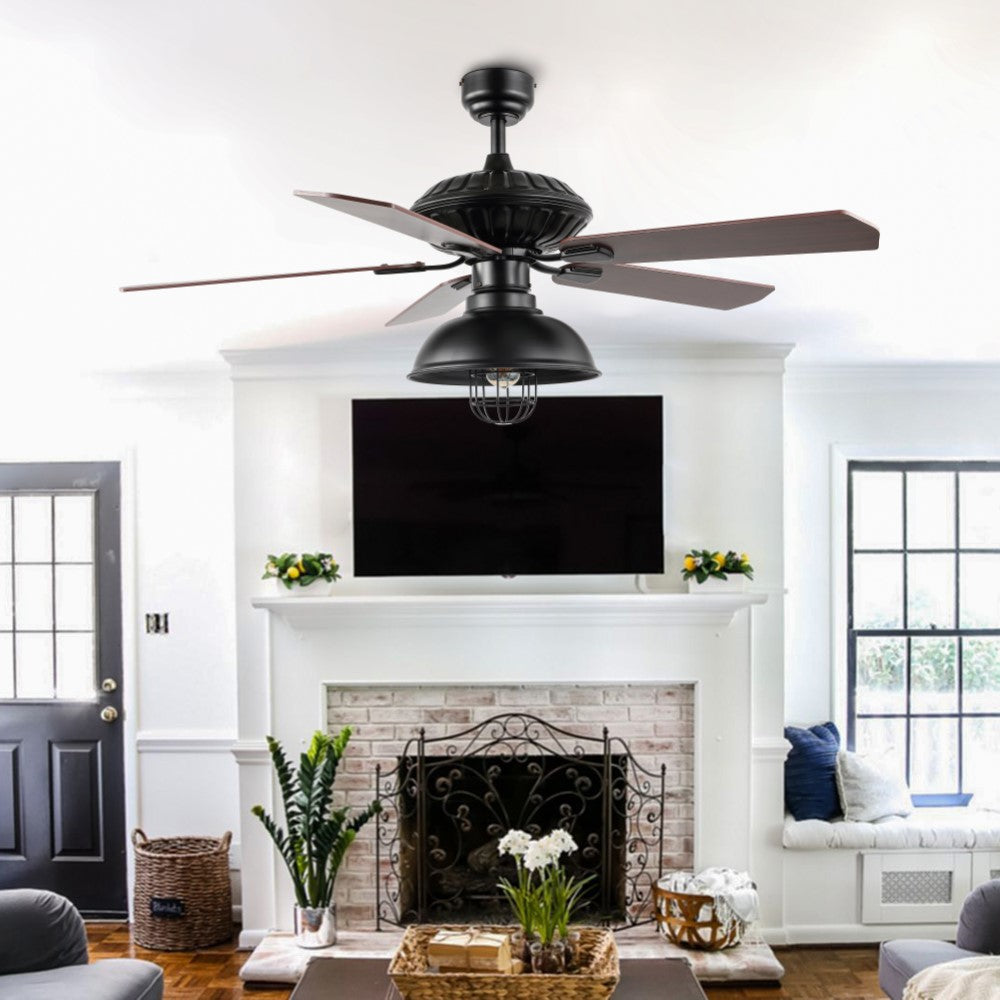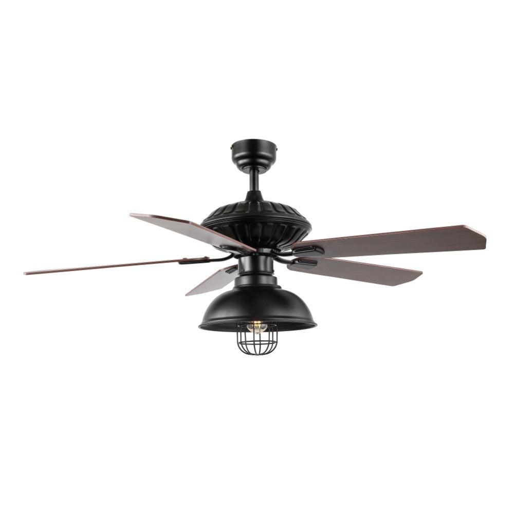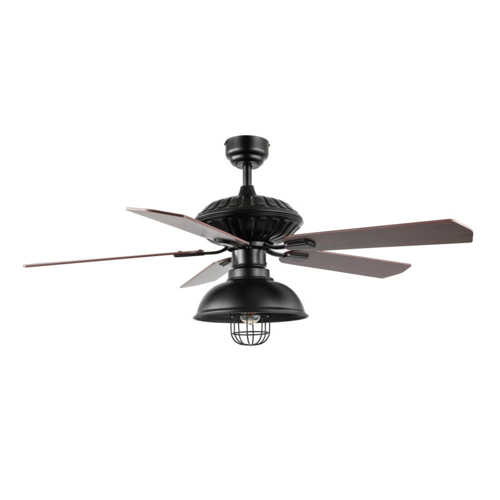 This 52" industrial-style ceiling fan will add farmhouse charm to your ceiling. The black finish is complemented by five reversible blades in a rustic greige or brown finish. A single Edison-style LED bulb give off warm, bright light.