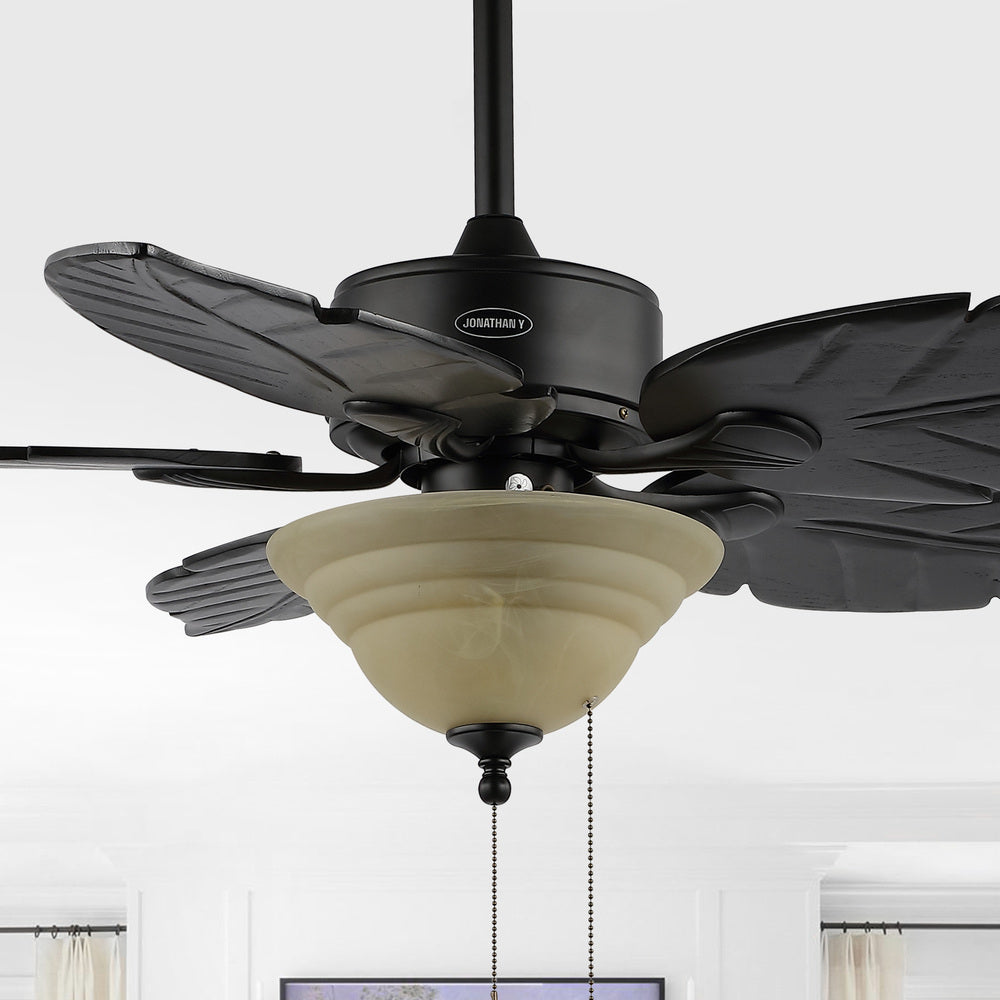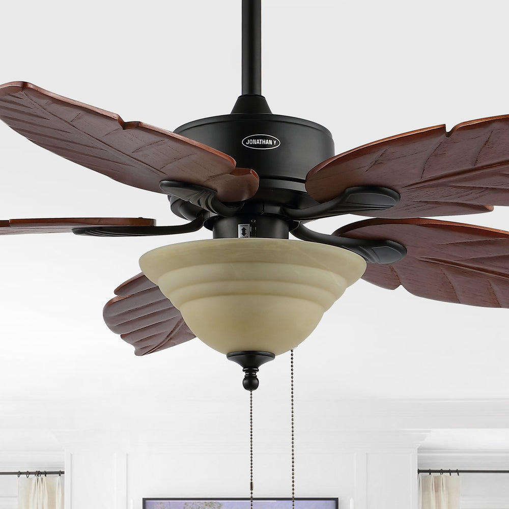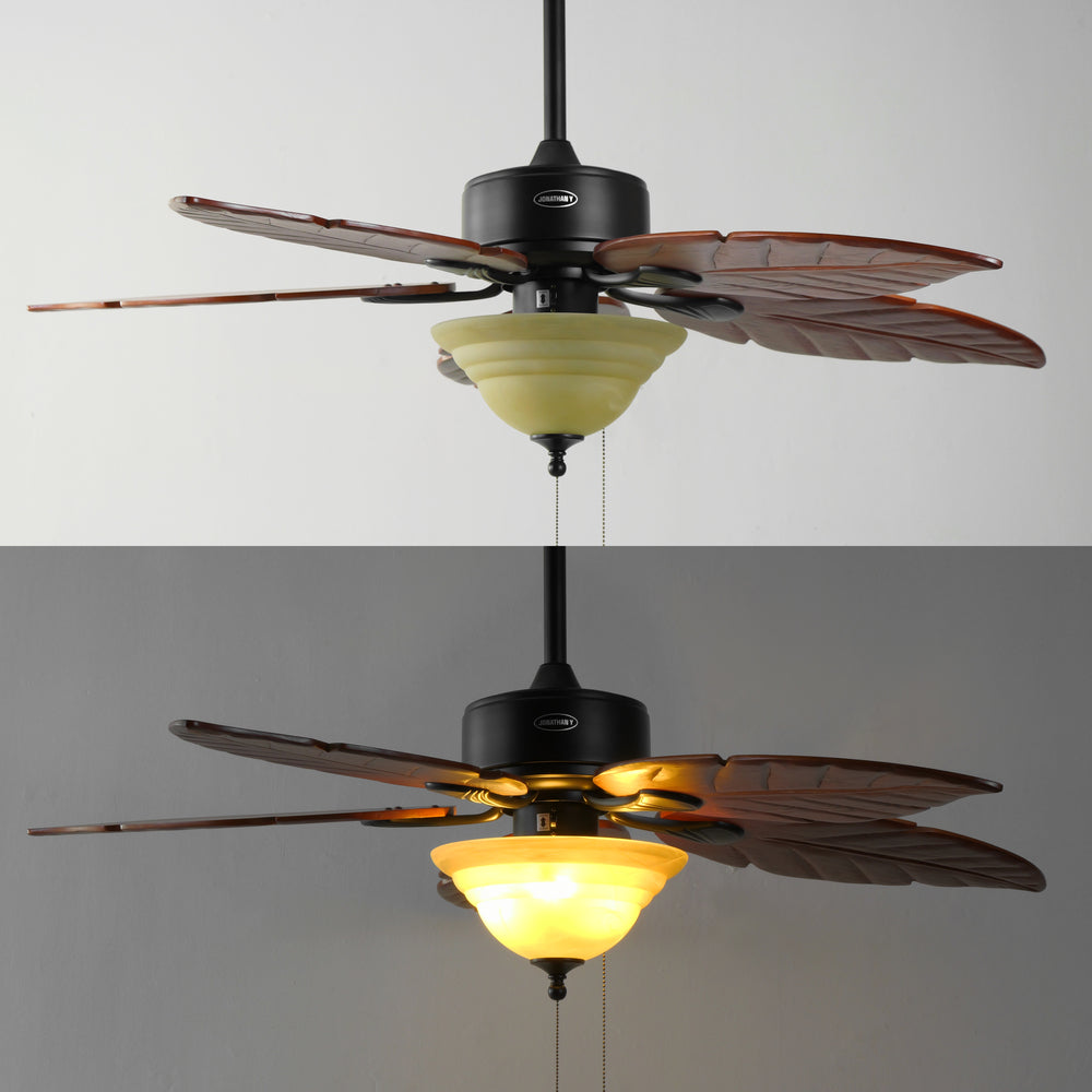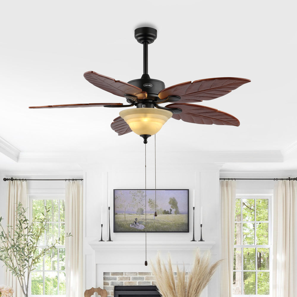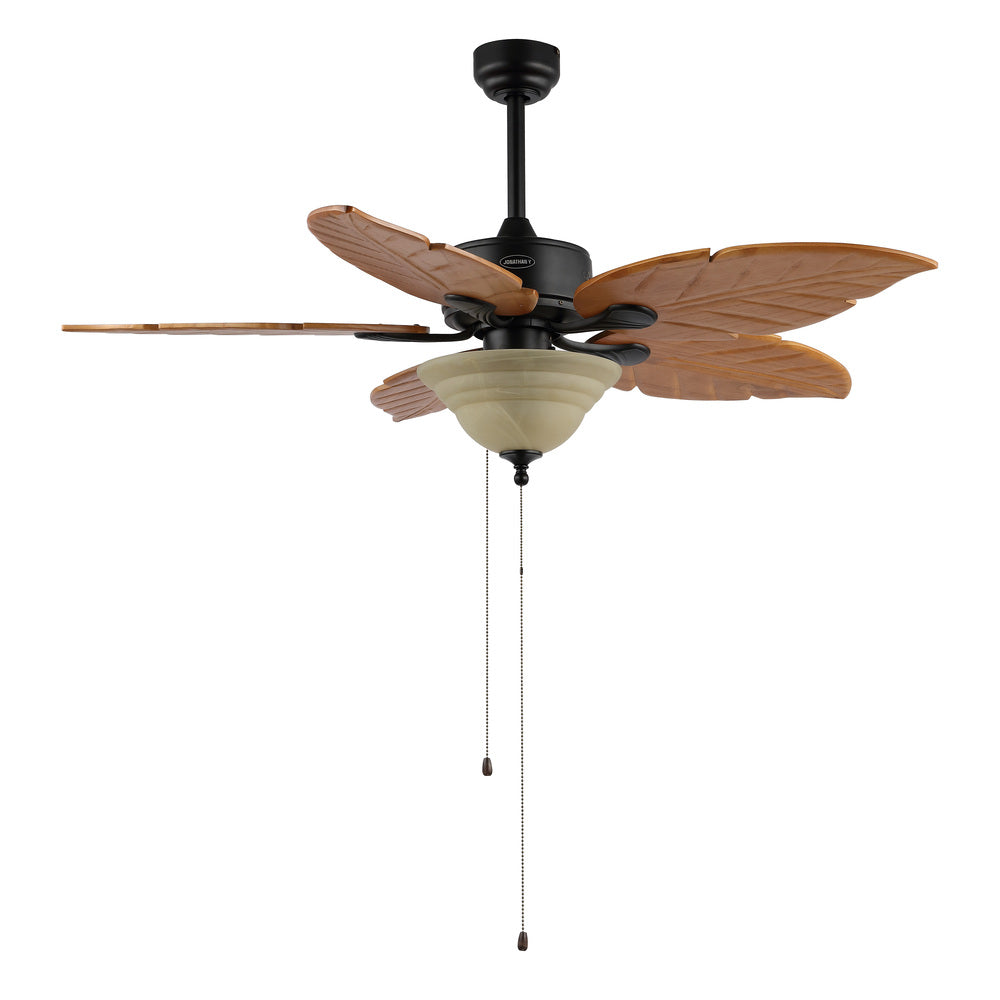 Cool off and illuminate your space in style with our bohemian style ceiling fan. Compatible with a pull chain and wall switch, this fixture is an easy-to-use addition to any living room. Its wooden palm leaf shaped blades and metal accents will bring a dose of rustic design into your home.