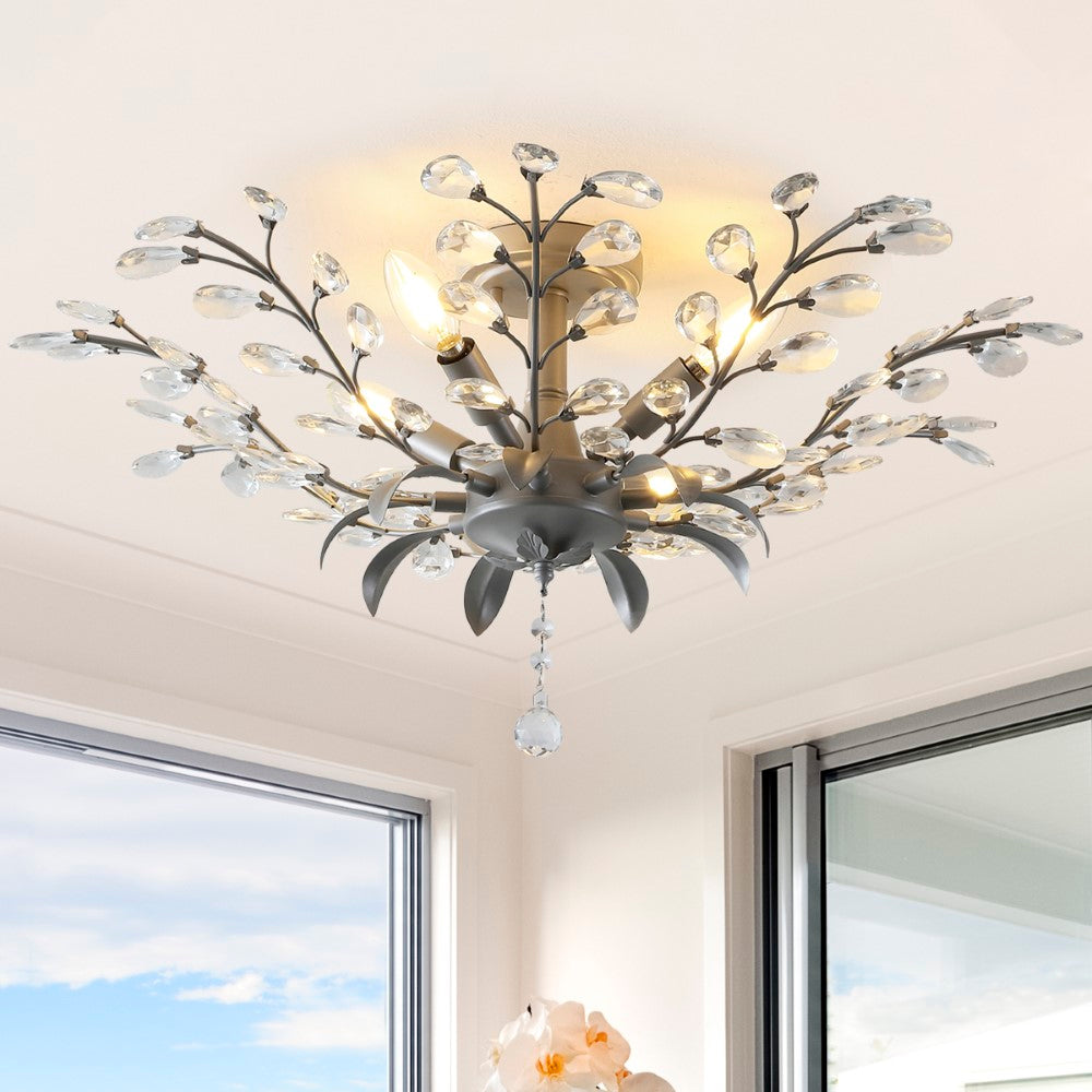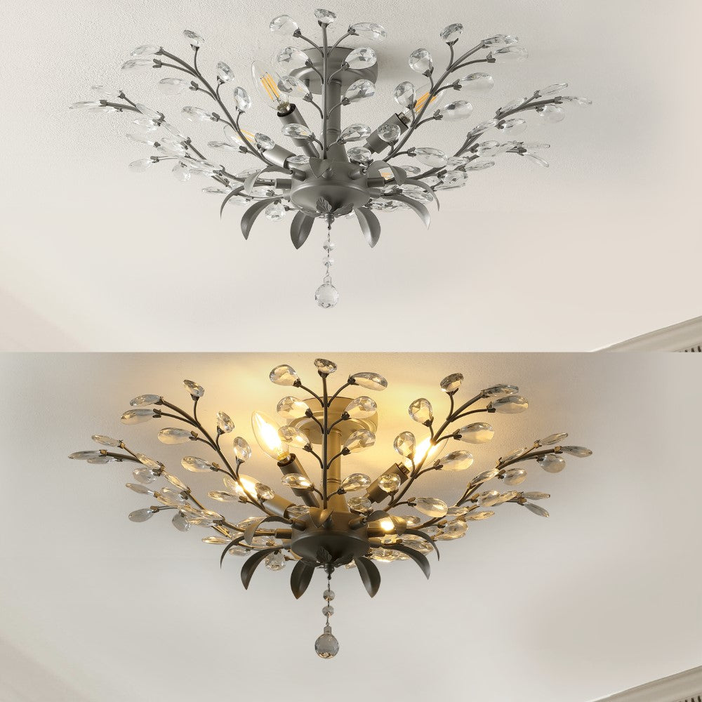 - Bring mid-century romance home with this ceiling fixture's ornately decorated crystal branches