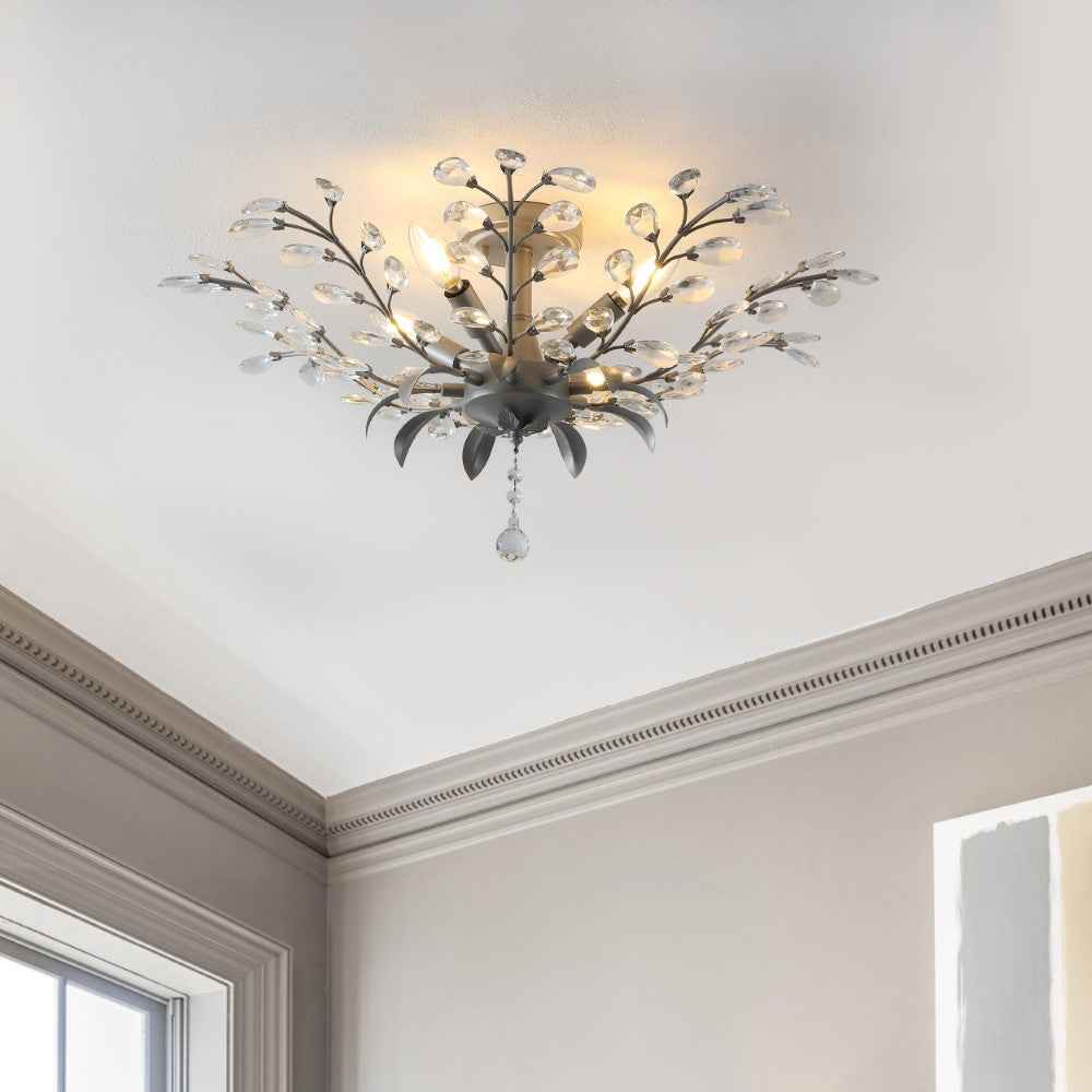 Glam up your ceilings with our vintage-inspired crystal branch light fixture. This ceiling fixture features glass crystals set onto gently curved metal branches and lit by warm LED bulbs; decorative leaves and a crystal ball accent the base. Our sparkling ceiling light will add a touch of glamour to your bedroom, entry, hallway or bathroom.