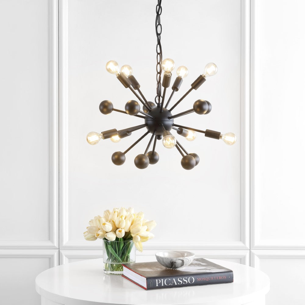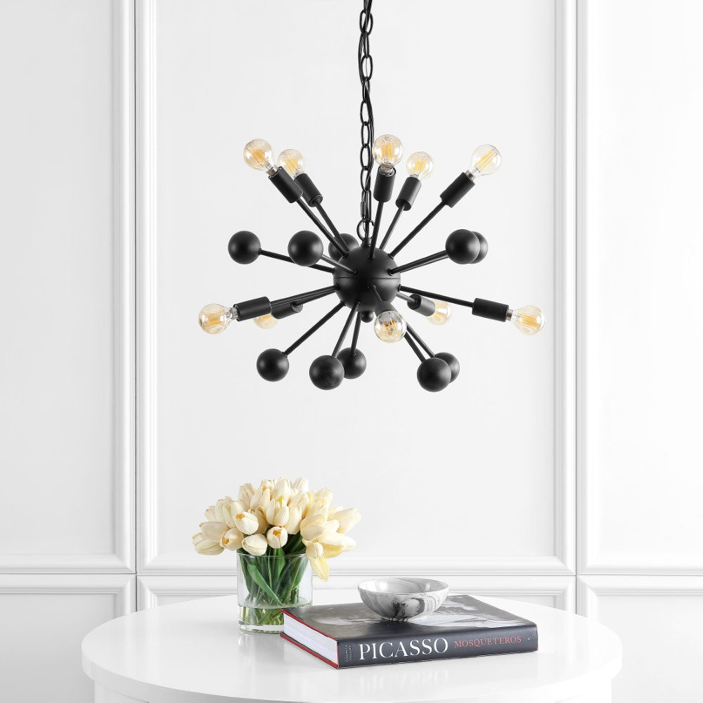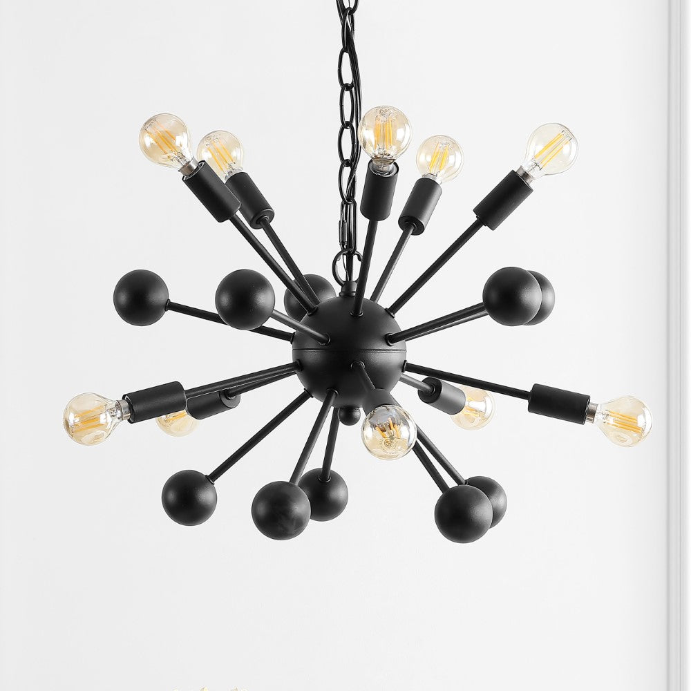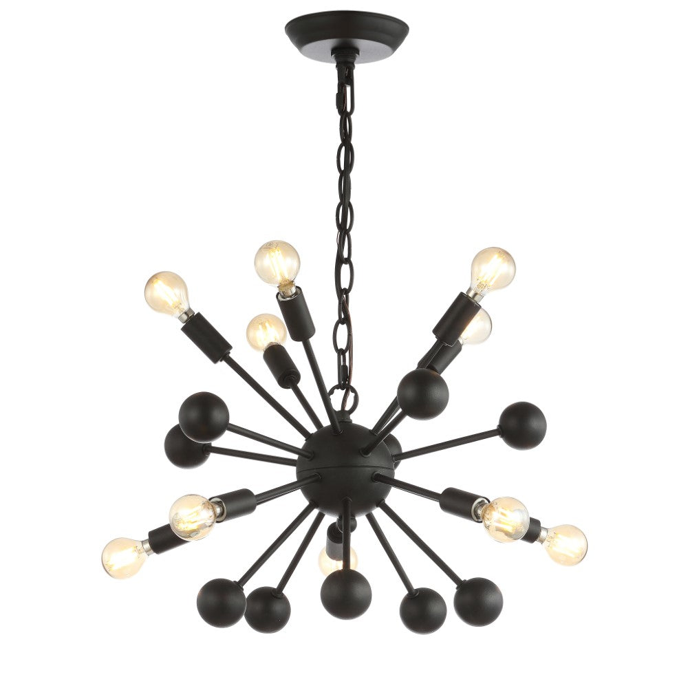 Create a mid-century mood with the dramatic black silhouette of our retro-modern ceiling fixture. Inspired by industrial design and atomic-age style, the sputnik chandelier is both lighting and sculpture. Perfect for a dining room, living room, entry or bedroom, it features 10 vintage-style LED bulbs and a black satin metal finish. Perfect for rustic and farmhouse look.