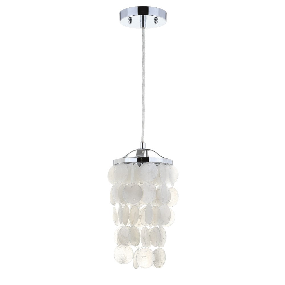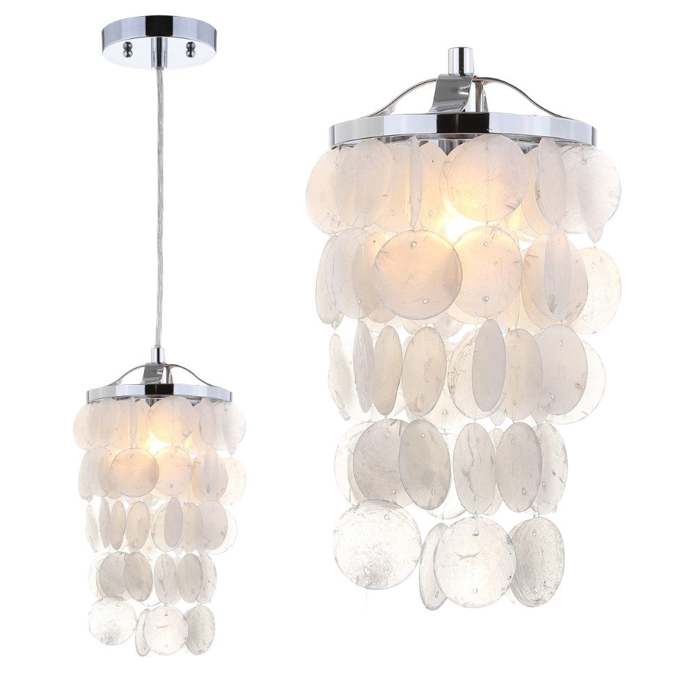 Accent a breakfast nook with the stylish charm of this shell chandelier. Featuring chrome hardware gleaming in contrast to the soft iridescence of round capiz shells, strands of varying lengths shade the light and offer shimmering flair. With an adjustable drop, this pendant can extend from 14.5" from the ceiling all the way to 86.5" for higher ceilings.