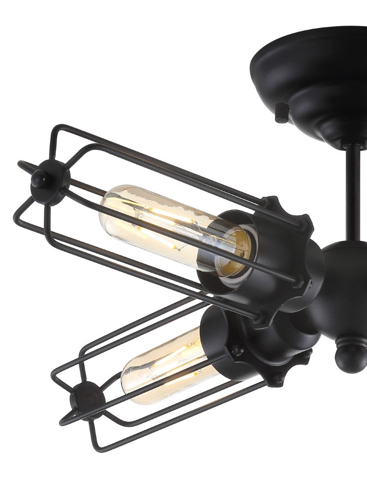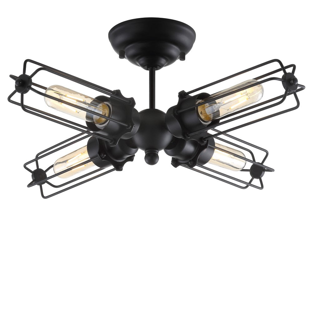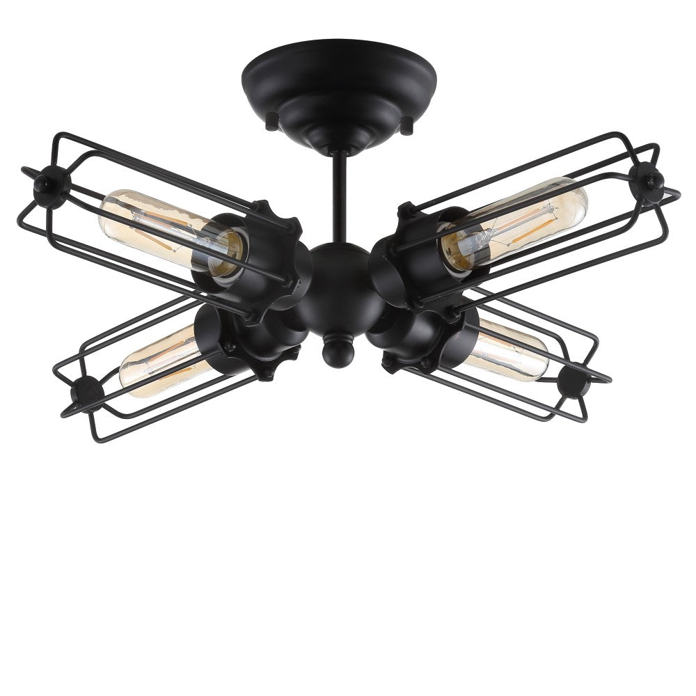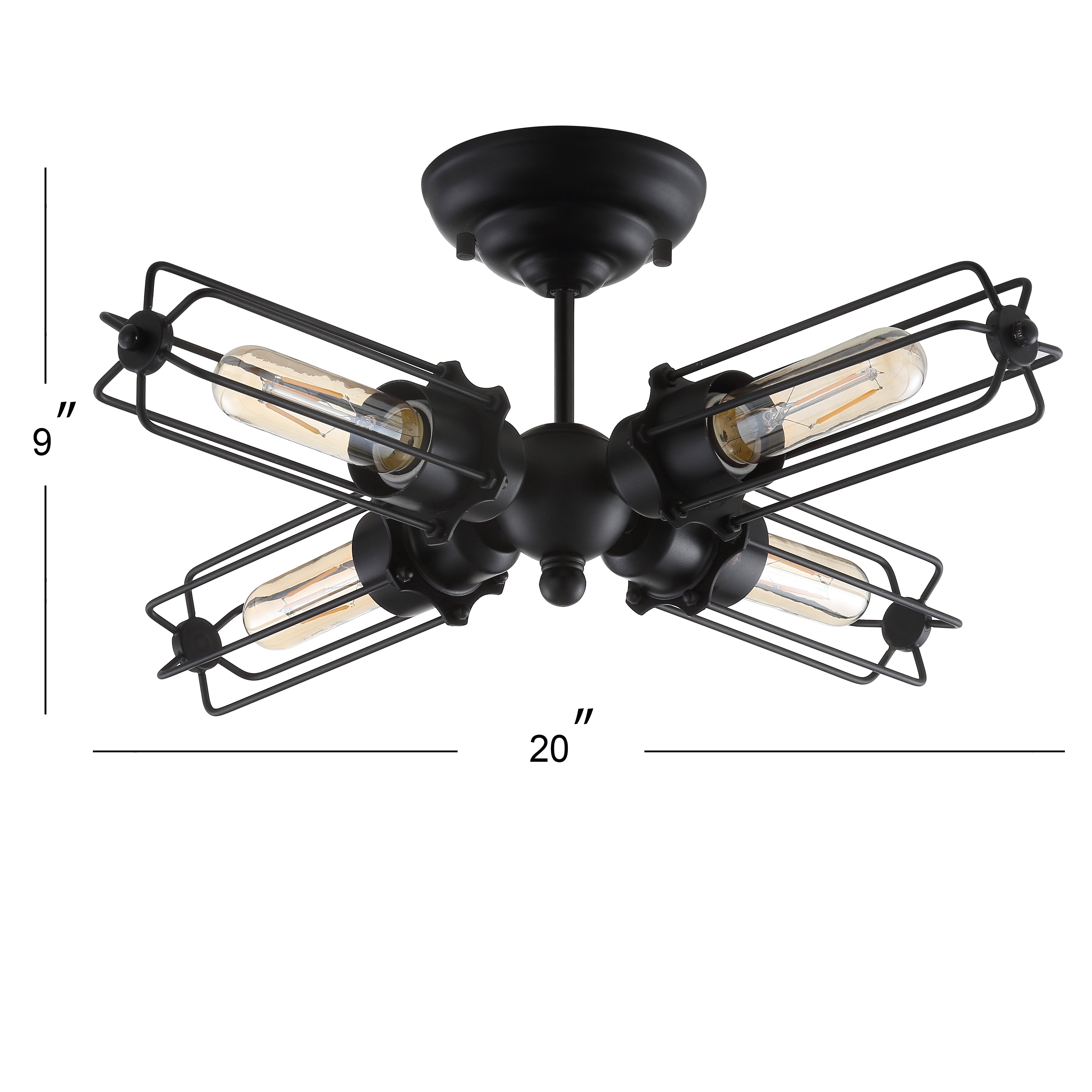 This industrial 4-bulb flush mount features semi-exposed bulbs and a sharp black finish. Its LED-compatibility makes it convenient and energy-efficient. Suitable for low-ceiling spaces at just 9" in height, it provides ample light.