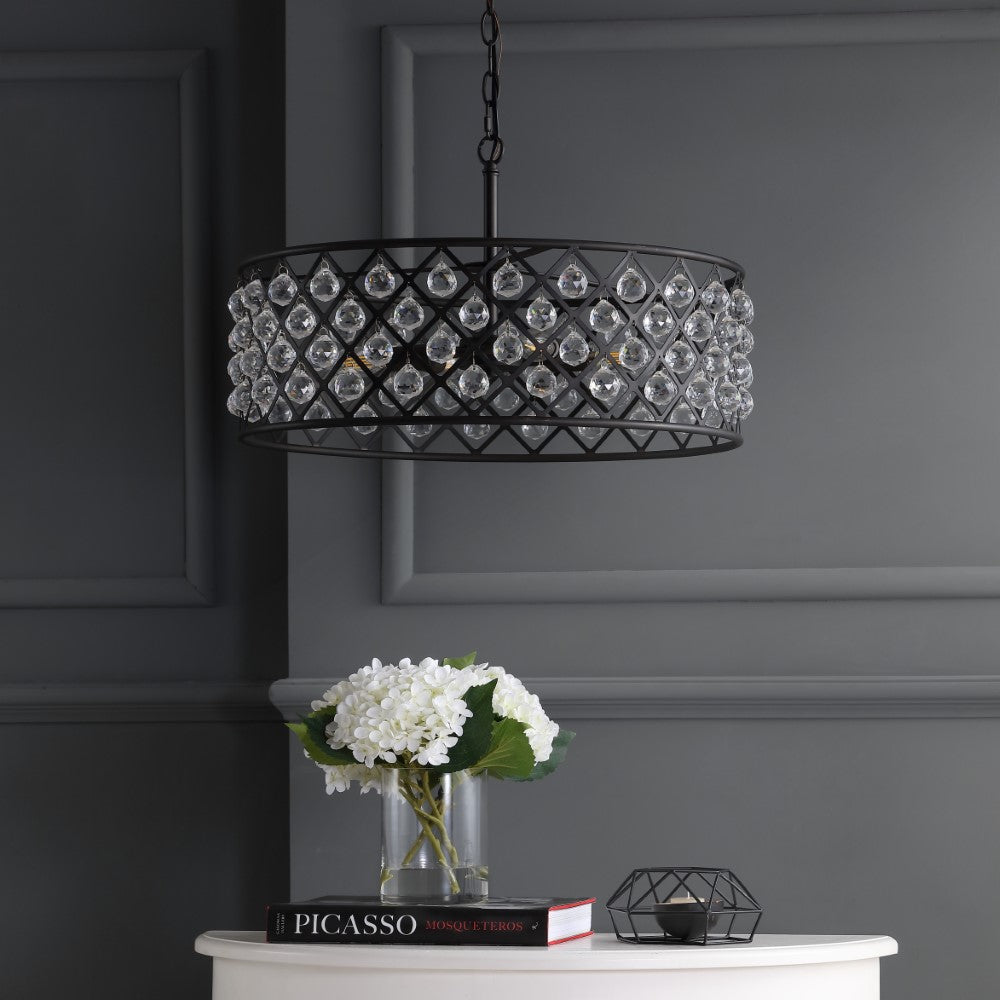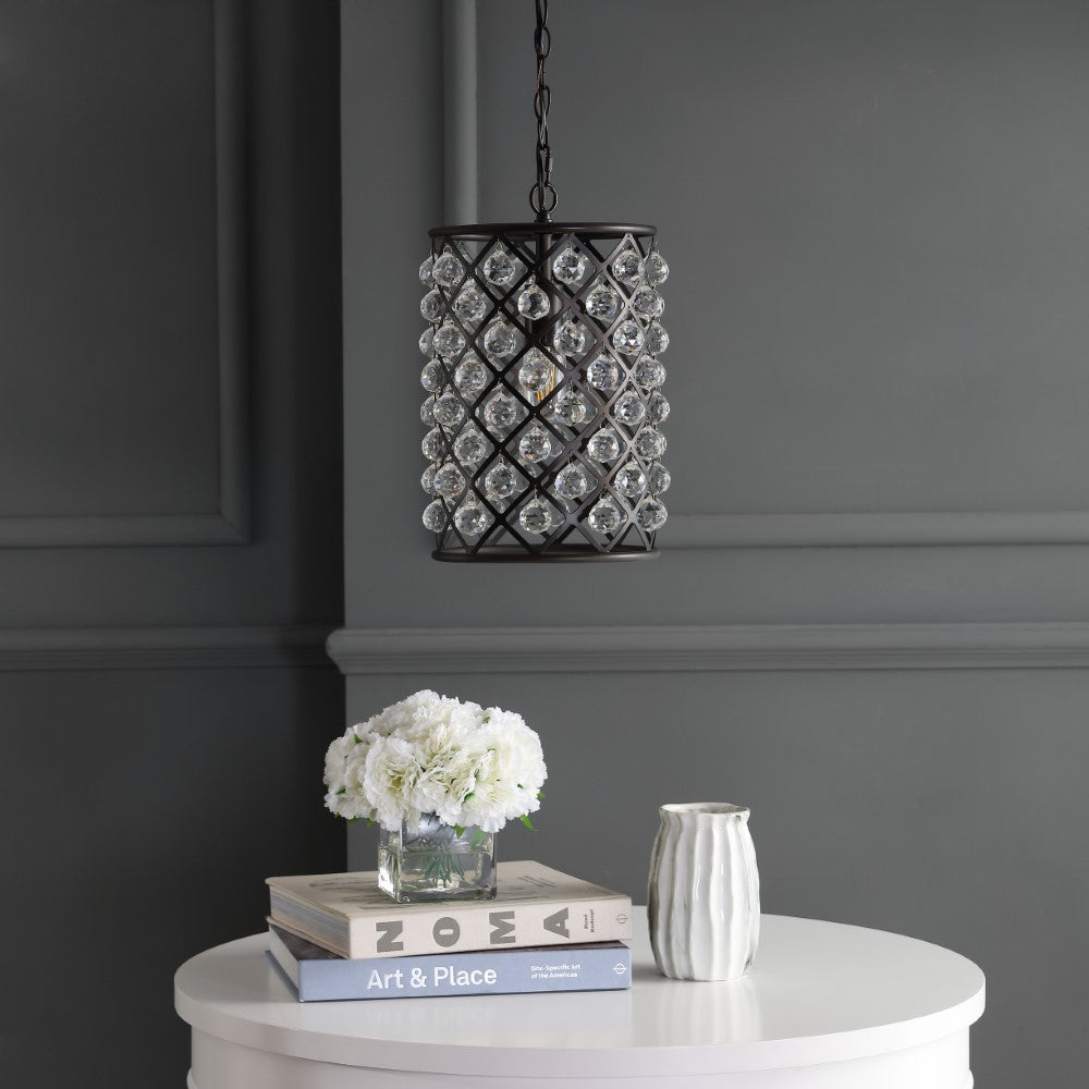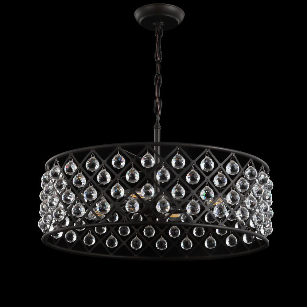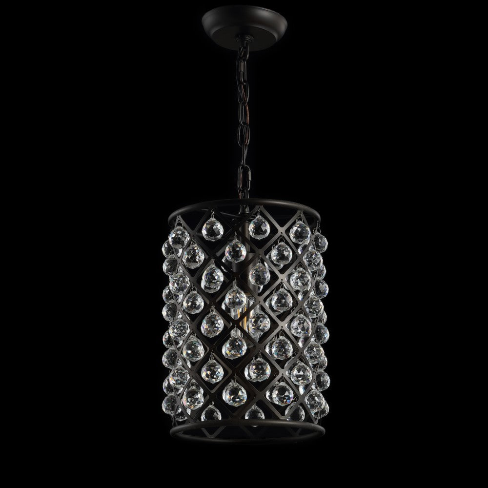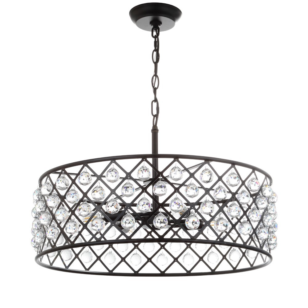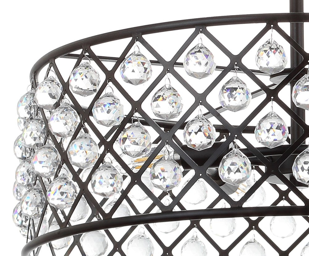 Modern simplicity meets organic beauty in the breathtakingly unique crystal and iron pendant. Hand-polished, multifaceted clear crystal spheres shimmer like dewdrops in a circular forged-iron grid with an oil-rubbed bronze finish. The hanging length is adjustable for multiple ceiling heights, from 18.5" of drop to 90.5" of length.