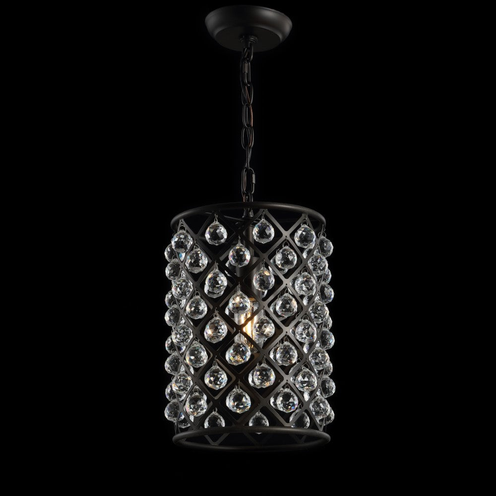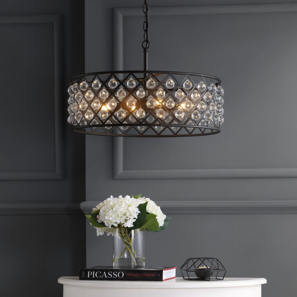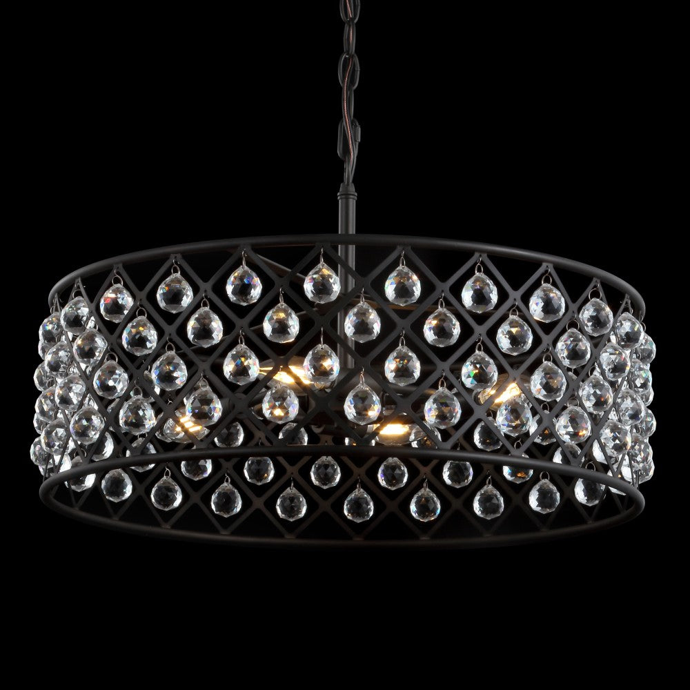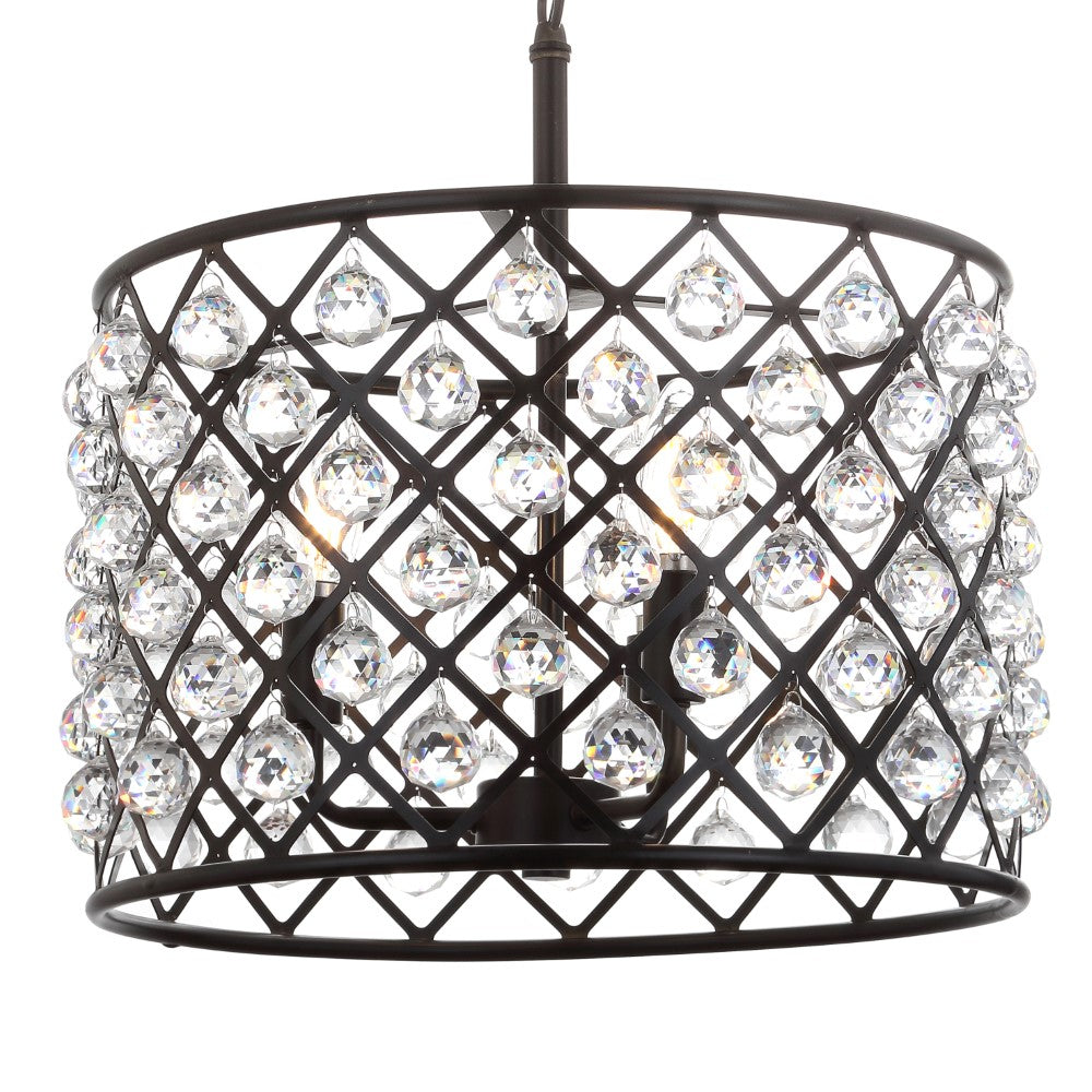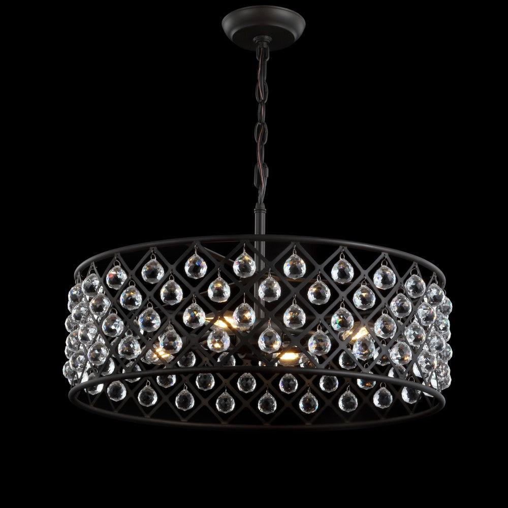 Modern simplicity meets organic beauty in the breathtakingly unique crystal and iron pendant. Hand-polished, multifaceted clear crystal spheres shimmer like dewdrops in a circular forged-iron grid with an oil-rubbed bronze finish. The hanging length is adjustable for multiple ceiling heights, from 18.5" of drop to 90.5" of length.