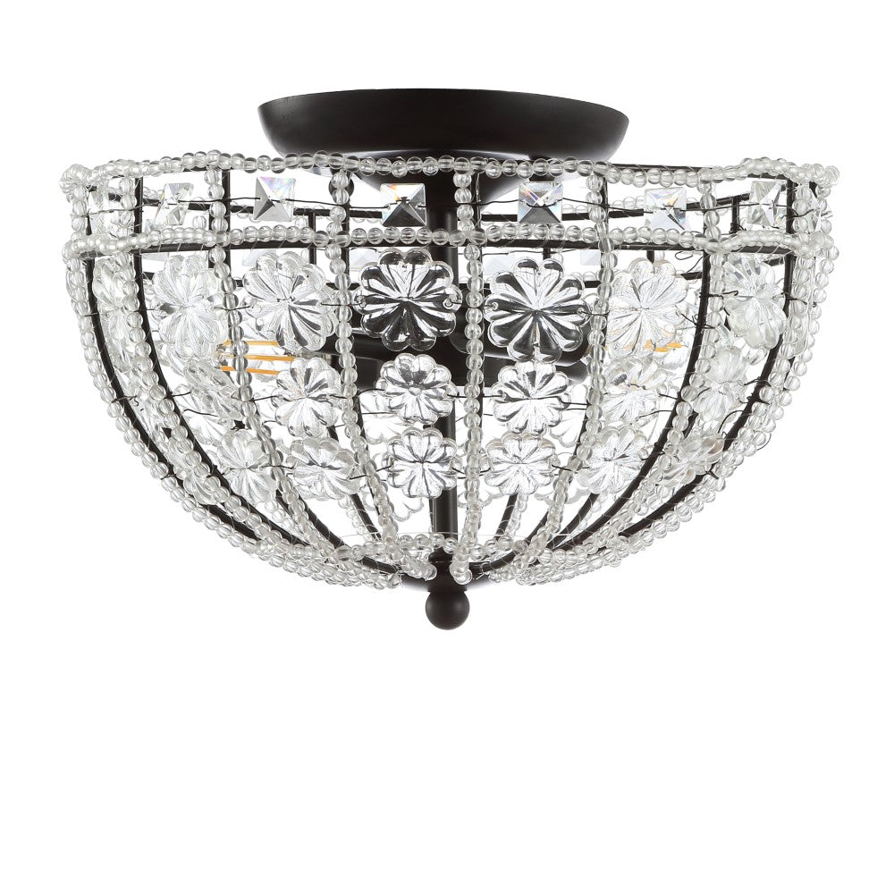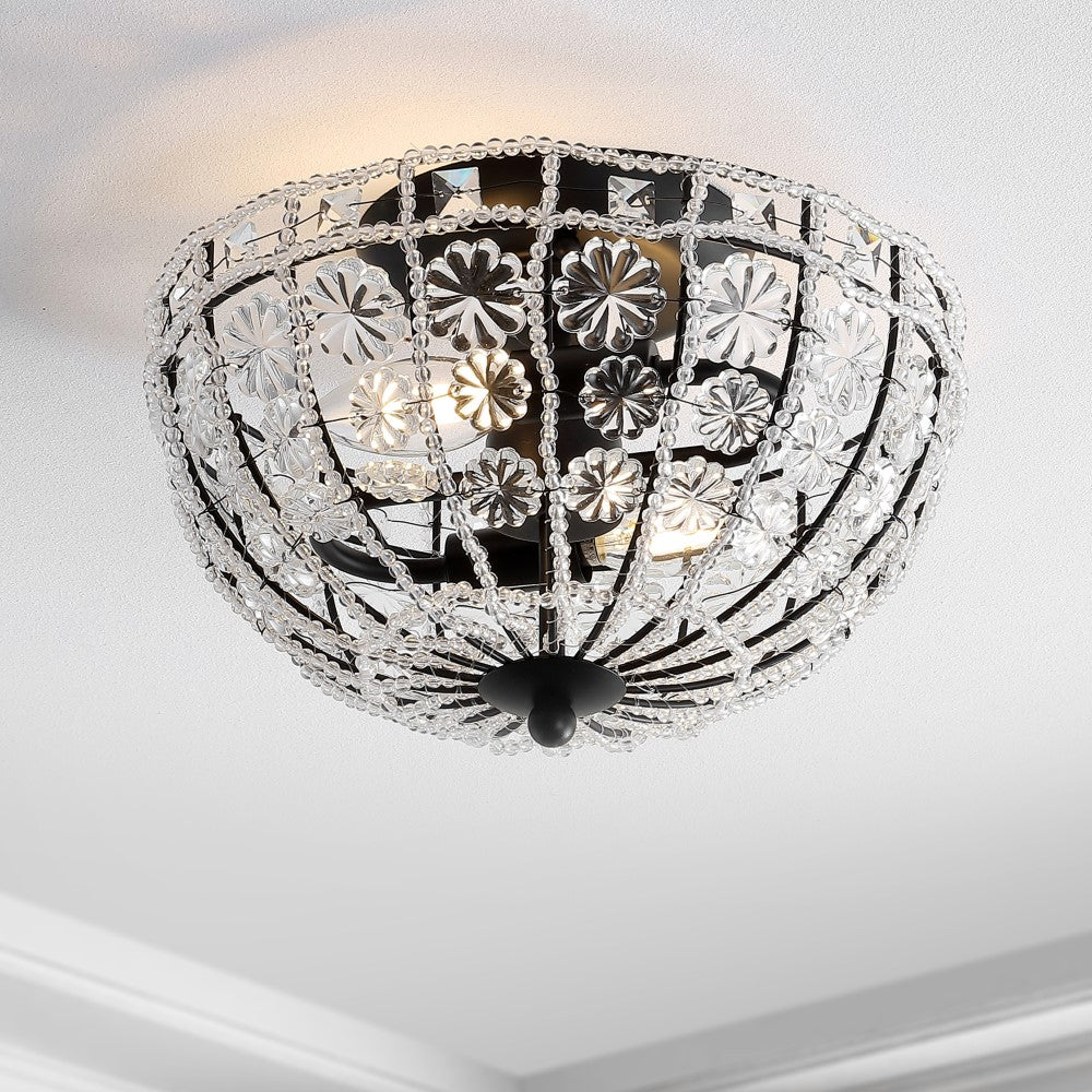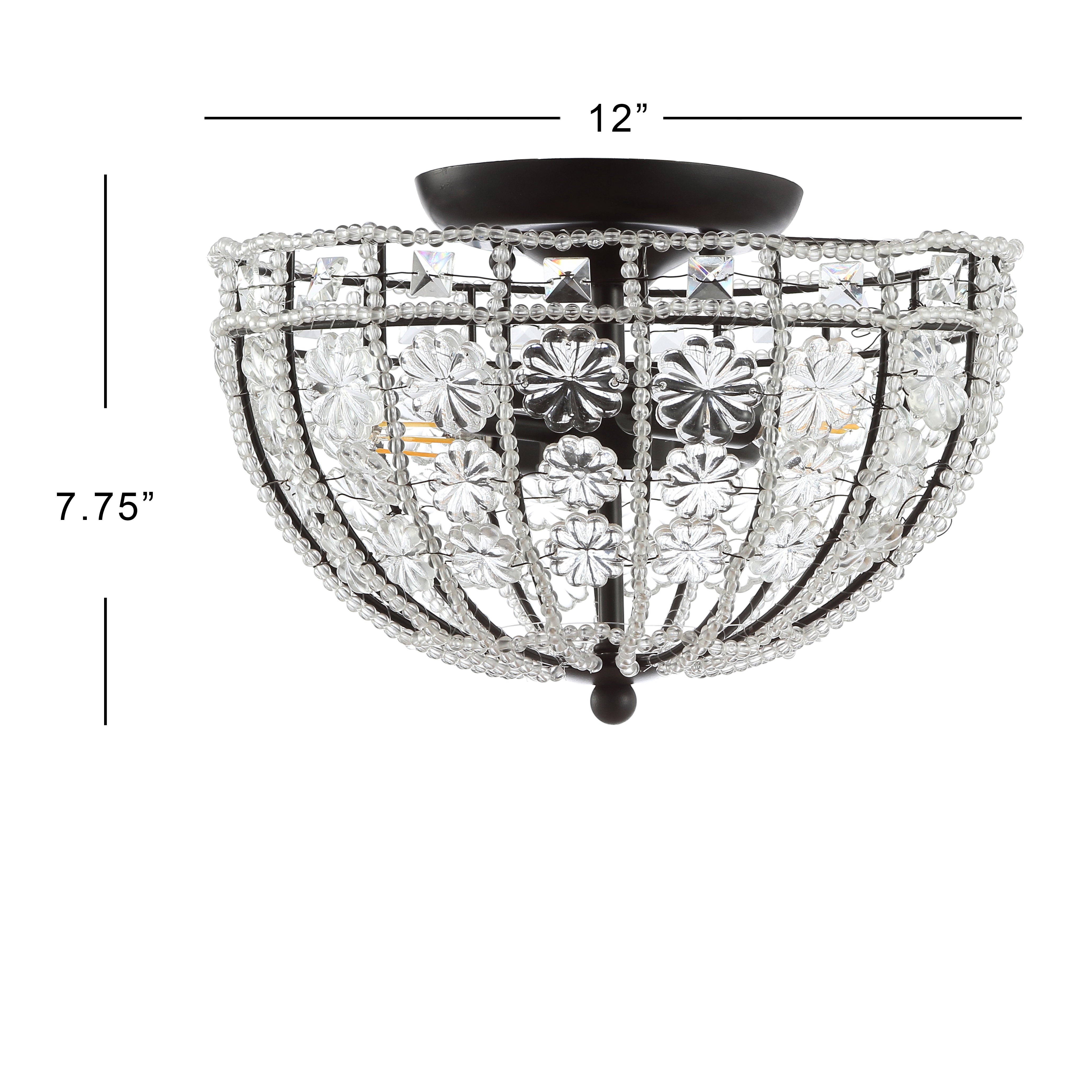 Add drama and sparkle to your ceiling with our modern, feminine semi-flush light fixture. Flower crystals are set into a crystal-covered black metal shade. This light fixture is a glamorous addition to your hallway, bedroom or bathroom. Two included LED bulbs provide plenty of light.