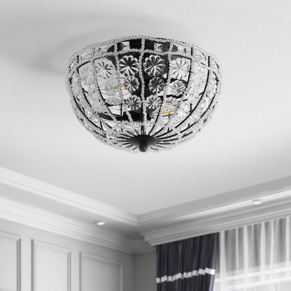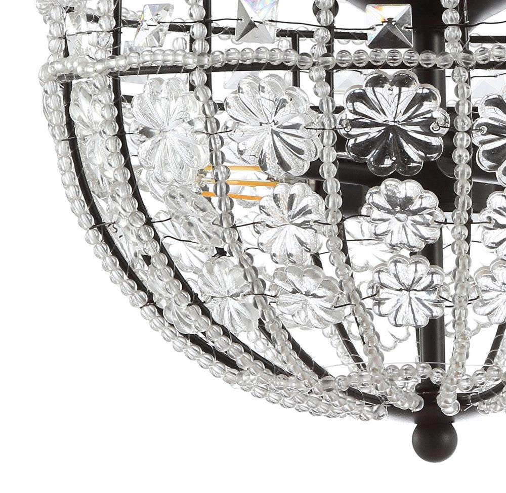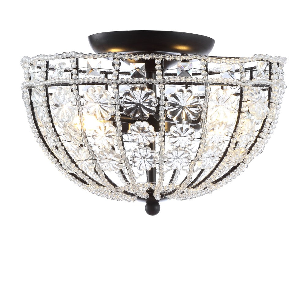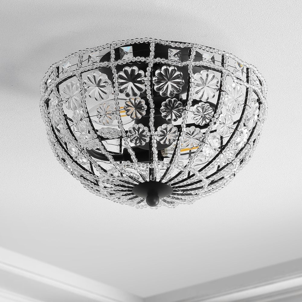 Add drama and sparkle to your ceiling with our modern, feminine semi-flush light fixture. Flower crystals are set into a crystal-covered black metal shade. This light fixture is a glamorous addition to your hallway, bedroom or bathroom. Two included LED bulbs provide plenty of light.