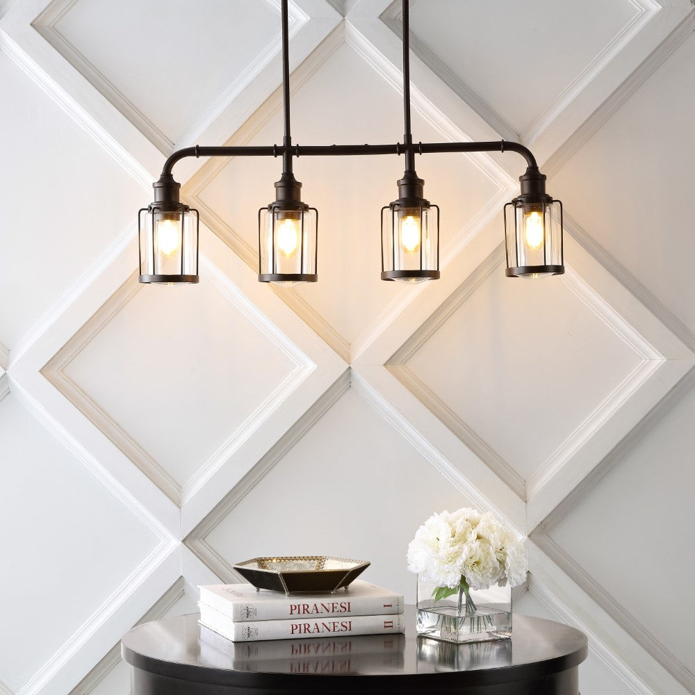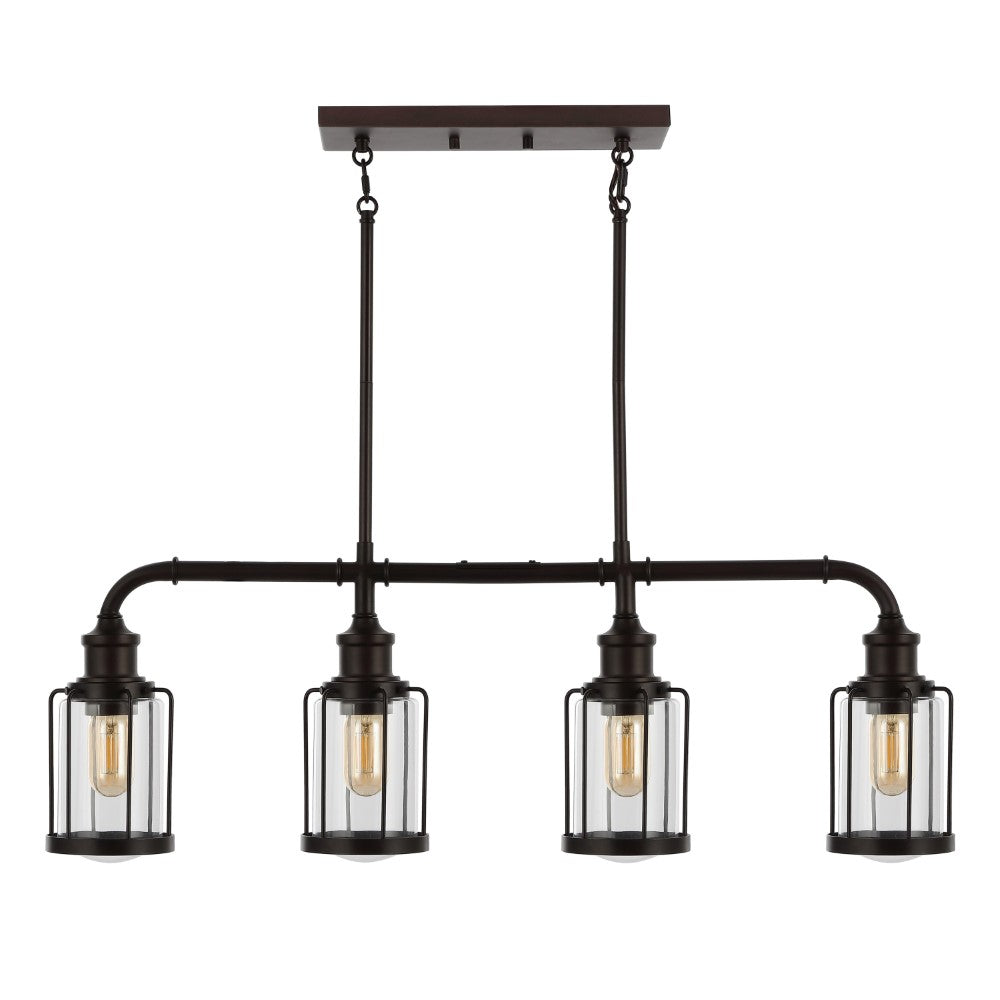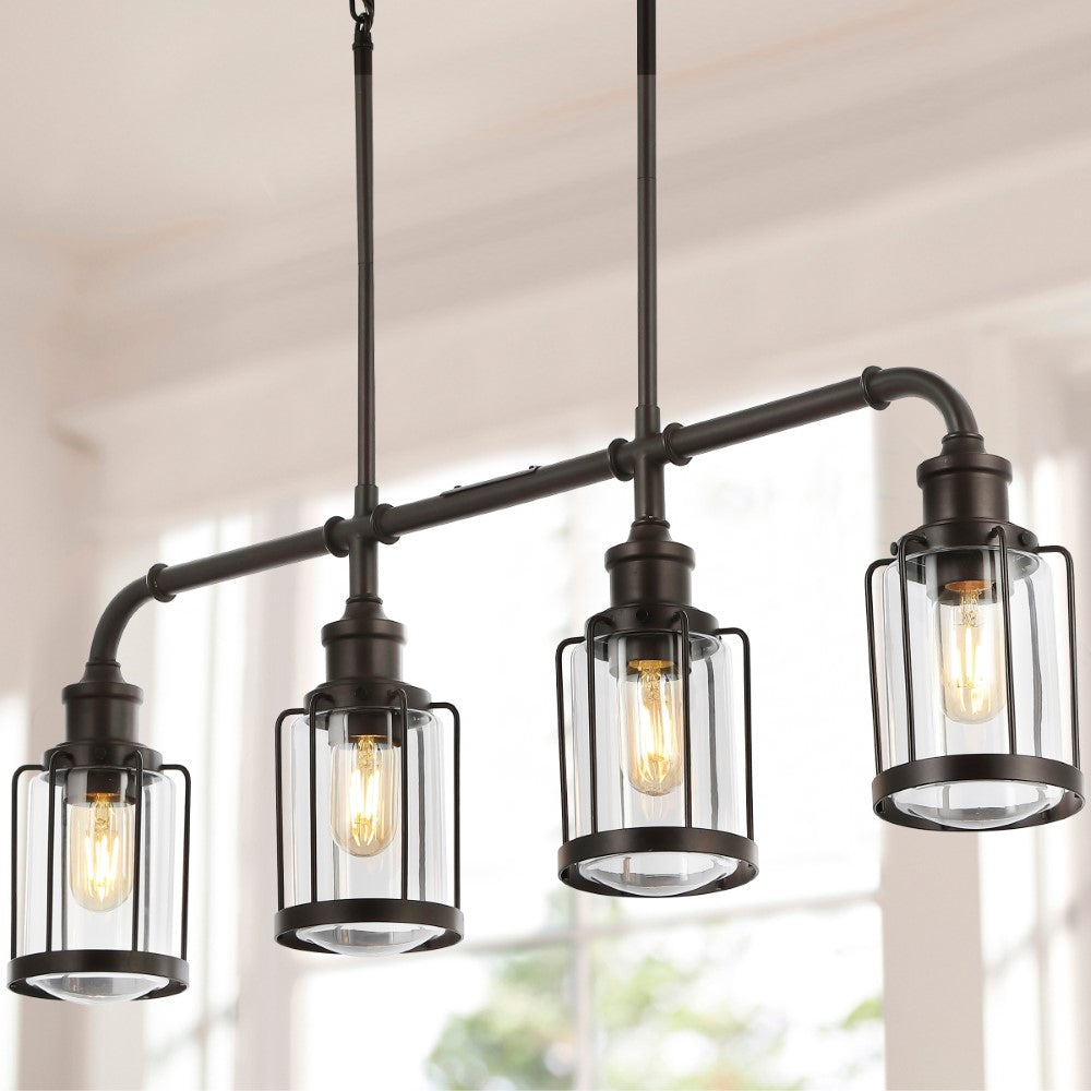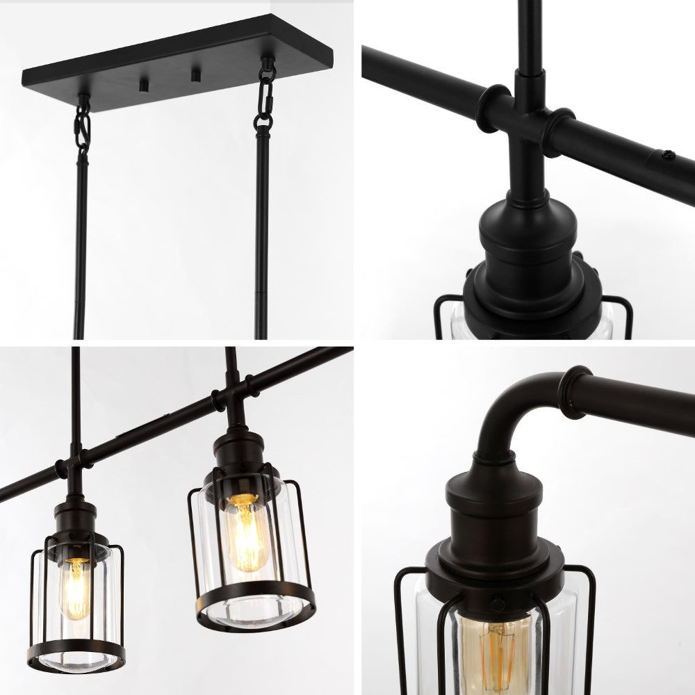 Vintage-inspired cage lights make this linear pendant an ideal choice for your modern farmhouse, rustic kitchen or industrial interior design. Perfectly sized for a kitchen island, small dining room, or home office, this unique pendant light is just under three feet long. Features a metal pipe frame and four Edison-style LED bulbs for bright, warm light.