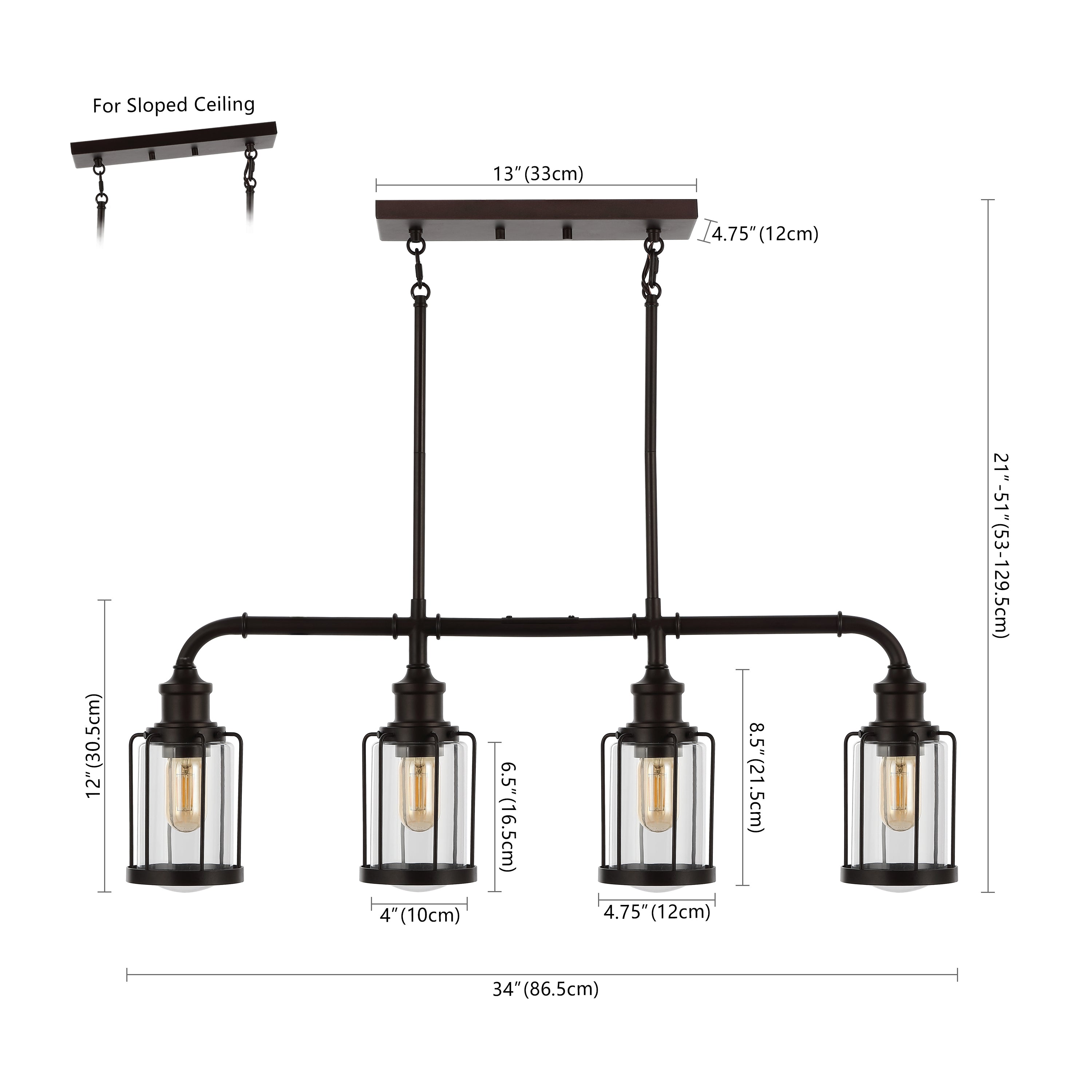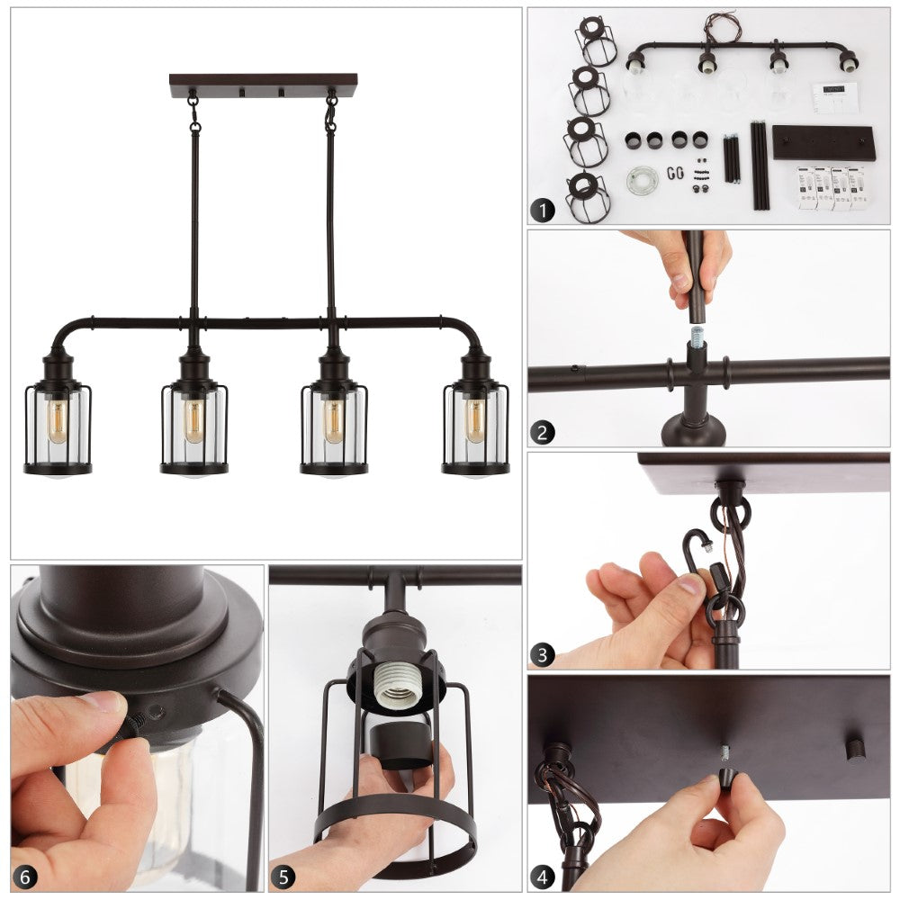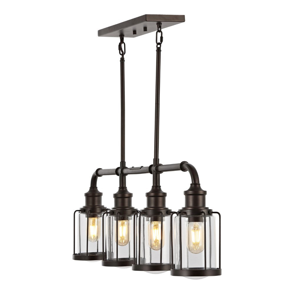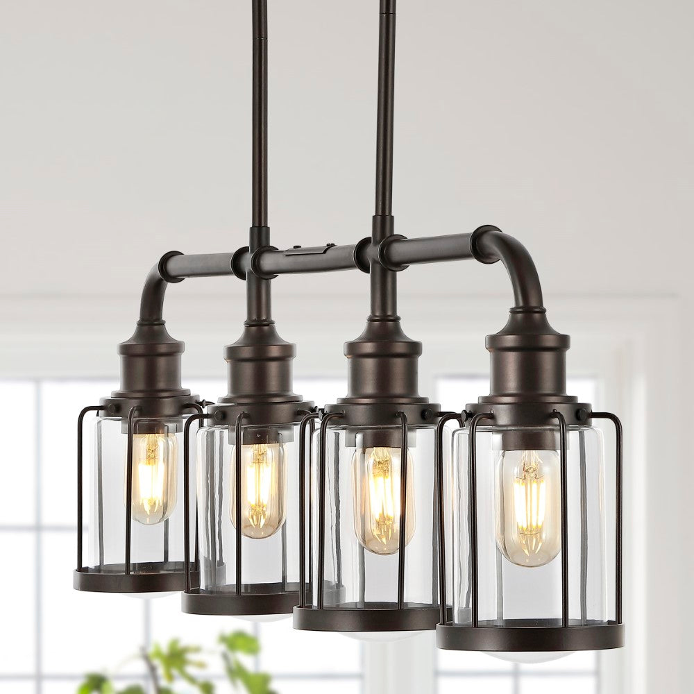 Vintage-inspired cage lights make this linear pendant an ideal choice for your modern farmhouse, rustic kitchen or industrial interior design. Perfectly sized for a kitchen island, small dining room, or home office, this unique pendant light is just under three feet long. Features a metal pipe frame and four Edison-style LED bulbs for bright, warm light.