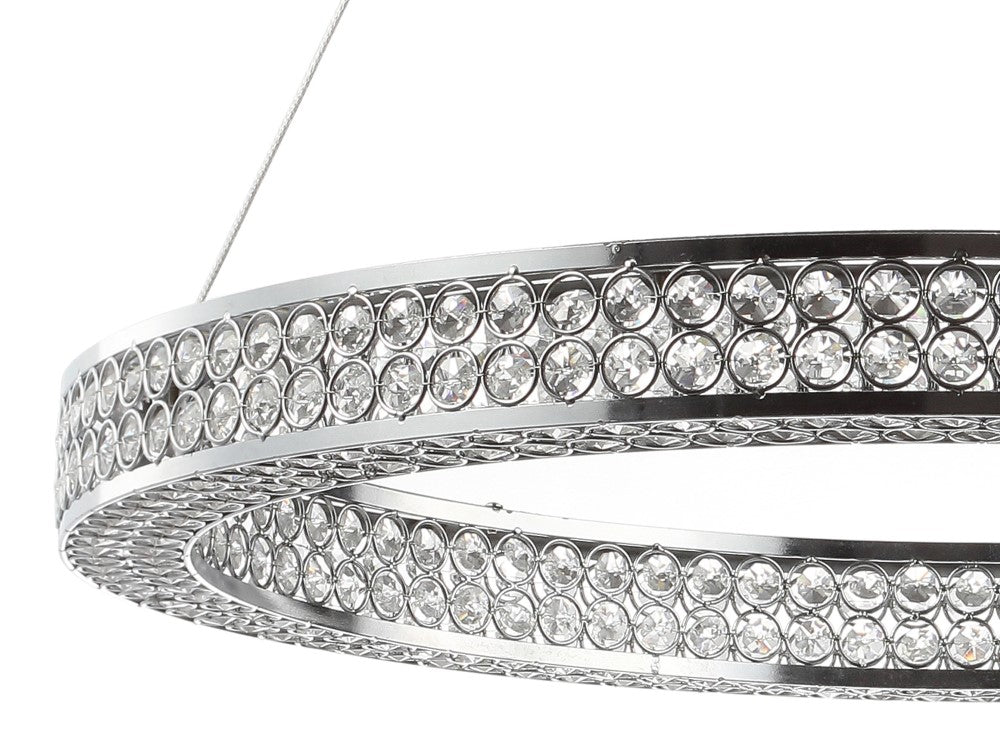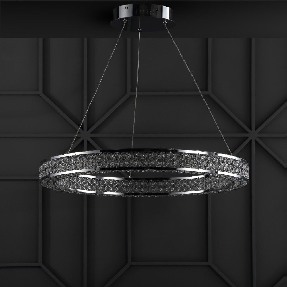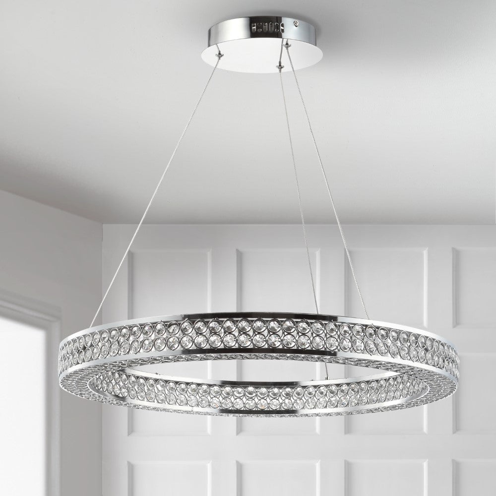 Designed to shine from any angle, this LED hoop pendant lends energy-efficient sophistication to any room. Beautiful over a dining table, this pendant boasts a bevy of faceted crystals arranged in a tight ring suspended from its ceiling plate. A chrome finish is the perfect contemporary accent for this lovely LED pendant.