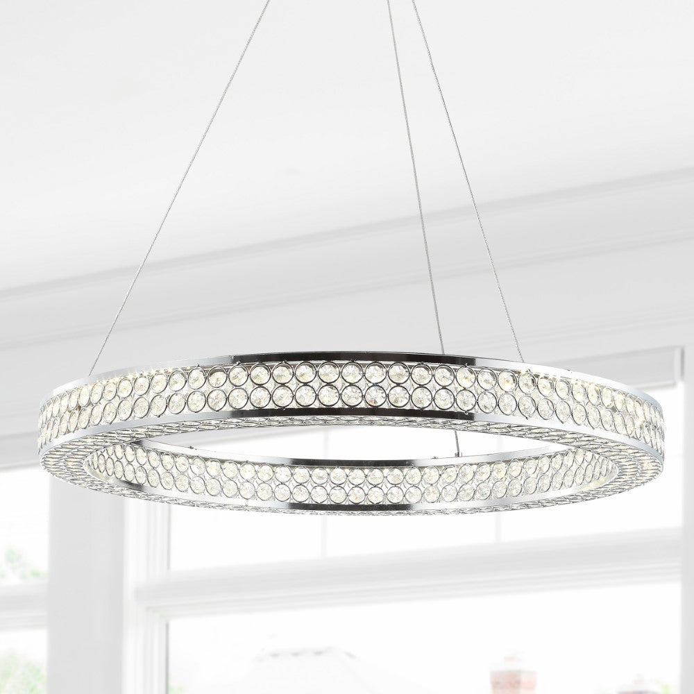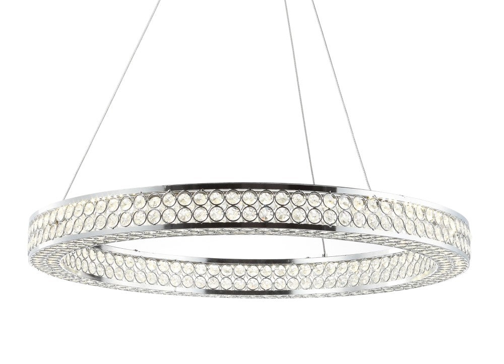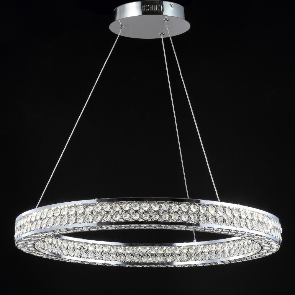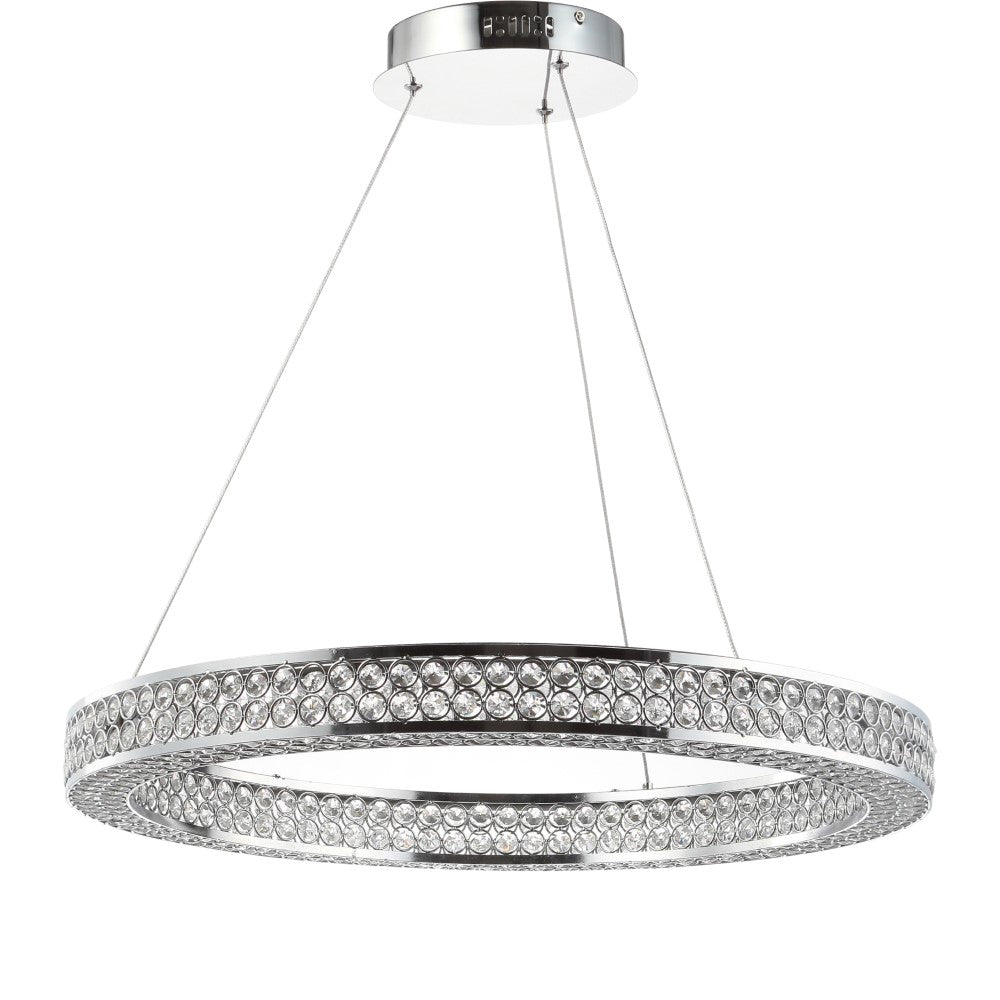 Designed to shine from any angle, this LED hoop pendant lends energy-efficient sophistication to any room. Beautiful over a dining table, this pendant boasts a bevy of faceted crystals arranged in a tight ring suspended from its ceiling plate. A chrome finish is the perfect contemporary accent for this lovely LED pendant.