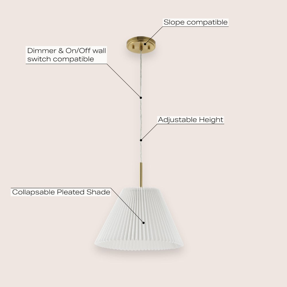 This classic pendant light dresses up any space with its vintage style pleated shade. Line them up over a kitchen island, bar, or dining table for classic style, or use them in a bedroom for a modern look. The LED bulb is dimmable with an LED-compatible dimmer switch.