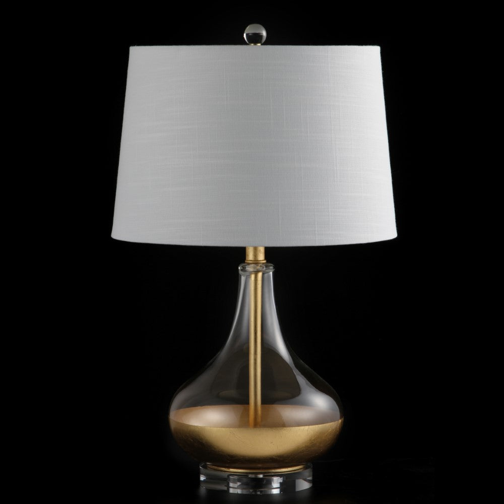 Crafted of gold-leafed glass with a simple white linen shade, this sleek table lamp is stunning in its sheer simplicity. But simple doesn't mean standard, luxury is in the details with a silk-wrapped cord and crystal finial. Dress up your nightstands with a matching pair, or gild a dark corner in your living room with this gorgeous piece.