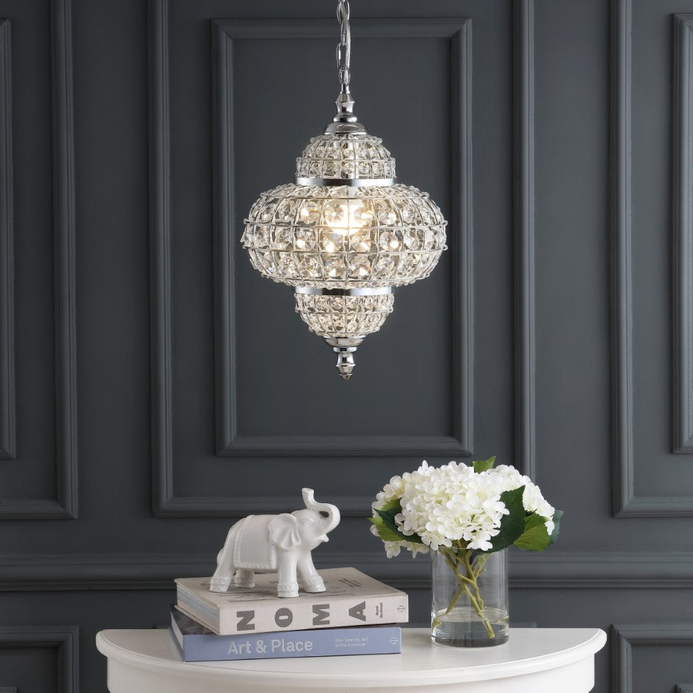 Moroccan quatrefoil lanterns inspired the shape of this stunning chandelier, which finished in crystal is elegant and glamorous. The chain is adjustable, allowing maximum versatility for any ceiling height. We love hanging a trio at different heights in a foyer or a single over a seating nook for a lux look.