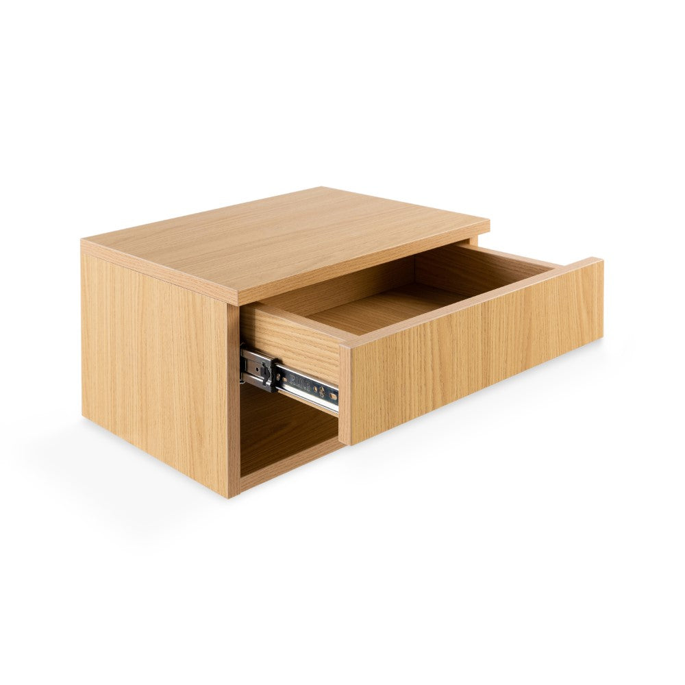 - Easy to install, this minimalist bedside table has a soft-closing drawer for essentials, built-in cable hole for convenient wire management, and an open shelf for books