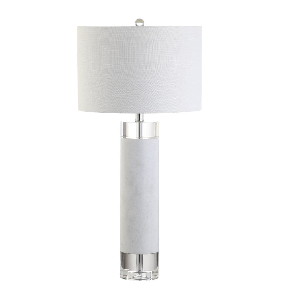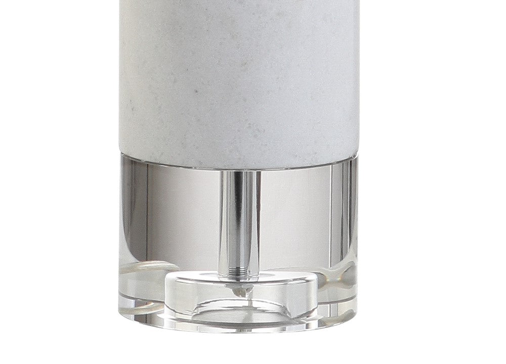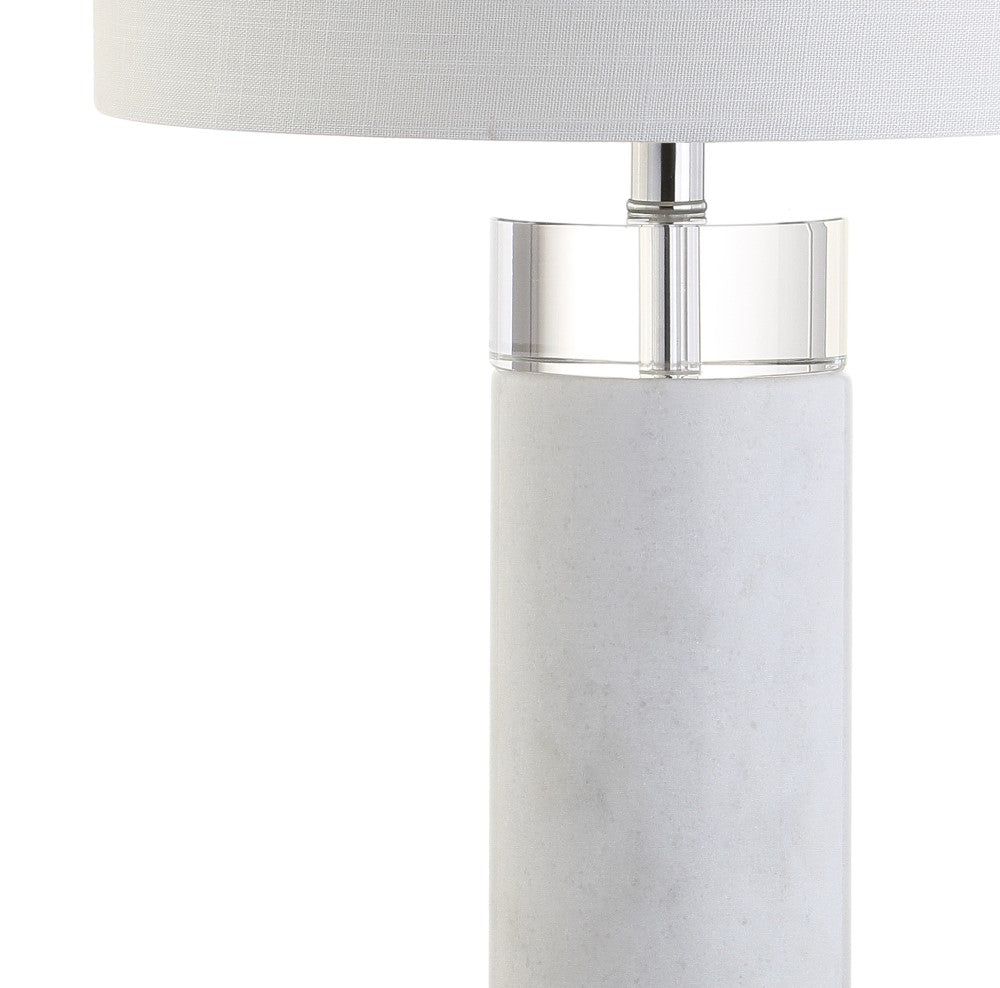 Stunning in its simplicity, this cylindrical column of white marble and crystal makes a modern statement in any room. Topped with a crystal finial and cotton drum shade, its classic style extends all the way to the plug with a silk-wrapped cord. Having achieved the quality and safety standards to be UL-certified, this piece is an heirloom-worthy classic.