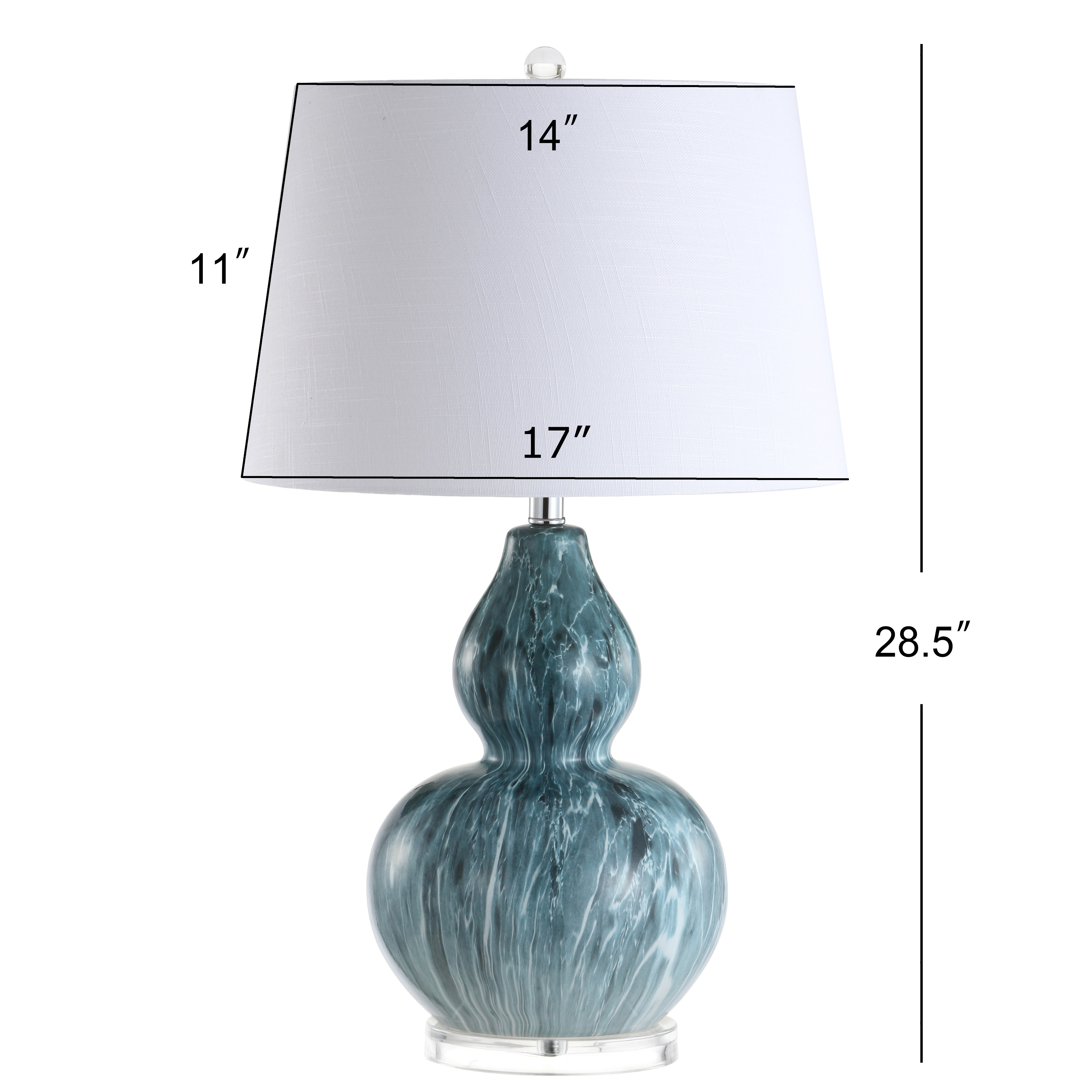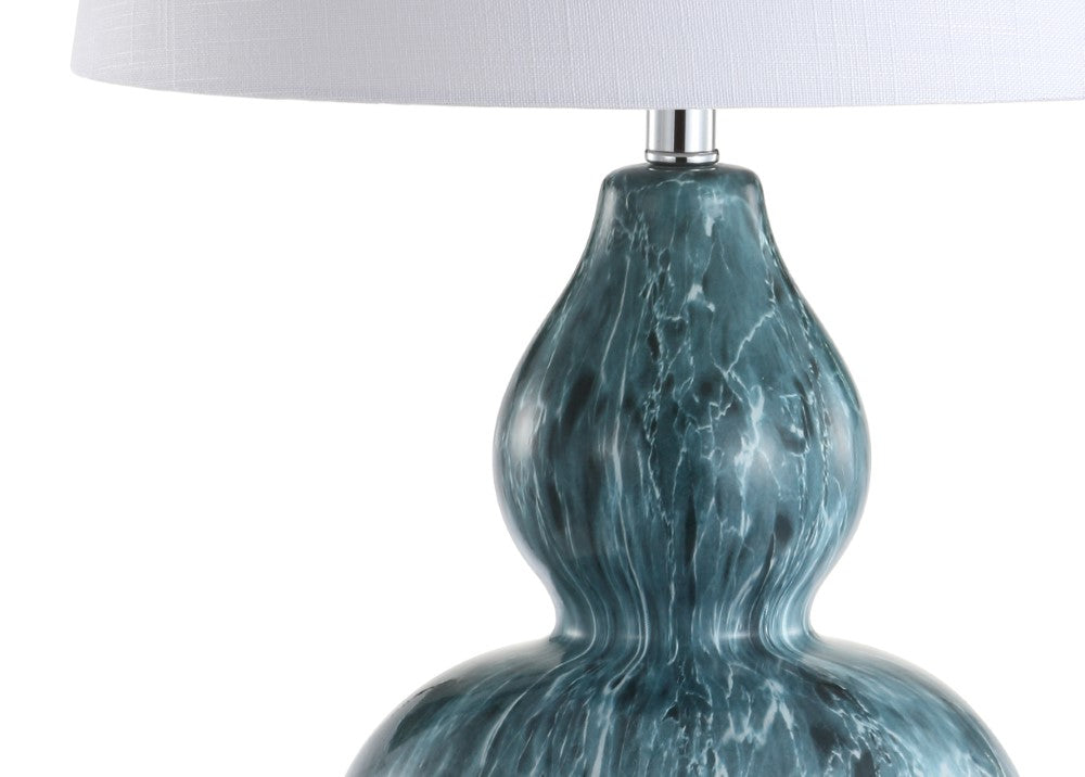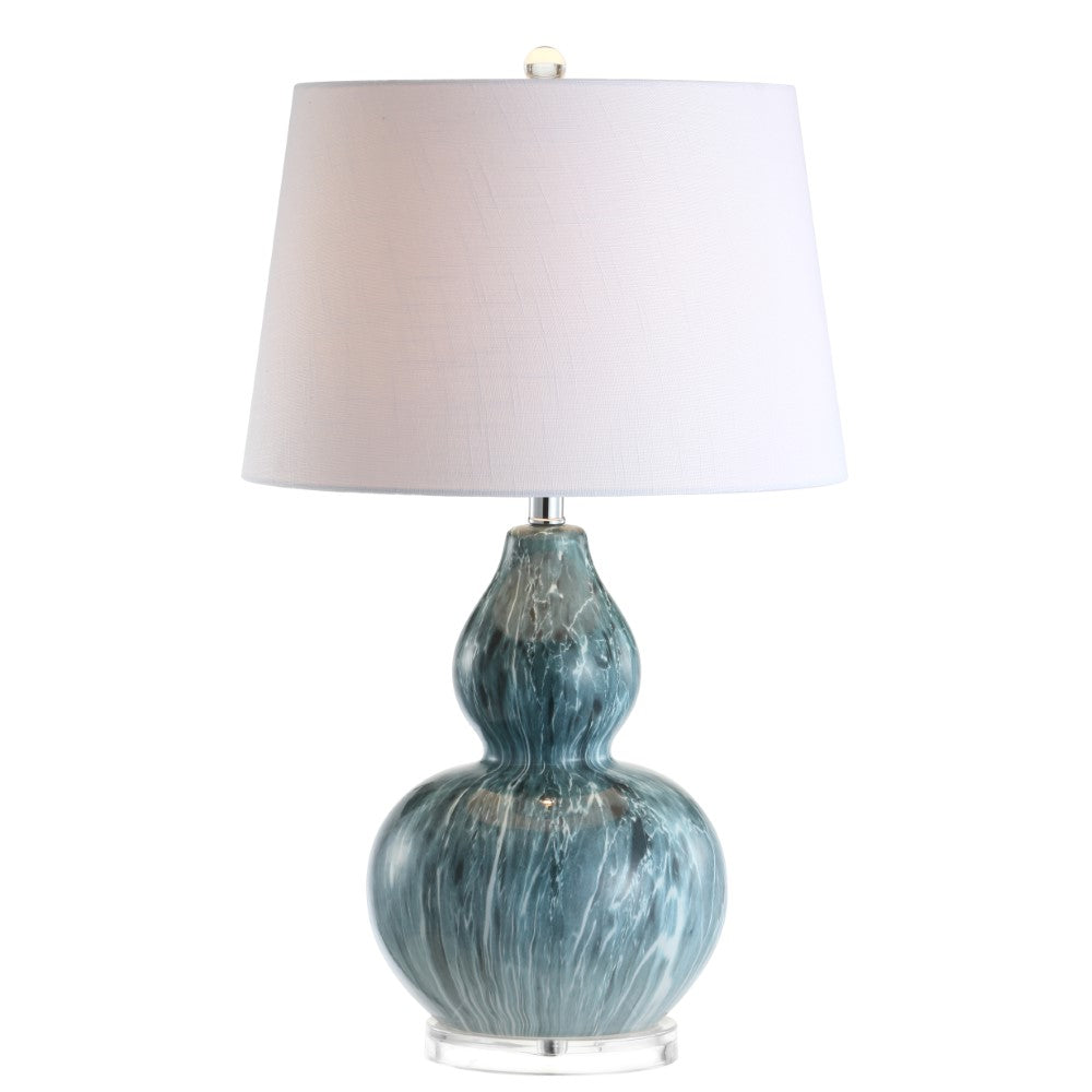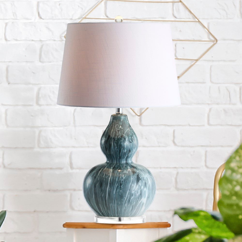 In a gorgeous reactive glaze that gives a marbleized effect to the surface, this gourd-shaped table lamp is sure to stun in any room. Featuring a contemporary pedestal made from acrylic and white linen drum shade, the modern updates to this classic shape stun from every angle. We especially like the silk-wrapped cord, which is so beautiful that you'll want to make sure it is on display!