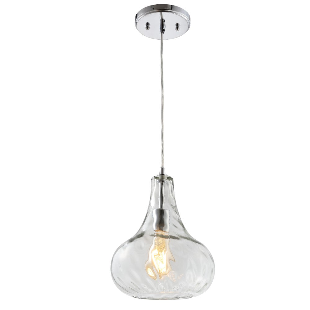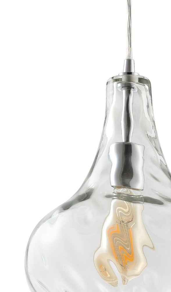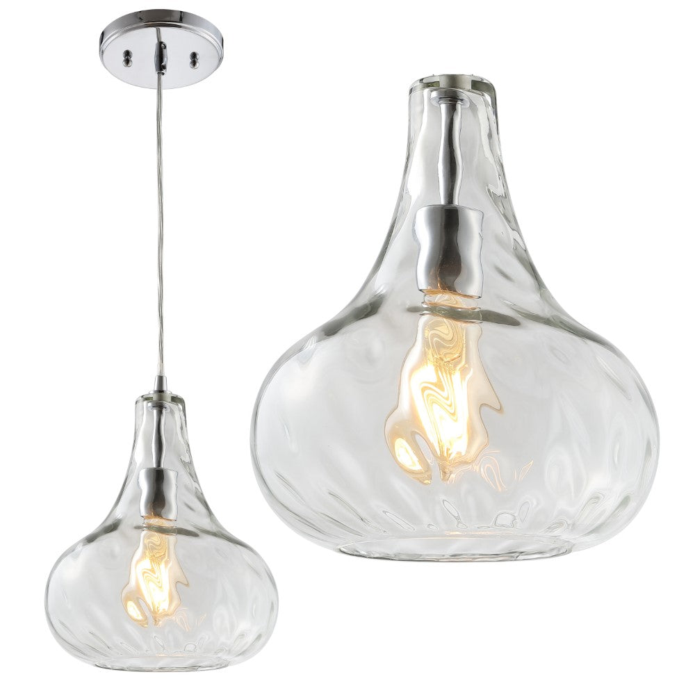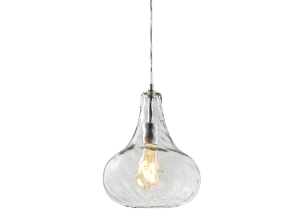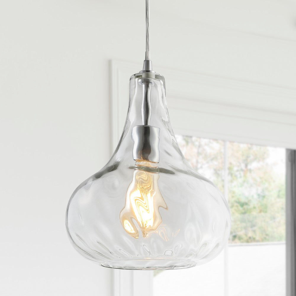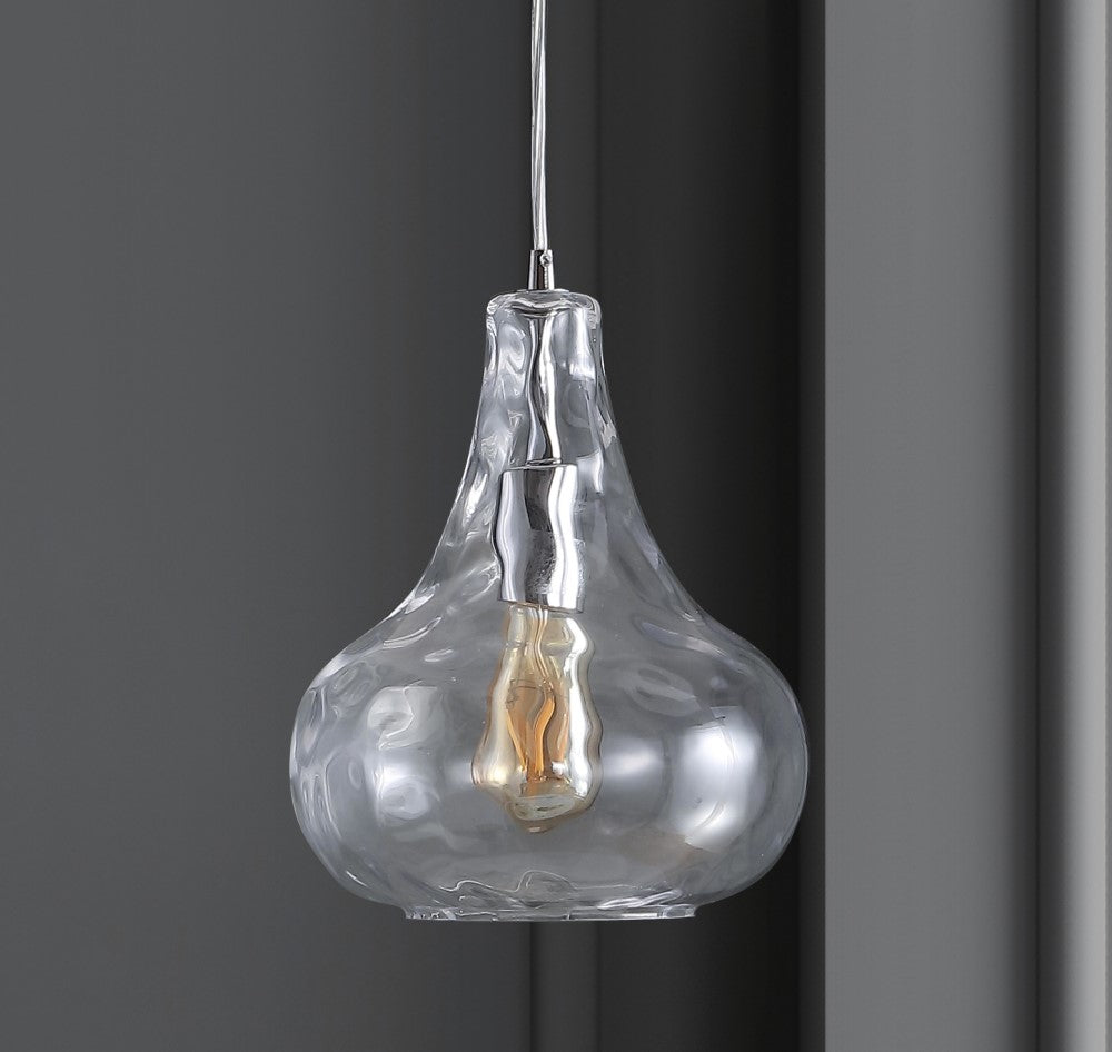 After seeing the masterpieces created by the glassblowers of Venice, our artisans were inspired to create a Murano-effect through a texture of their own. The result, this gorgeous twirled glass shade in a teardrop silhouette, is both elegant and modern when combined with chrome hardware. You'll love the watery glow when illuminated, a softer way to use a glass shade since the bulb is only semi-visible.