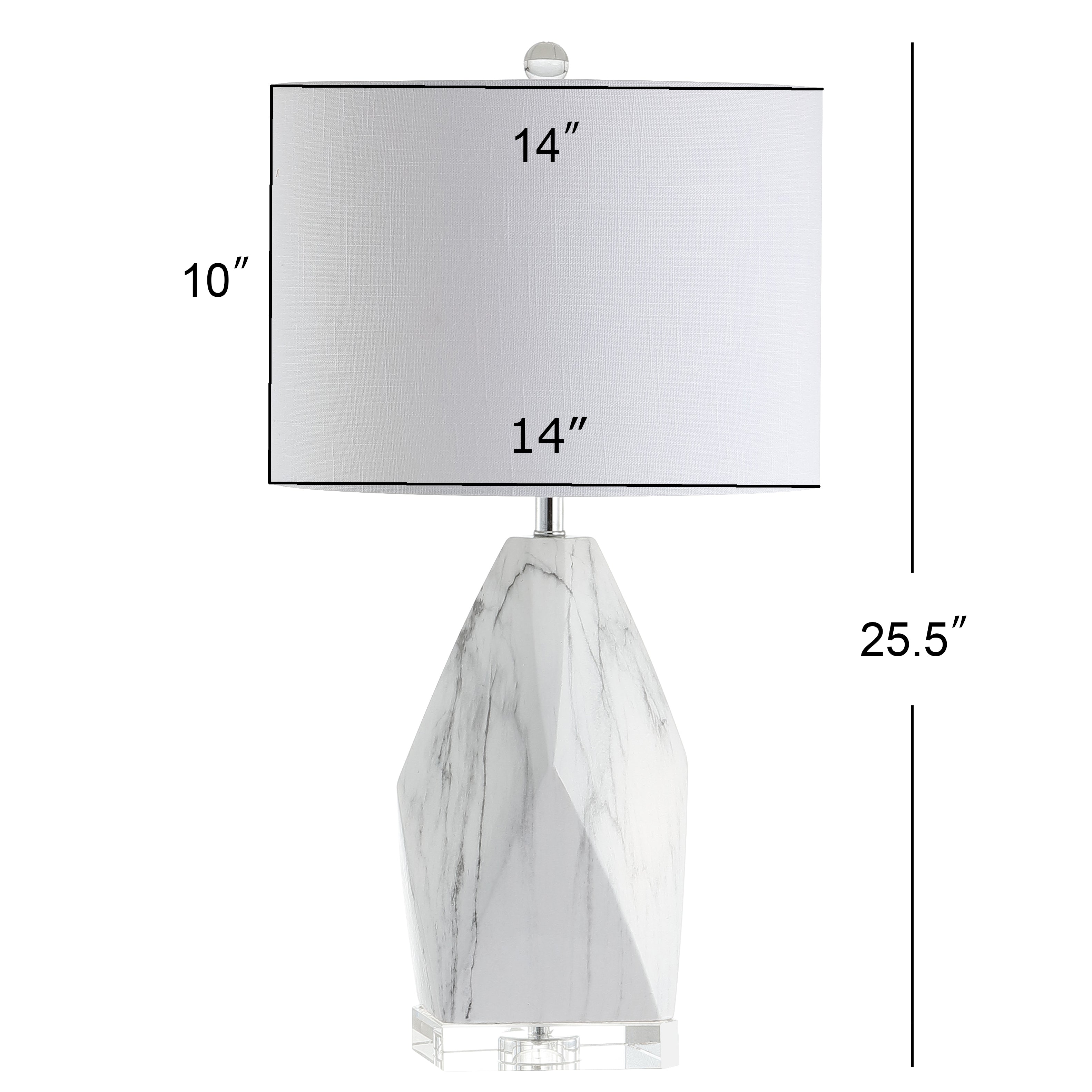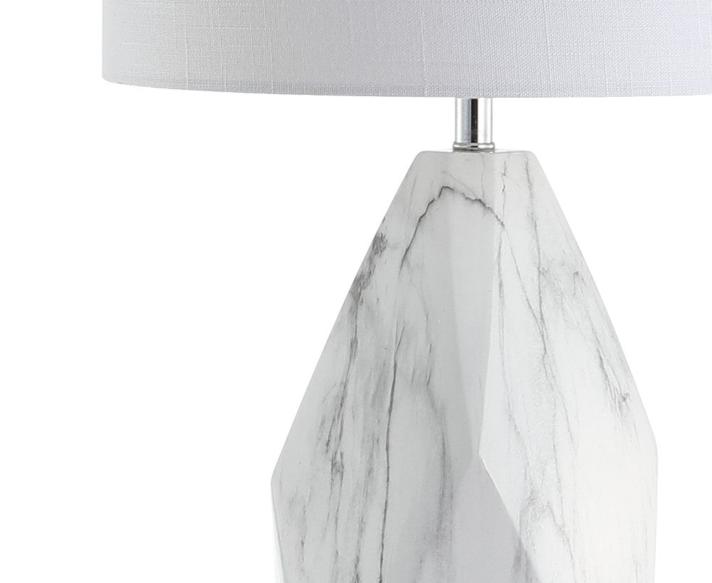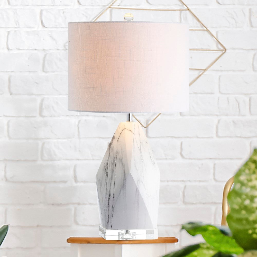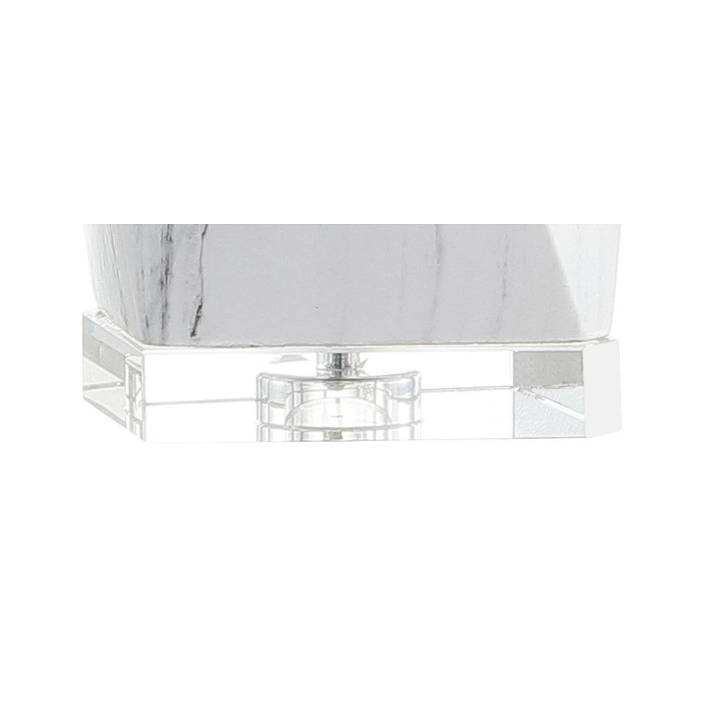 Modern and eye catching, this chic table lamp features an elegant light marble base atop a crystal pedestal. Created with a special glaze process that creates a soft marble-like effect on the faceted ceramic shape, this piece is a modern interpretation of a neoclassical inspiration. The white fabric shade diffuses soft light into any living space, in contrast to the geometric edges of the lower design.