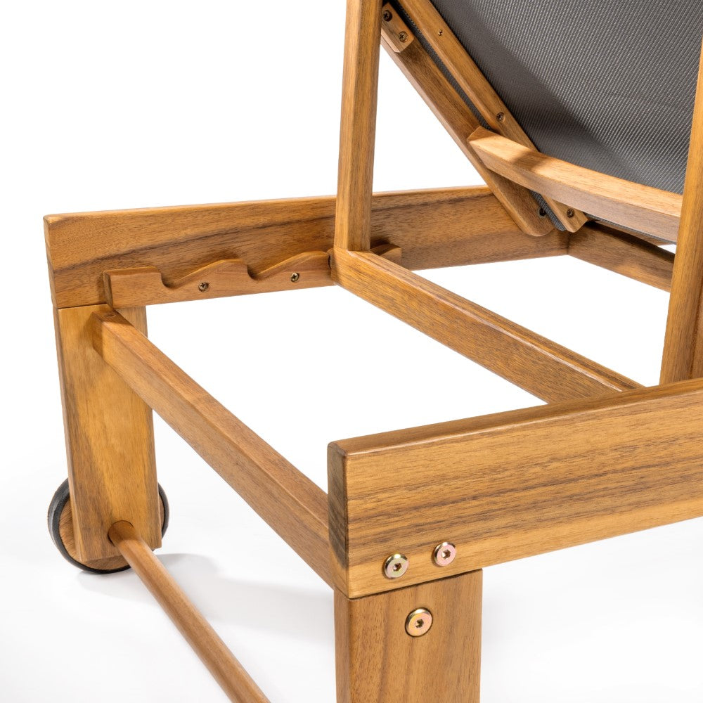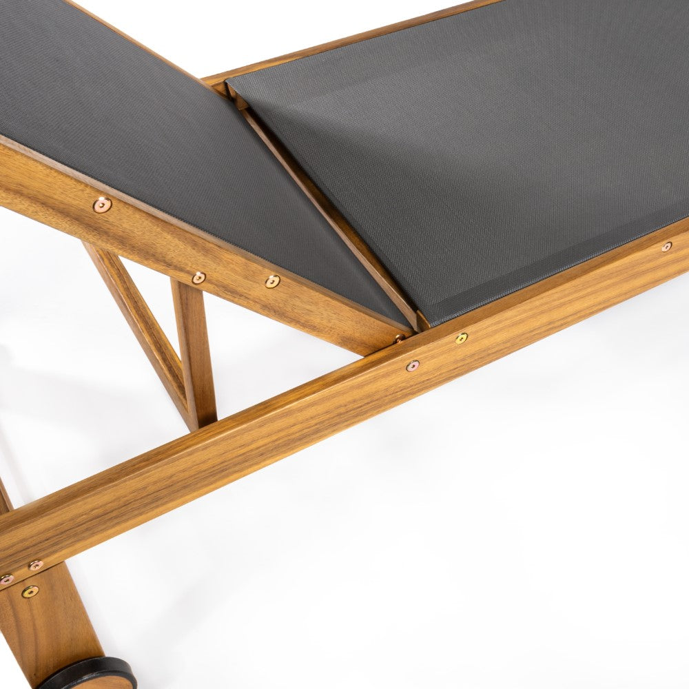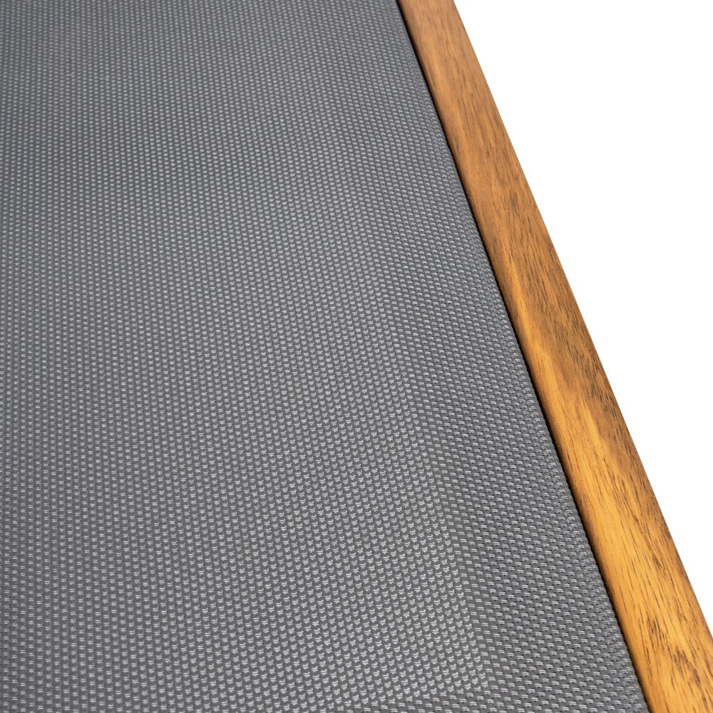 - Solid wood is treated with a teak oil finish for a natural wood look; fabric is outdoor Textile mesh in dark gray