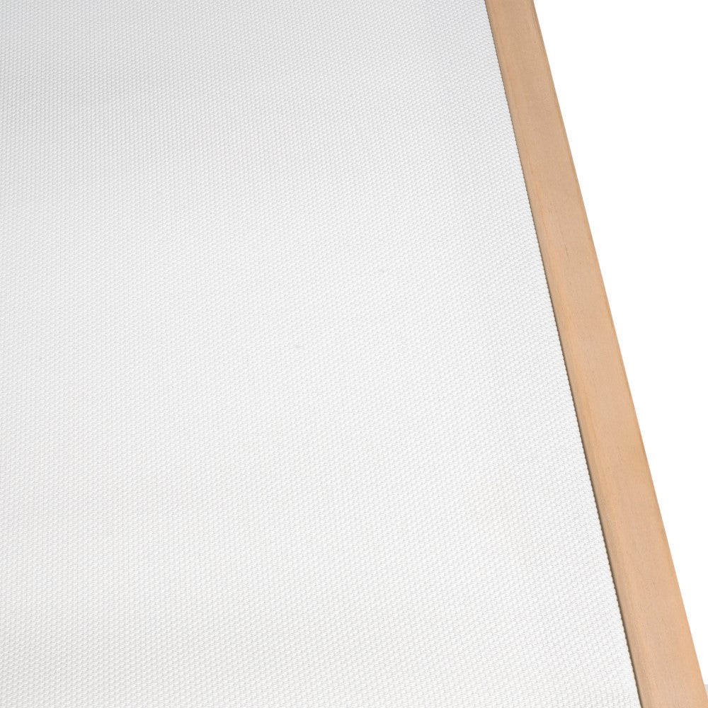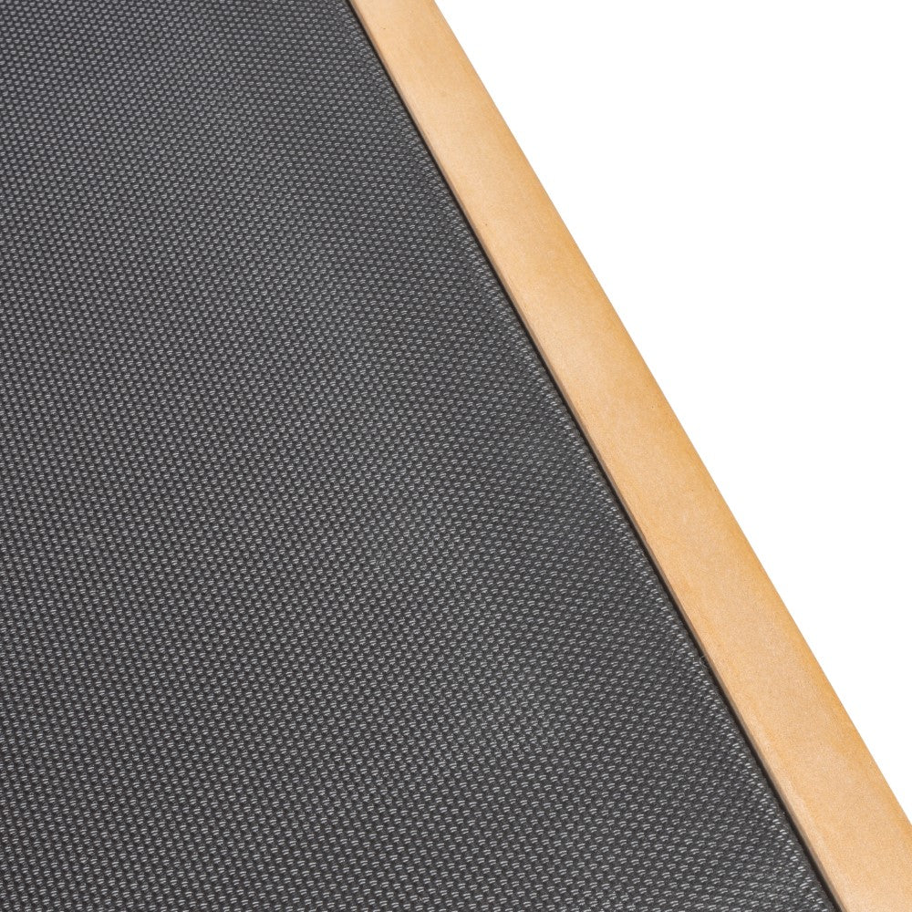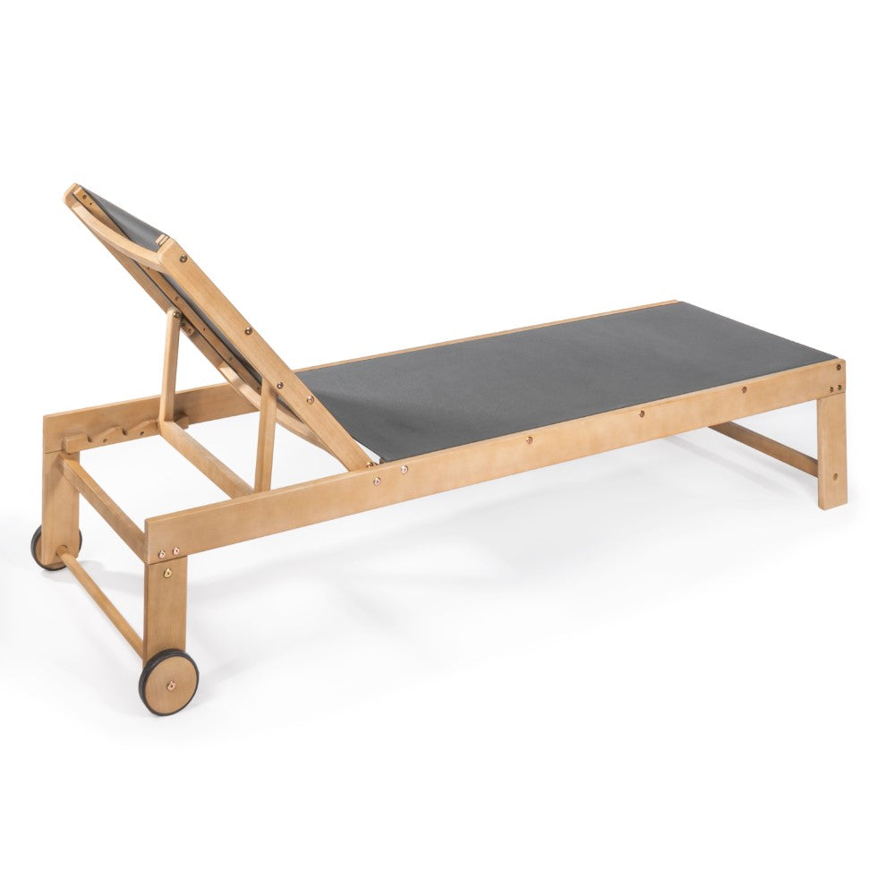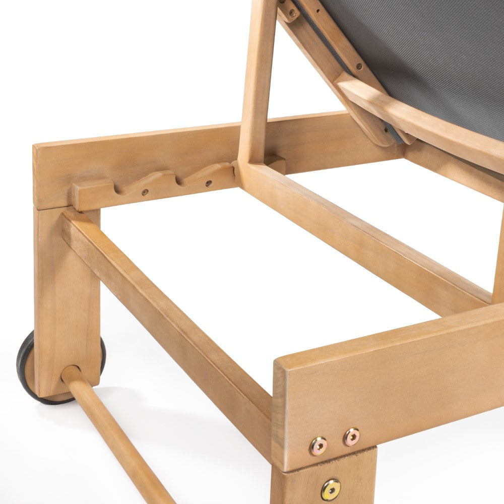 - Solid wood is treated with a teak oil finish for a natural wood look; fabric is outdoor Textile mesh in dark gray