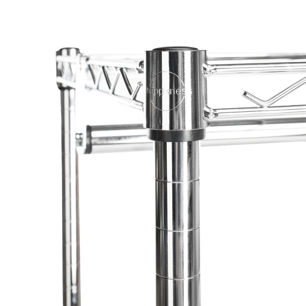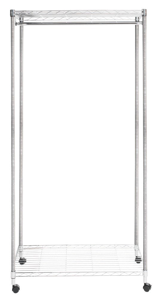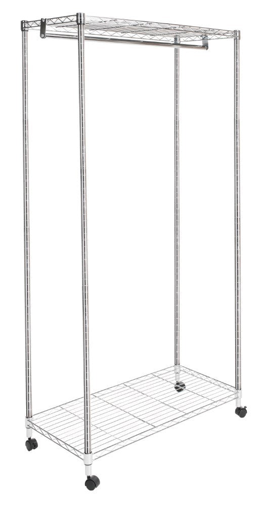 This coat and clothing rack is an attractive solution to garment storage. The durable frame is made from chrome plated steel which minimizes dust and resists denting, chipping and rusting so that your wardrobe rack looks as chic as what you hang on it. With two wire shelves for storing boxes or accessories and casters for easy rolling around the house, this garment rack is the perfect solution for the fashionista with limited closet space. Best of all, it's easily assembled when needed and taken apart for storage when not in use.