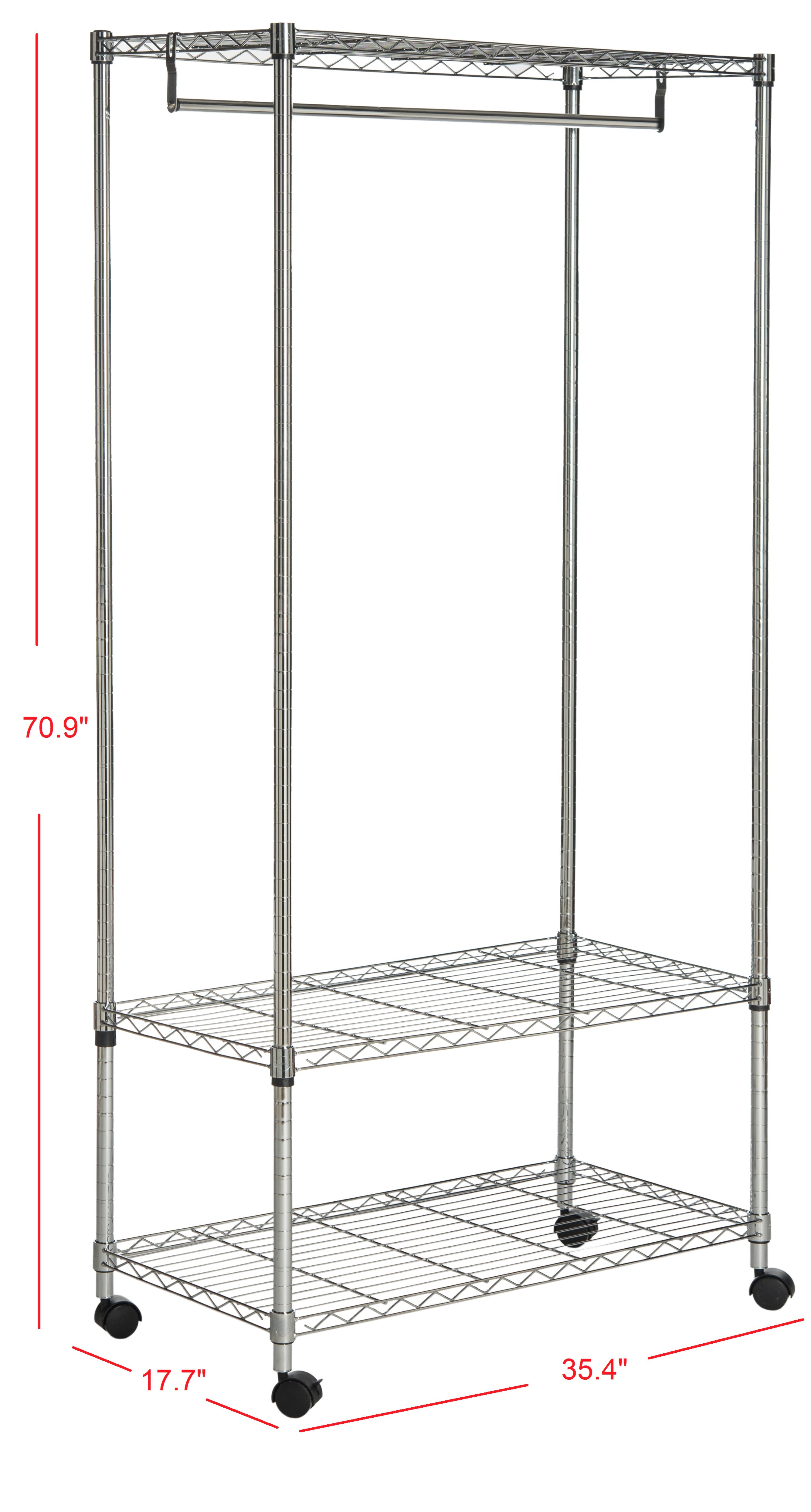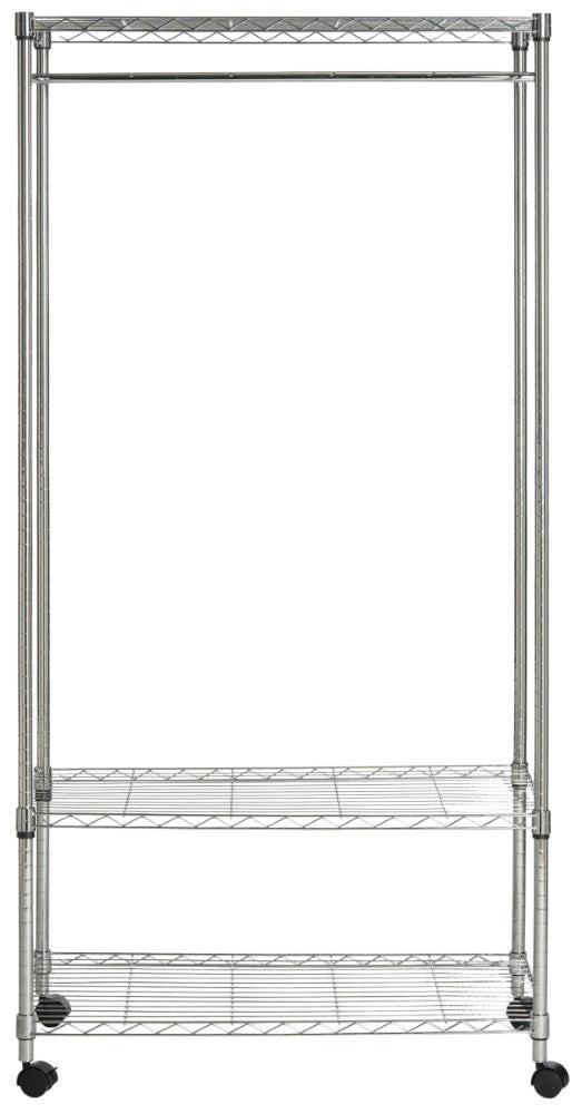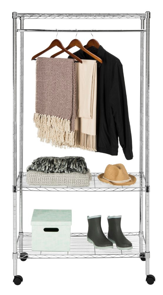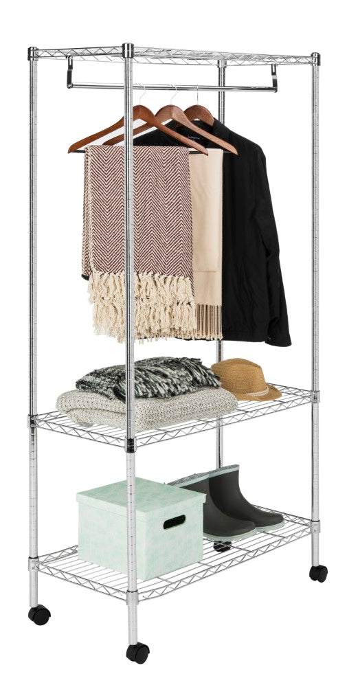 When closet space is tight, but you can't resist adding to your wardrobe, this versatile garment rack rolls to the rescue with a coat rod, two shelves and nearly three feet of storage. The easy-roll casters make it simple to push from room to room, simplifying organizational projects and rotating your wardrobe with the seasons. With its chromed-steel construction and sturdy frame, our garment rack is easily assembled to hang your blouses and shelve your sweaters before the weather gets chilly.