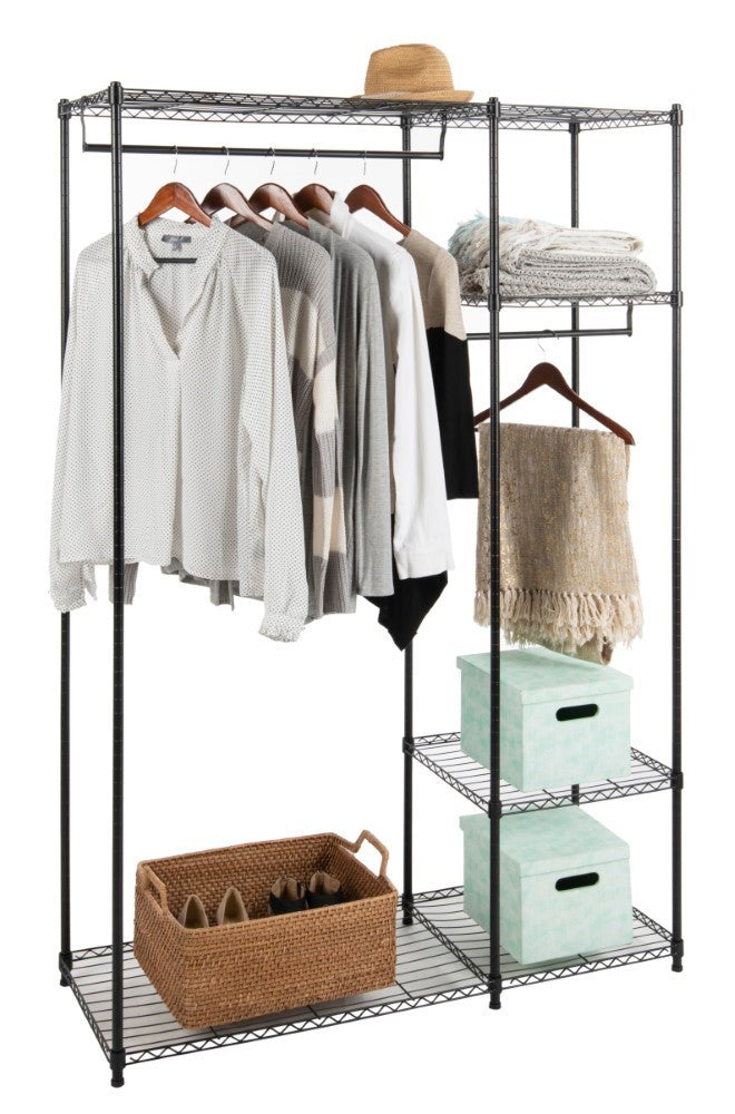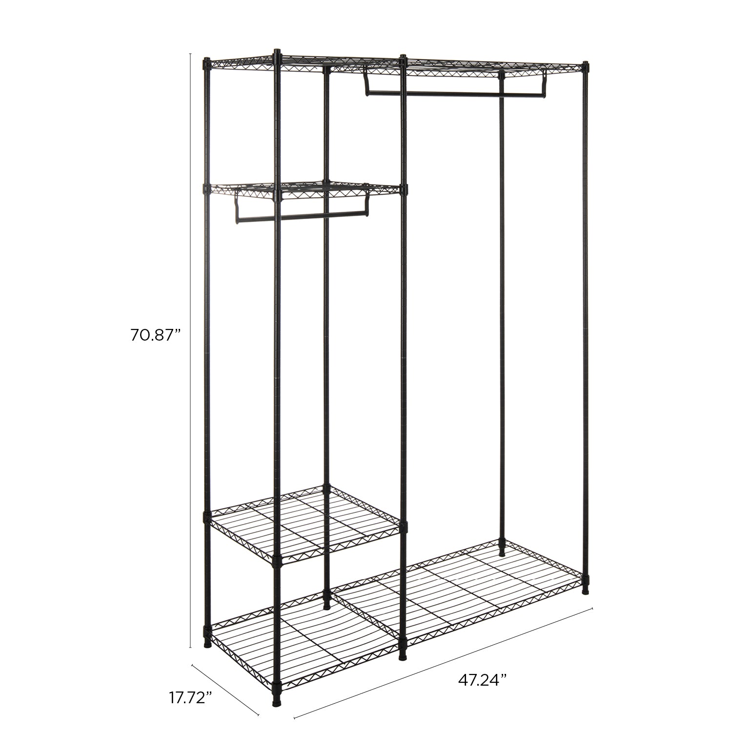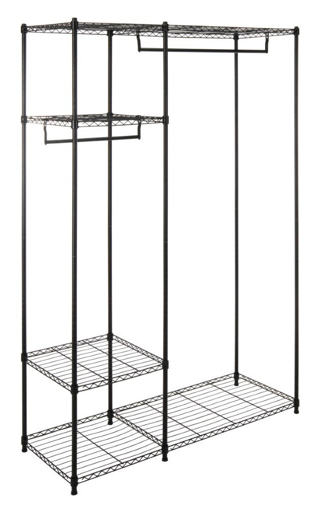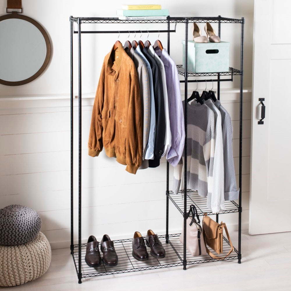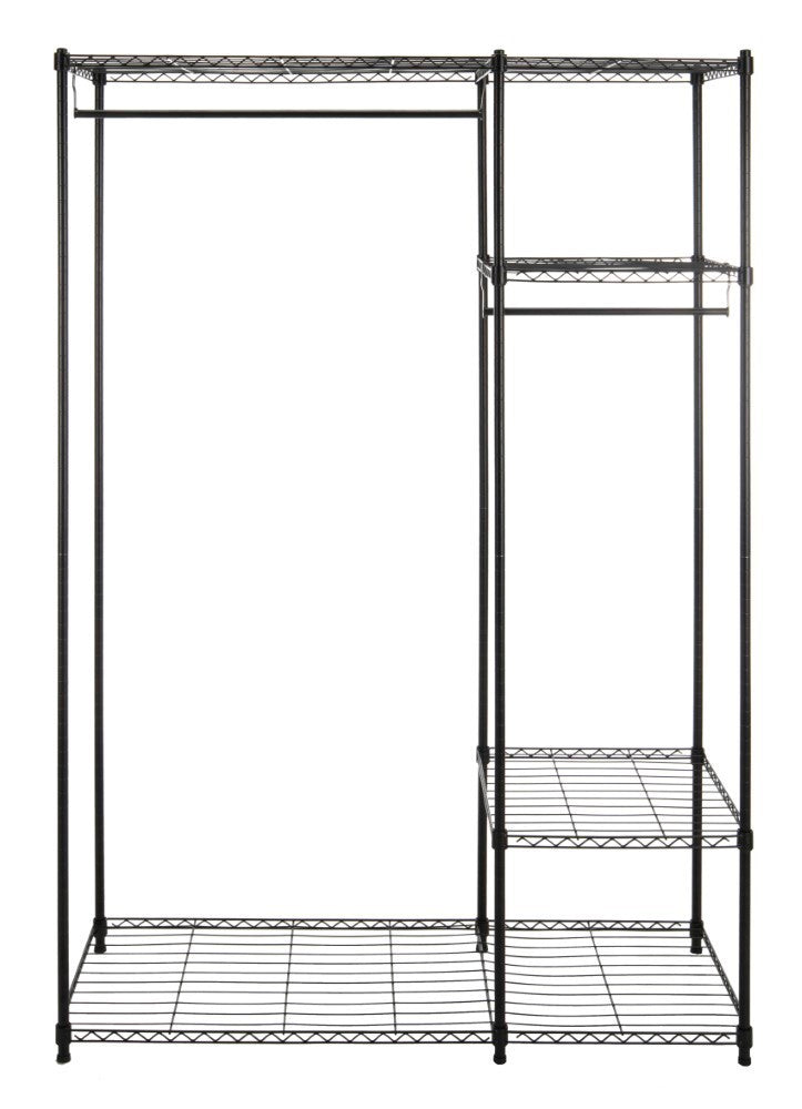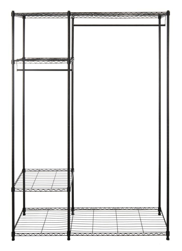 Whether a solution for an overflowing closet or no closet at all—solve your storage conundrums with this adjustable free standing closet. The open design allows for maximum visibility, and the flexible combination of four shelves and two garment bars allow for a variety of configurations to instantly organize clothes, shoes, and accessories. Constructed of sturdy steel with a rust-resistant black finish, this wardrobe is easily assembled without tools and will be ready to display your dresses in minutes.
