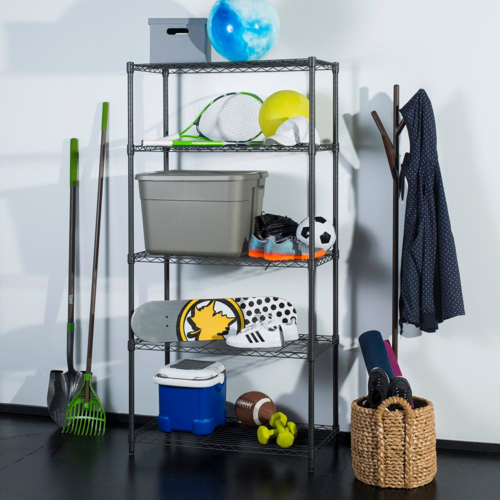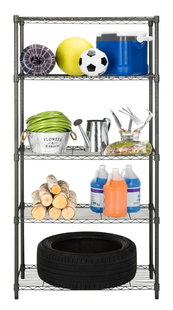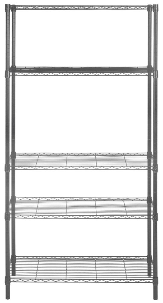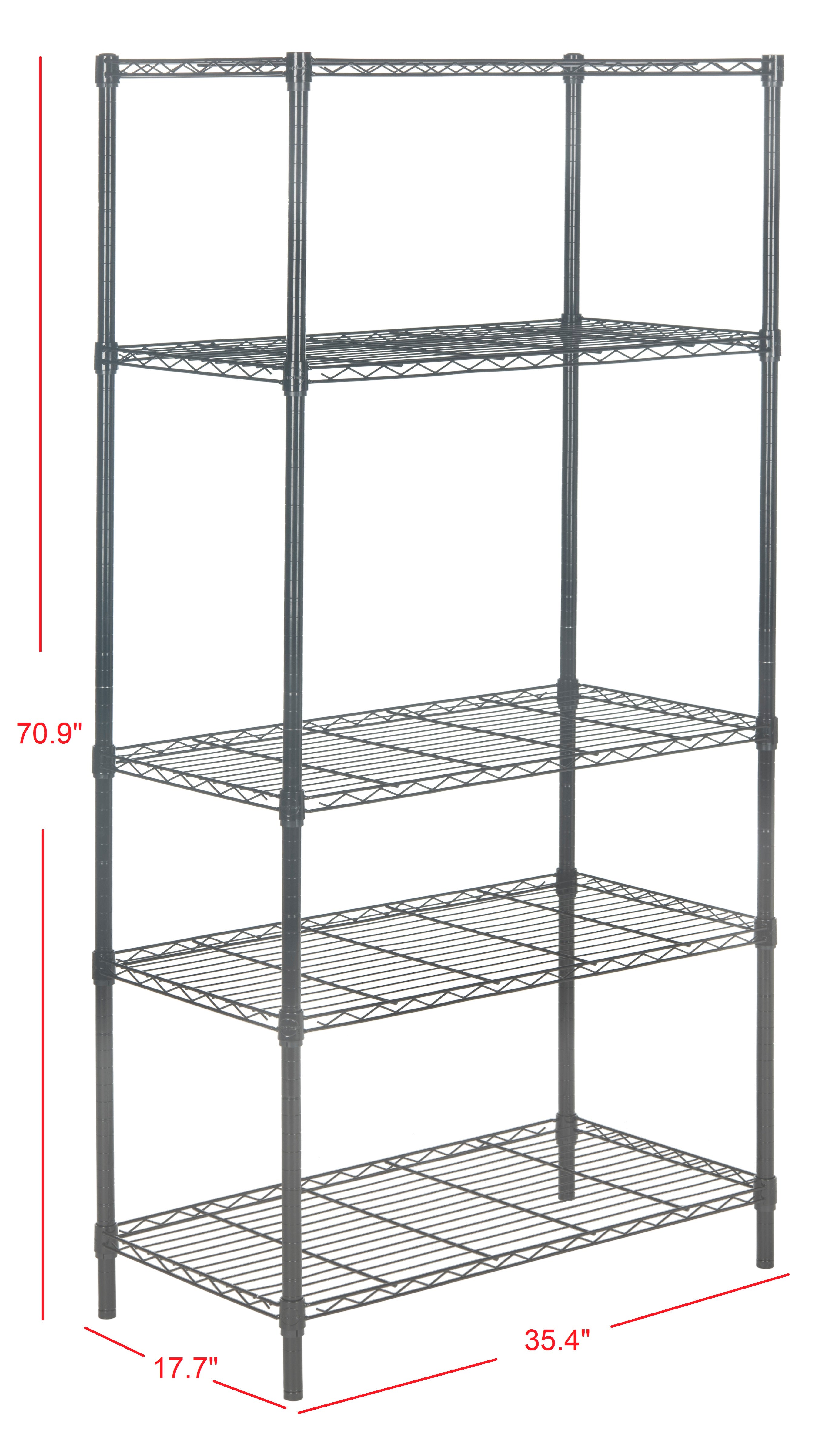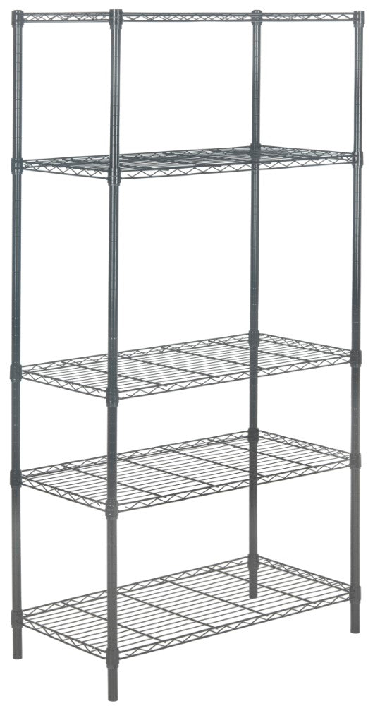 This dark gray, 5-shelf steel rack is a versatile solution for your lighter-weight storage items – off-season clothing, hat or shoe boxes, luggage, or toys. Its ideal scale matches the versatility of utility – 71” high and only 18” deep. It is ideally sized for closets and pantries, but thanks to its epoxy coating, would also be suitable for covered outdoor use such as in a garage or shed where humidity would ordinarily corrode the frame. The slim lines and geometric shape maximize capacity for all your storage needs.