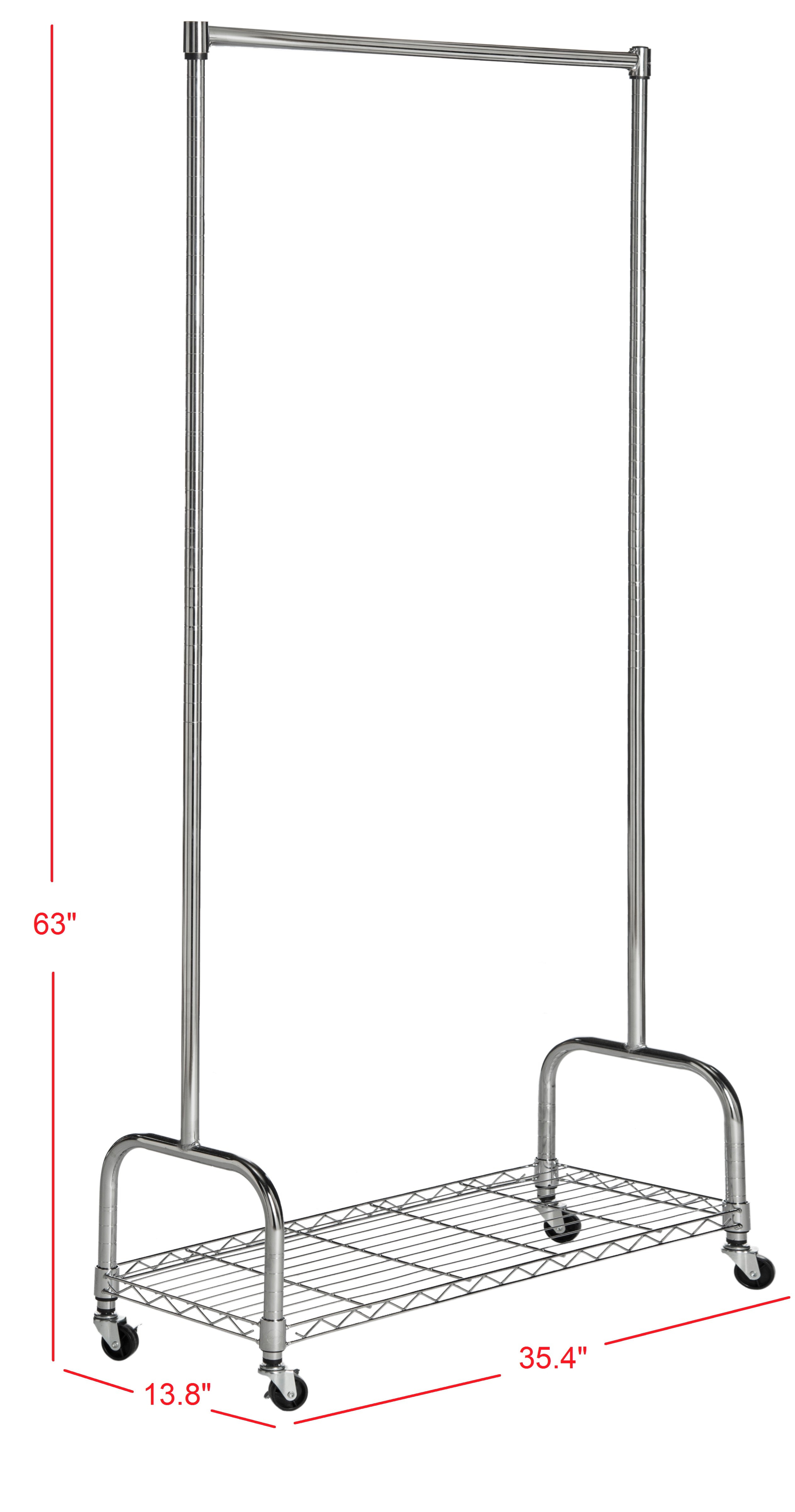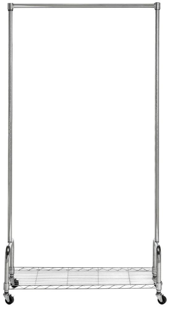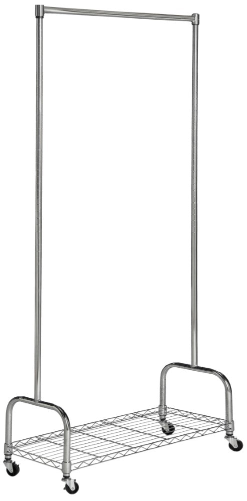 This chrome garment rack is a versatile solution for off-season clothing, extra coats, or sports apparel. With a bottom shelf for hats or shoes, it doubles as a guard to keep long garments from dragging on the floor as you push the rack into and out of storage.