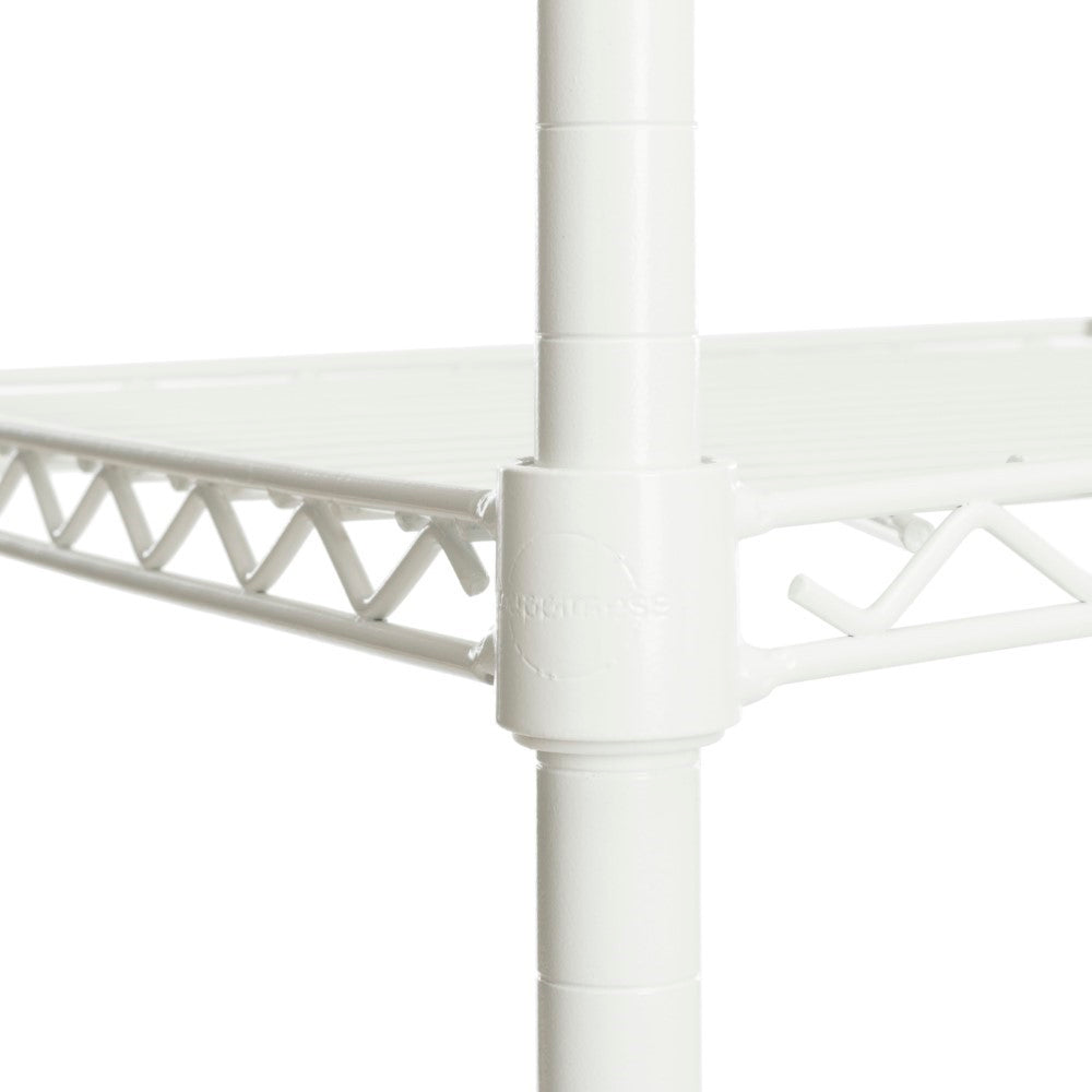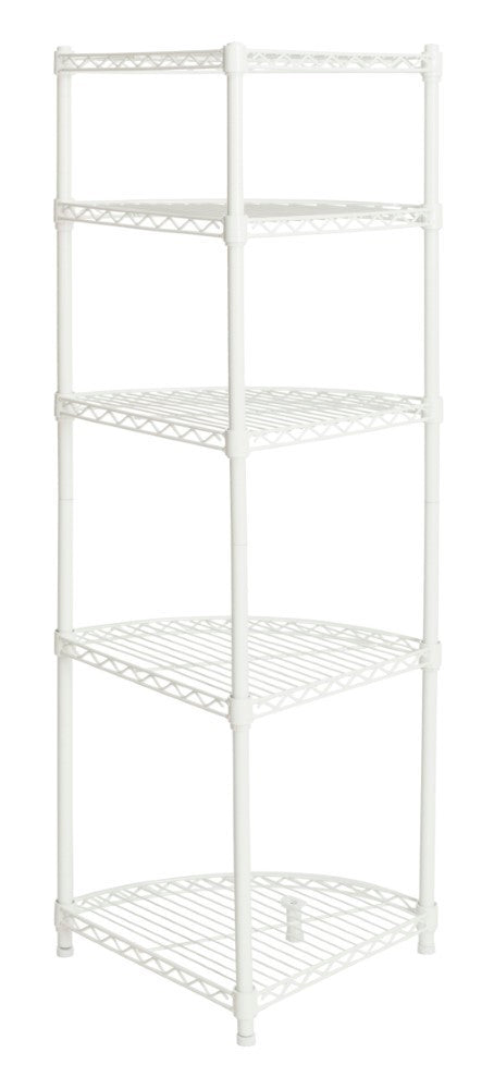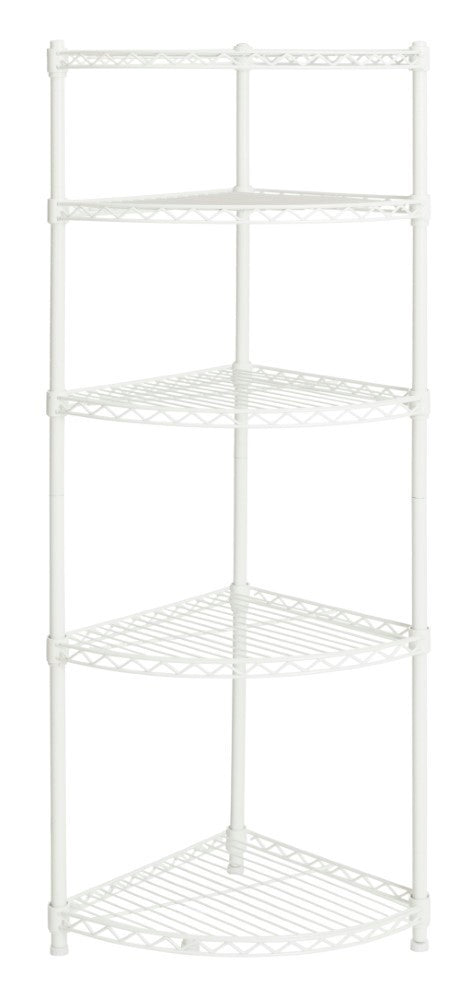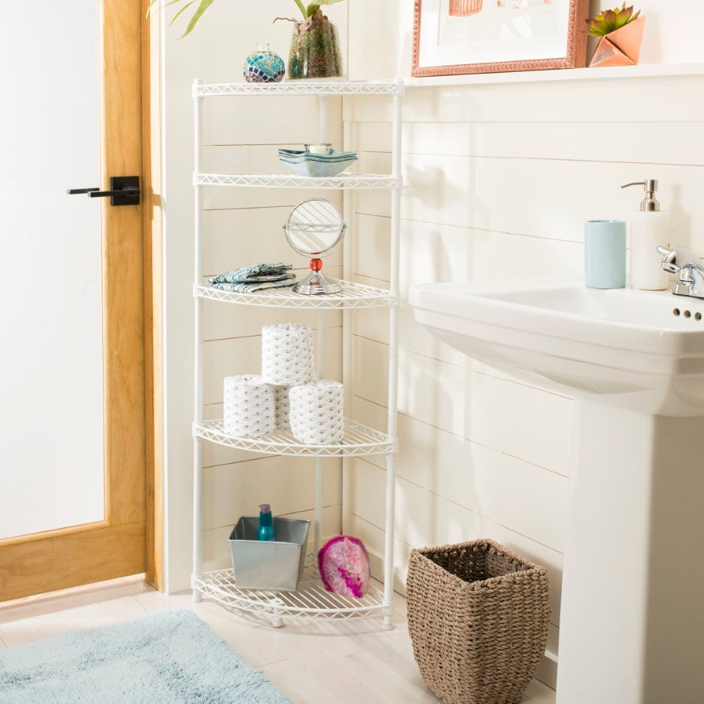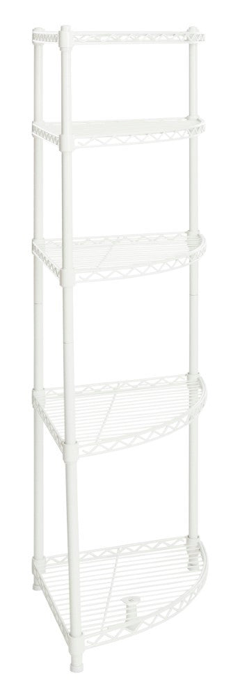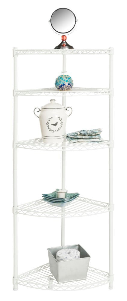 A silhouette often found in 18th-century antiques, the classic corner table gets a modern makeover for storage in this white-steel storage rack. The five shelves are ideal for holding small items like toiletries and paper products in your bathroom, or spices and canned goods in a pantry. With non-slip feet and sturdy construction, this versatile corner rack adds function to any nook in your home.