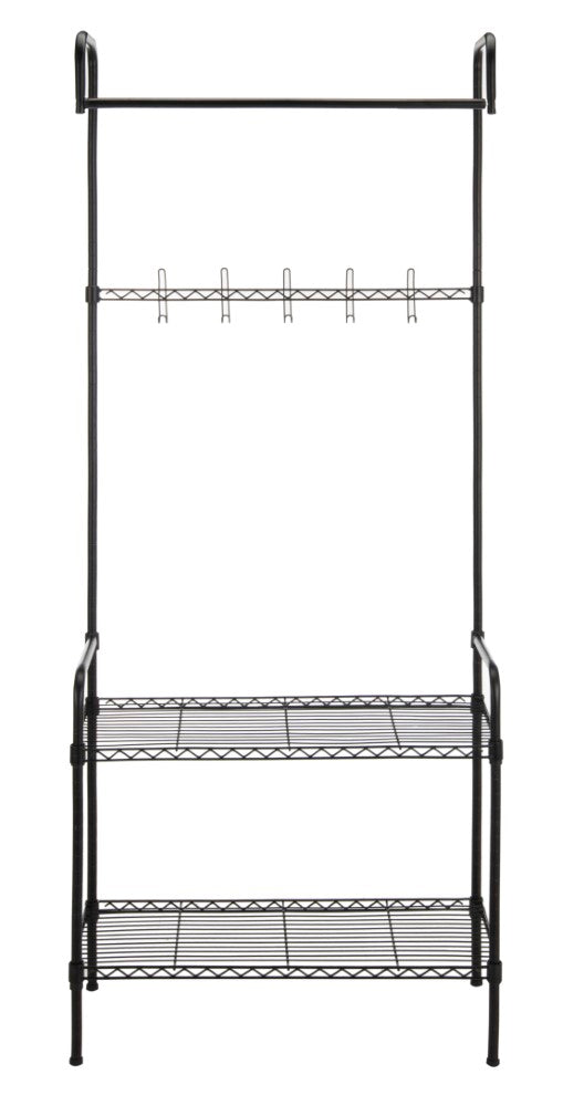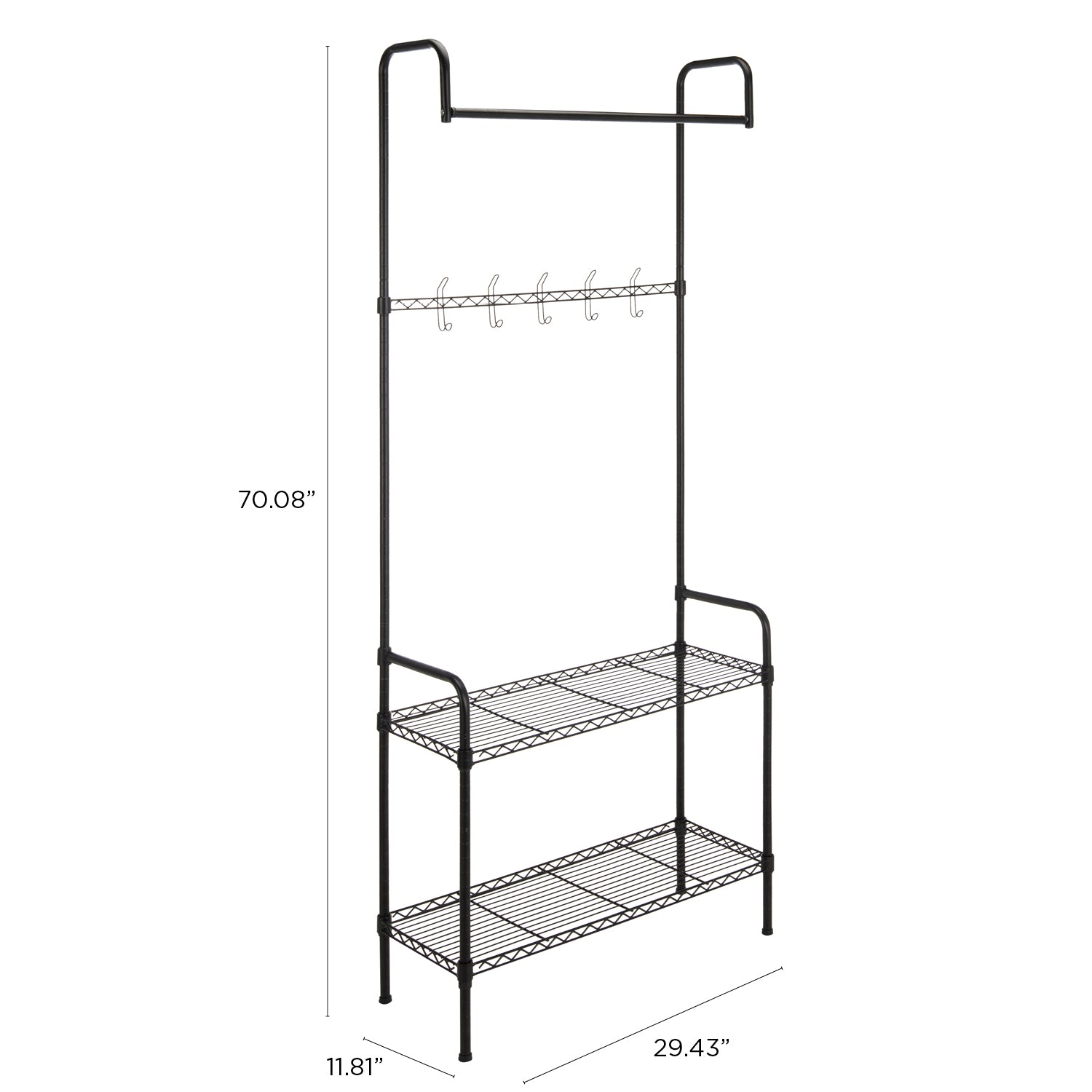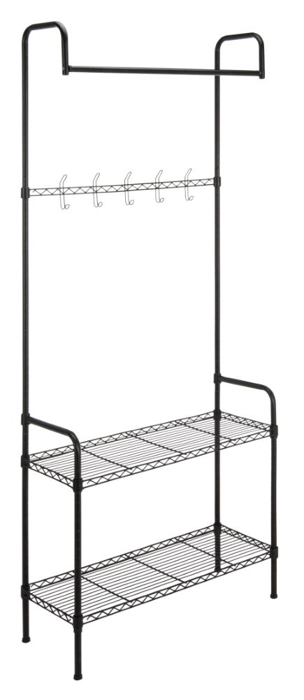 This tall stationary garment rack utilizes its height (nearly 72”) to allow for multi-functional wardrobe storage. A hanging bar arches over the unit to hold blouses or jackets while just behind, a row of hooks allows for hanging hats, umbrellas, leashes, or keys. The shelves at the bottom of the unit are spaced to allow ample height for winter boots and bags, so your wardrobe can expand without compressing your closet space.