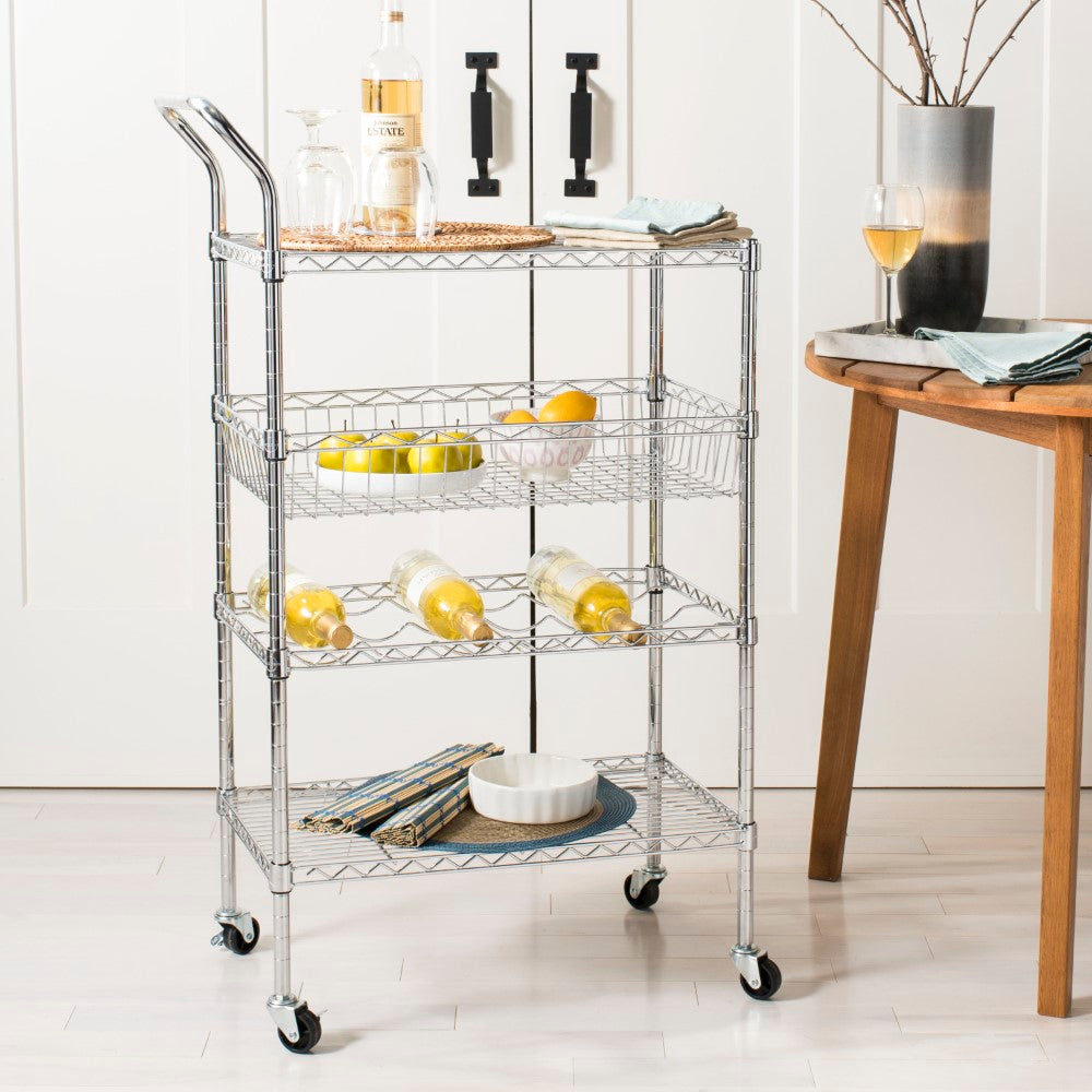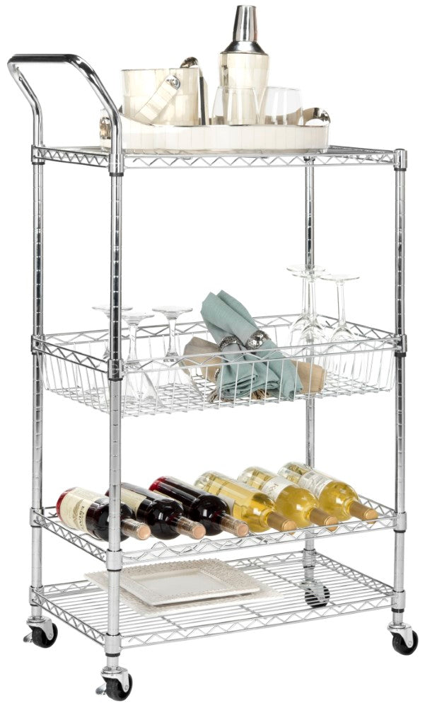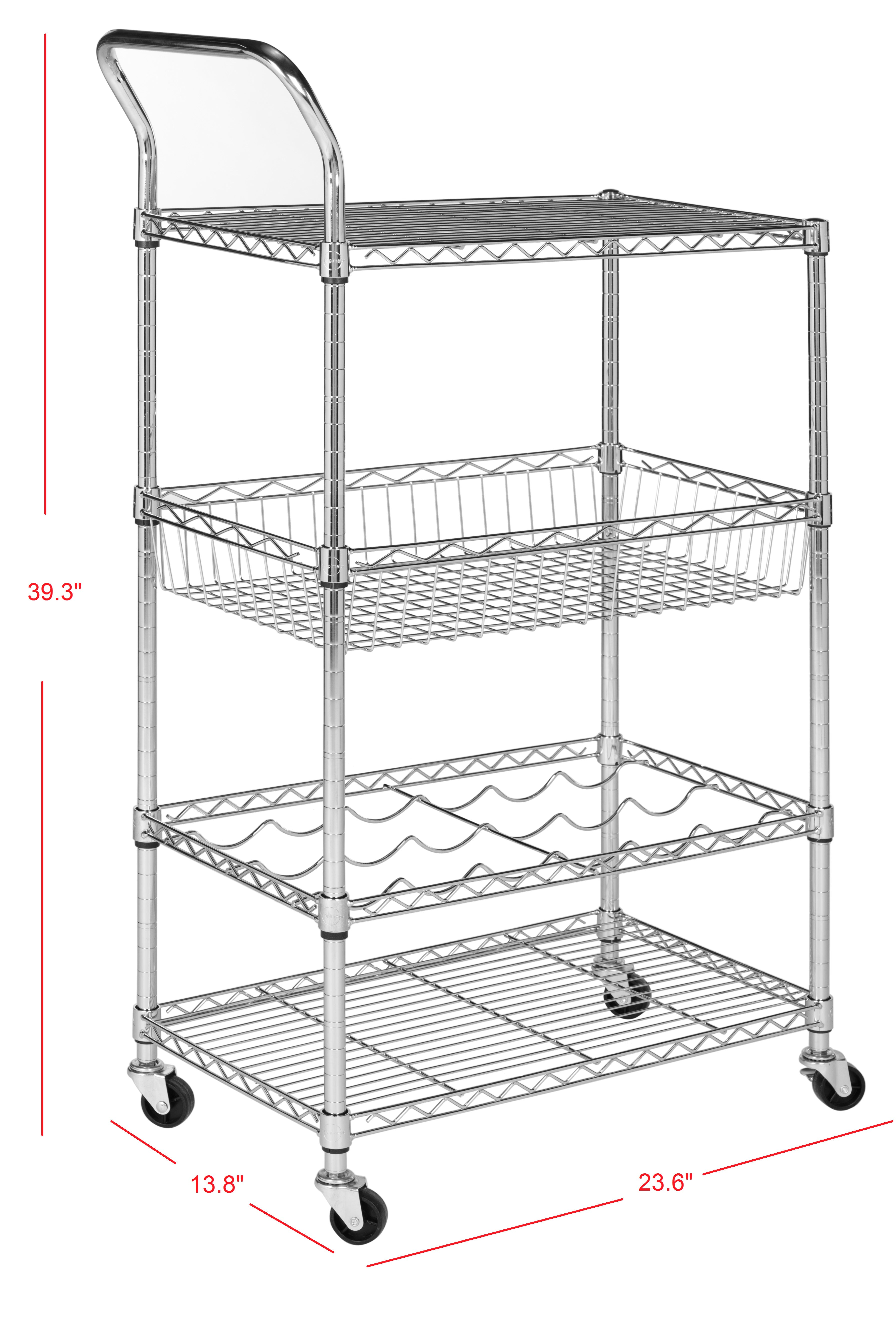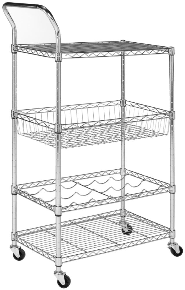 - Adjustable wire shelves include one with a 6-bottle wine storage capacity and a basket shelf for small accessories to stay secure while the cart is being moved