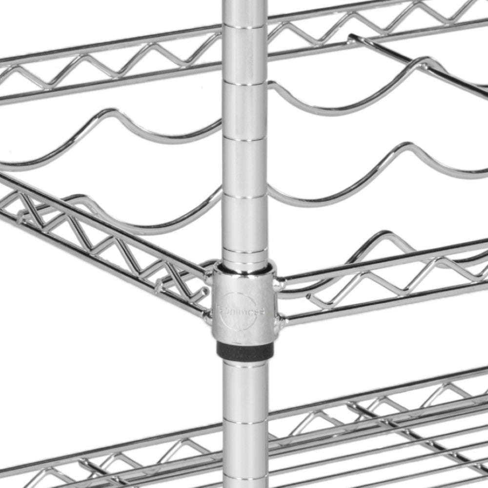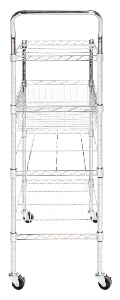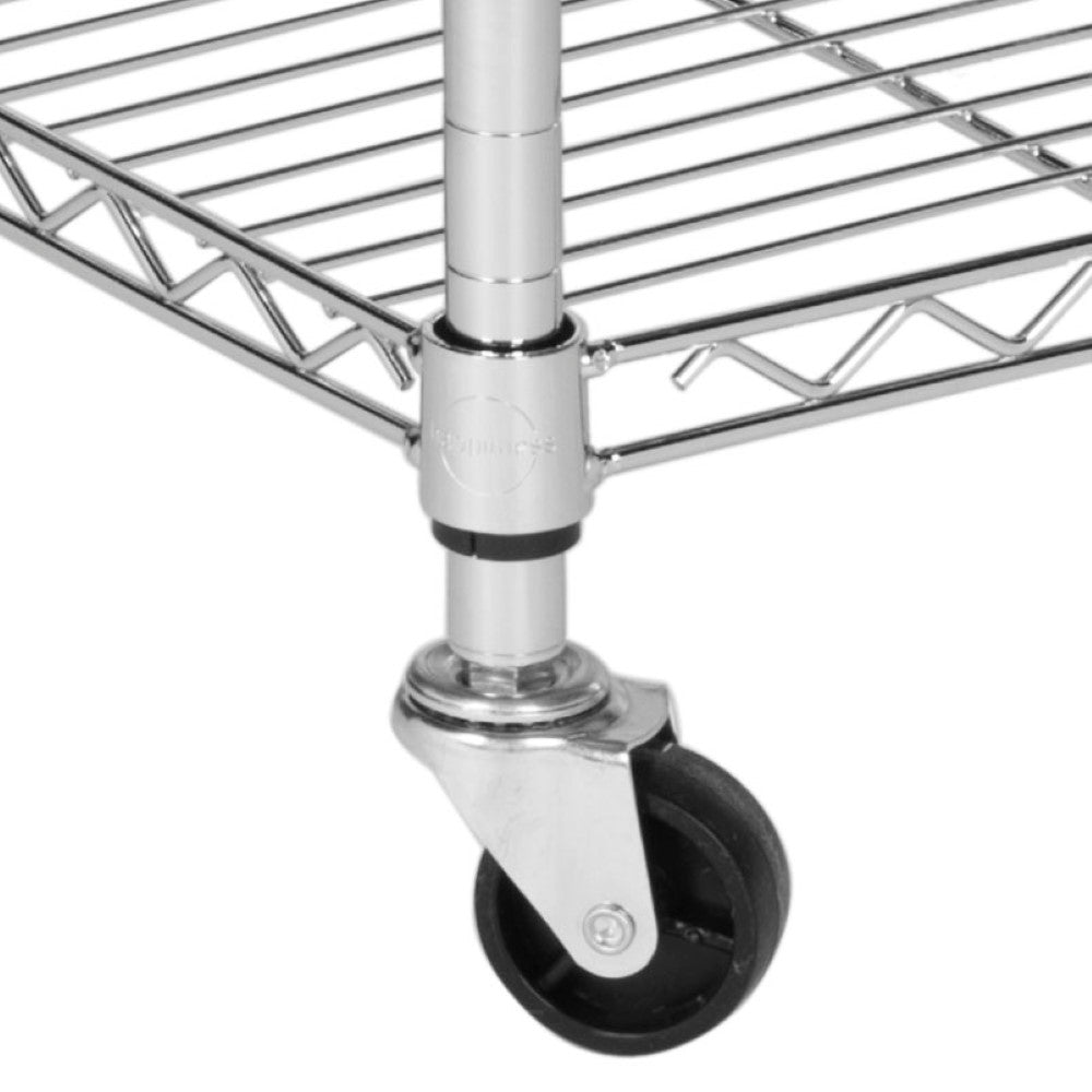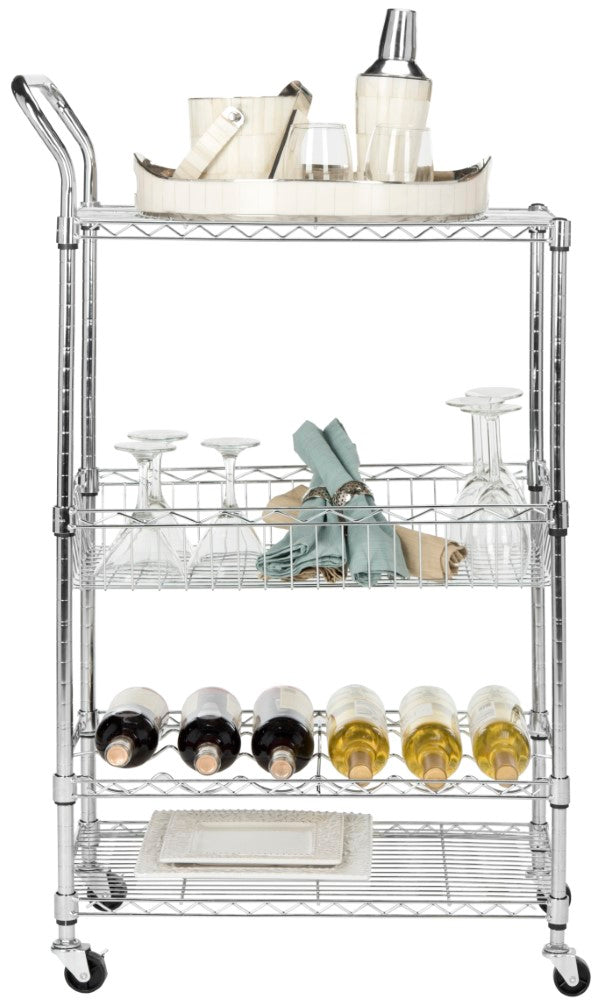 - Adjustable wire shelves include one with a 6-bottle wine storage capacity and a basket shelf for small accessories to stay secure while the cart is being moved