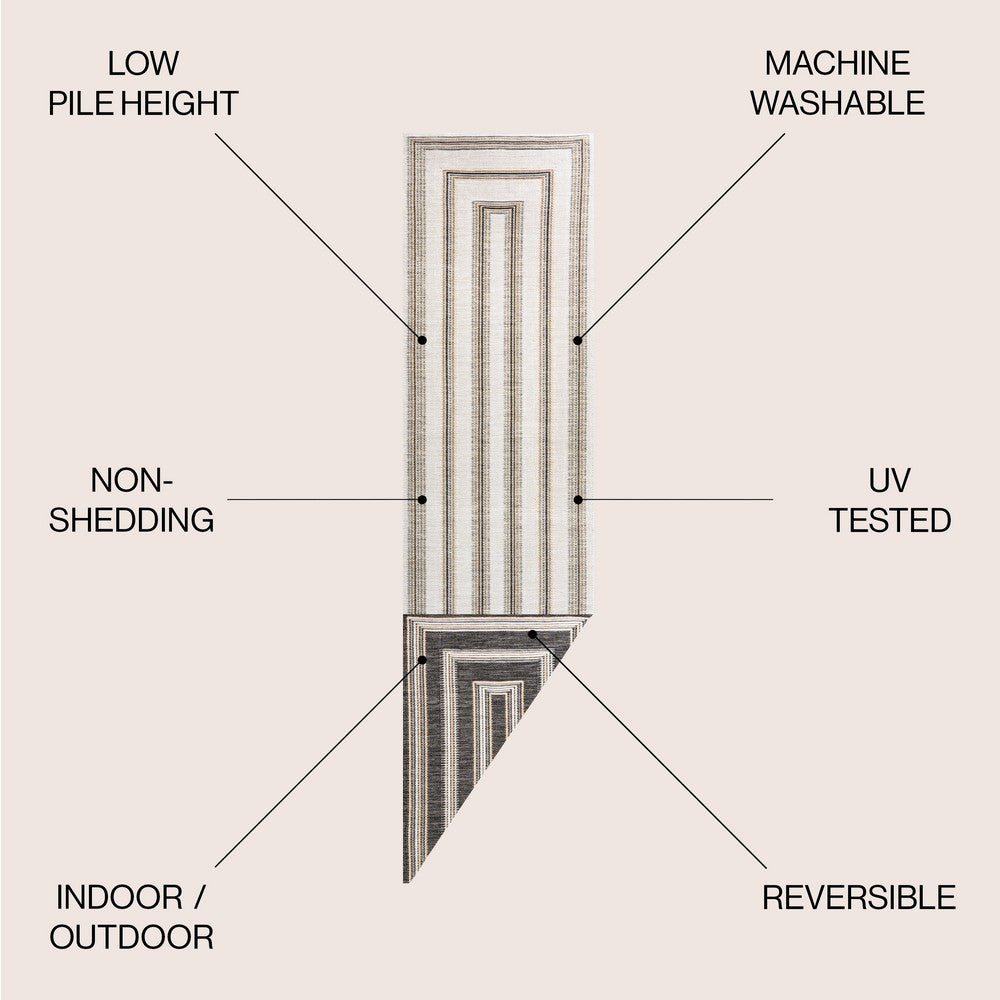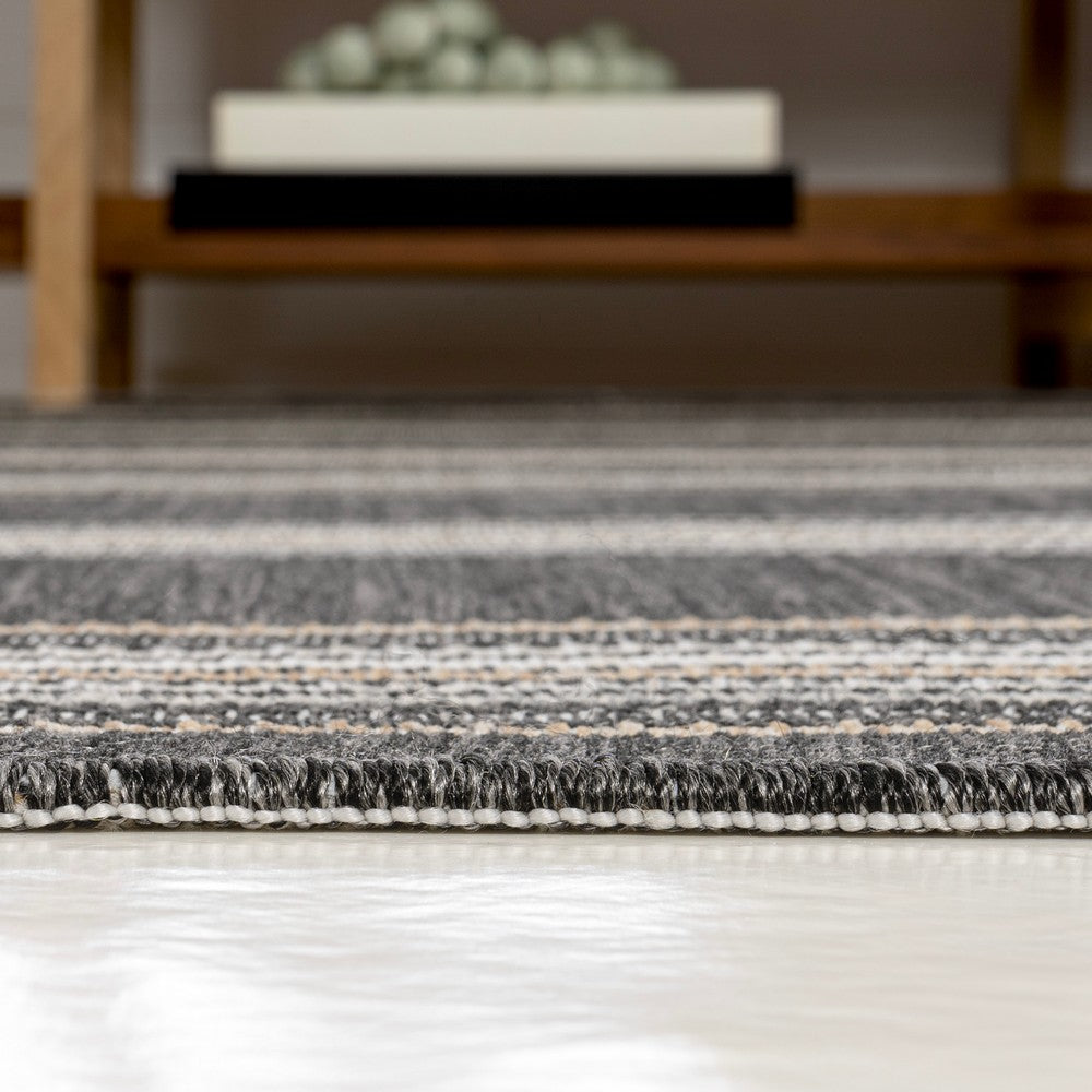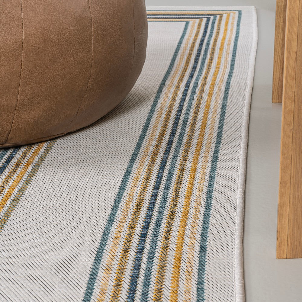Inspired by nautical stripes, this classic rug features a ticking-style stripe with mitred corners. Mingled threads give this easy-care, reversible rug a coastal vibe. Durable enough for outdoors on a porch, or in the living room, entry, bedroom or dining room.