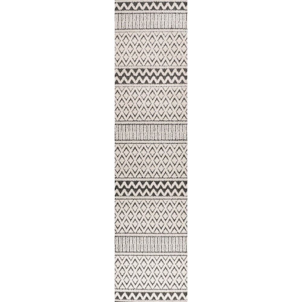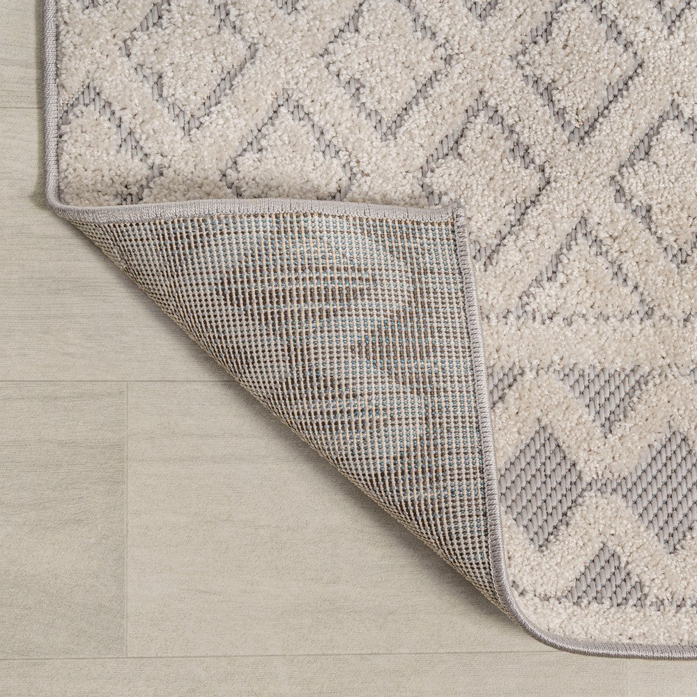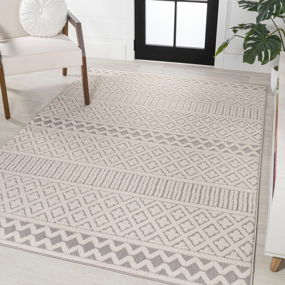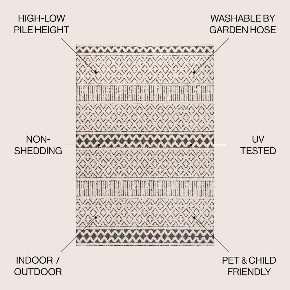 Inspired by Moroccan tribal designs, our modern geometric rug adds graphic punch to almost any space, indoors or out. The two-tone, family-friendly design is a smart addition to your living room, dining room, bedroom, porch or patio. Made from pet-friendly synthetic fibers, this rug is easy to clean.